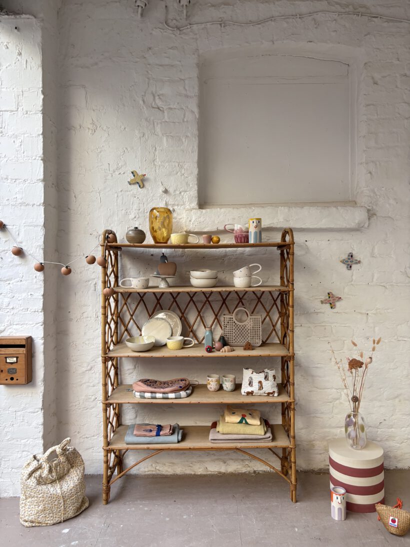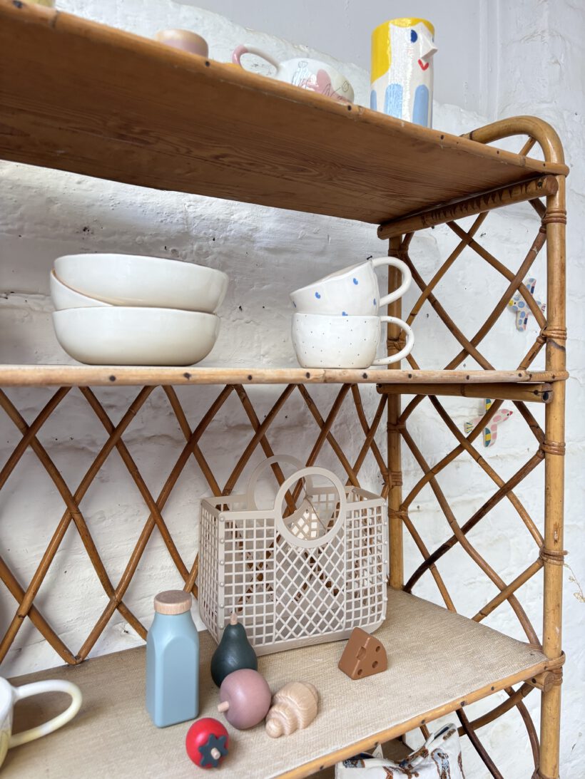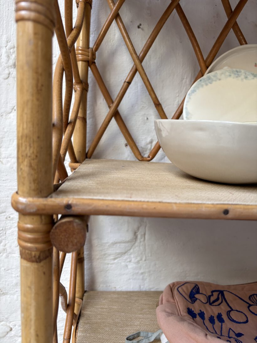 Mit viel Glück haben wie Hervé auf einem französischen Flohmarkt gefunden und wir sind überglücklich. Das Rattanregal stammt aus den 60 er Jahren und ist tatsächlich sehr gut erhalten. Bis auf ein paar kleine kaum sichtbare Spuren der Zeit (zum Beispiel links an der Seite am zweiten Regal fehlt ein kleines Stück Rattan – siehe Bild).