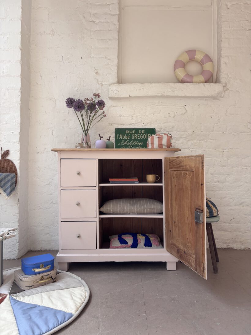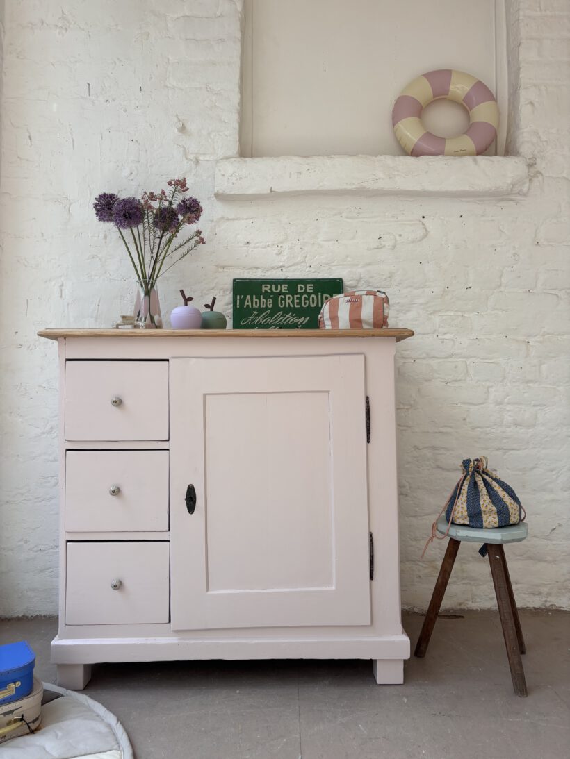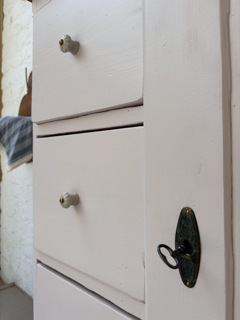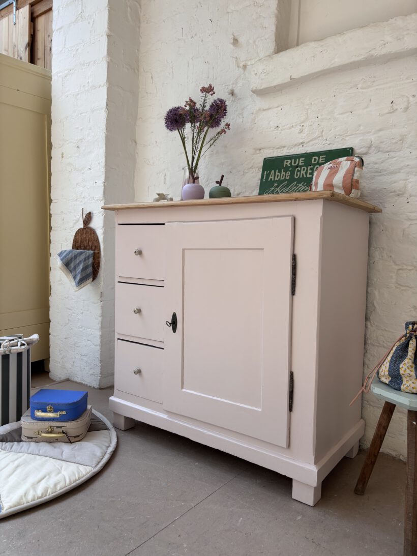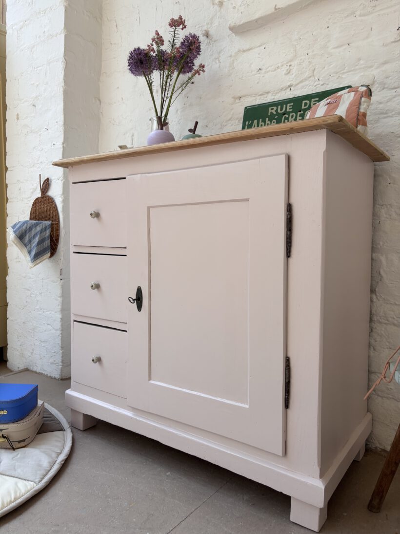 Hilma hat von uns ein rund um Wohlfühl-Paket bekommen: ihr Holz wurde geschliffen, ausgebessert, grundiert und lackiert in einem zarten rosa von Farrow and Ball. Sie hat neue Keramikknöpfe von uns bekommen und auch innen haben wir die Böden lackiert. Die obere Platte haben wir ausgebessert, geschliffen und gewachst in Natur belassen. einfach wunderschön!