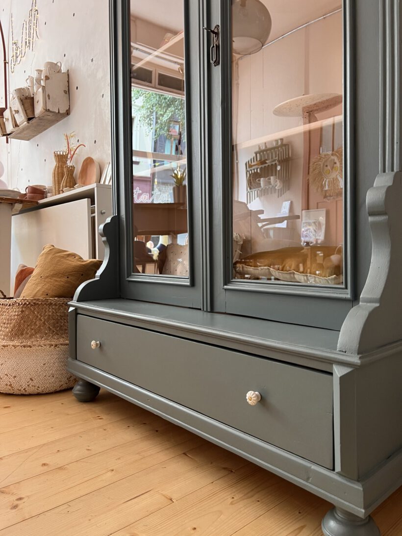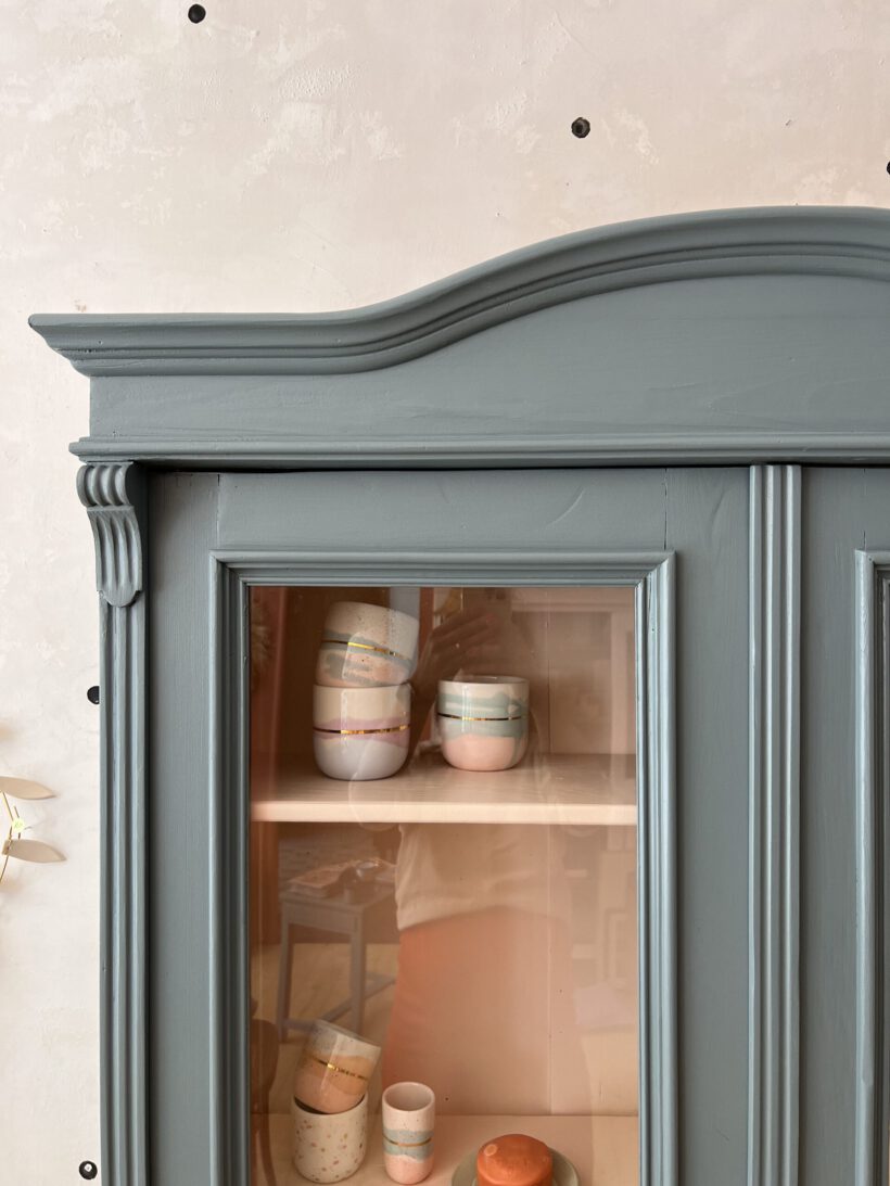Hilma hat ein sehr ungewöhnliches und besonderes Design. Sie ist so schmal mit ihren nur 26 cm Tiefe, dass sie als Schrank in den kleinsten Räumen wunderschön aussieht und kaum Raum einnimmt. Der kleine tiefere Absatz unten mit Schublade ist sehr charmant. Und wir lieben die Farbkombi zwischen dem entspannten blaugrau außen und dem rosa apricot innen. Beide färben sind von Farrow and Ball.