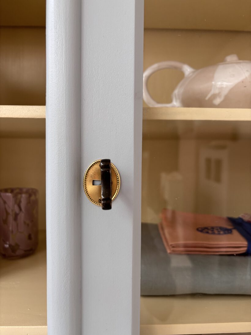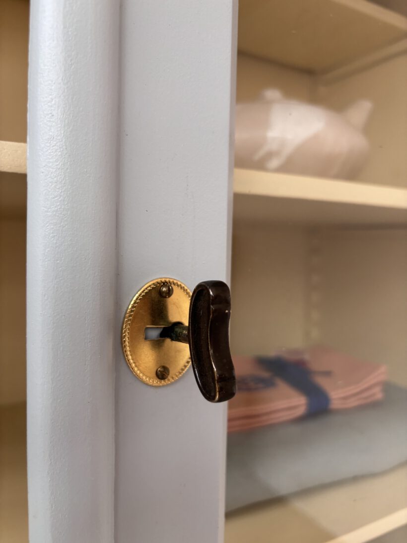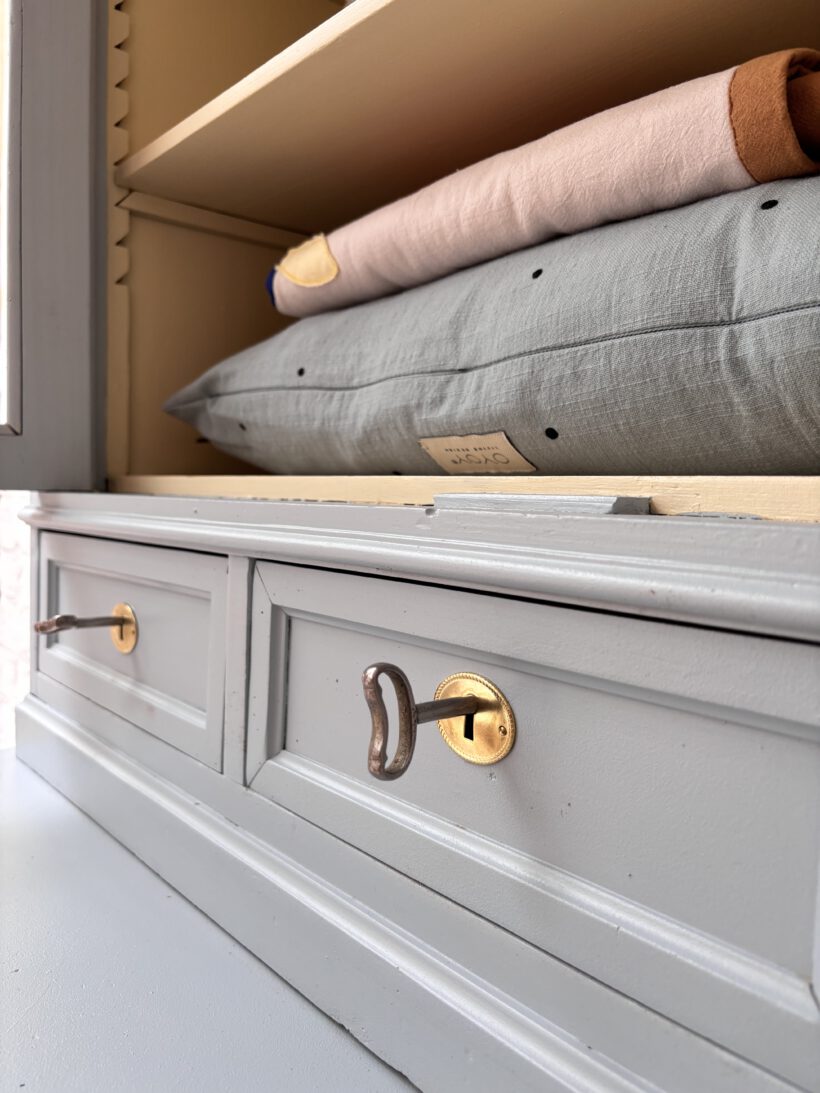 Hubert hat eine Menge Liebe von uns bekommen, seine Restaurierung war aufwendig und hat sich definitiv gelohnt. Er wurde repariert, geschliffen, grundiert und zwei mal außen und innen lackiert. Er hat teilweise neue goldene Beschläge passend zum Pastelgelb innen. Auch die Schubladenknöpfe der großen Schublade sind neu. Die Beschläge an den Türen mussten wir umfunktionieren und hochkant legen, damit alles zusammenpasst – ein charmantes Detail;-) Dadurch sitzt der Schlüssel an den Türen jeweils fest. Es sind insgesamt 5 Schlüssel erhalten: je einer für die Türen und je einer für die kleinen Schubladen.