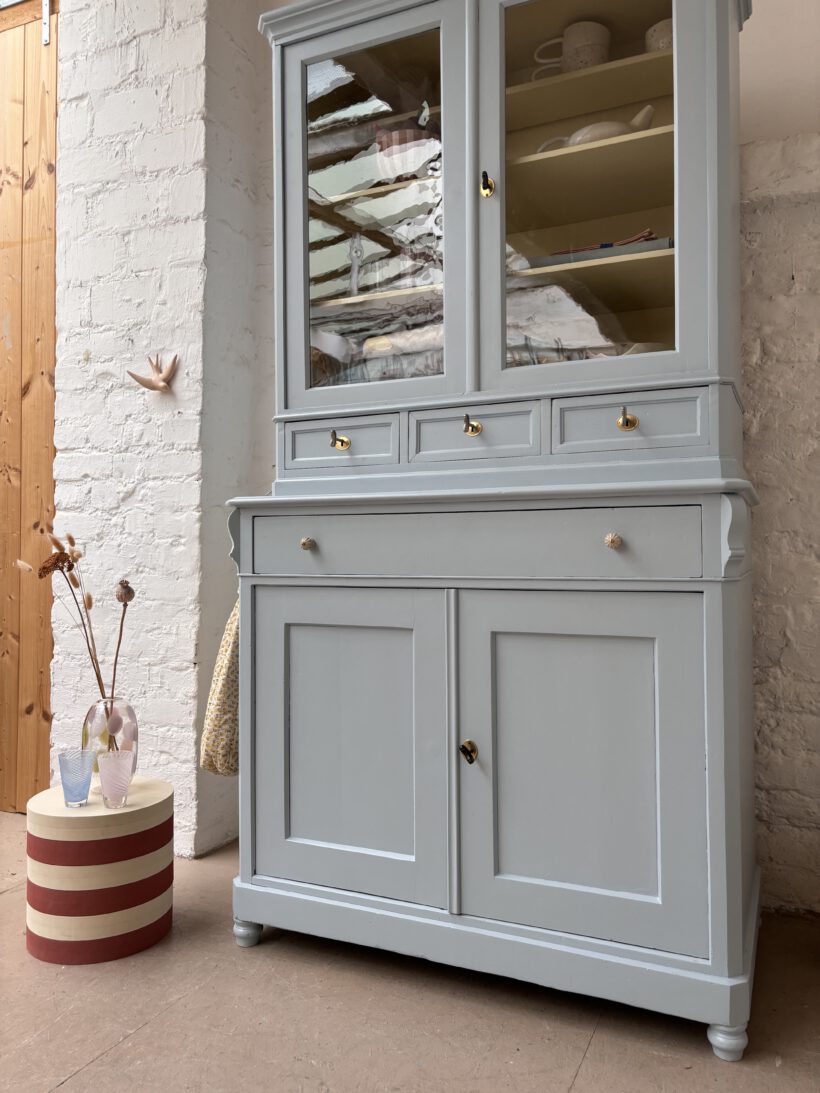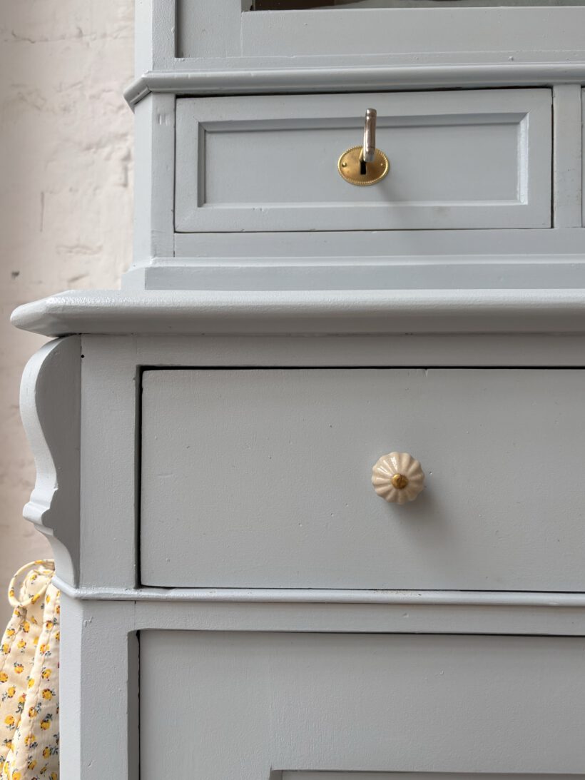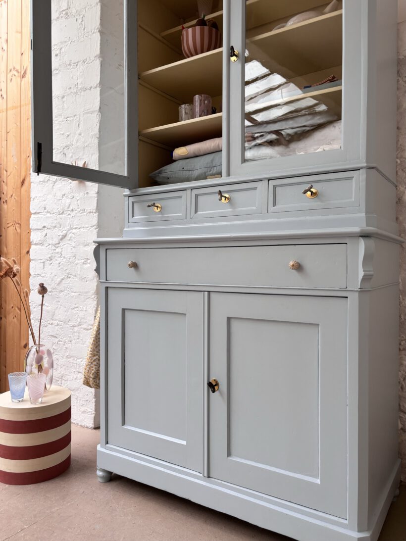 Wir haben Hubert zweifarbig aufbereitet außen in einem blaugrau innen in einem Pastelgelb. Die Farbkombi schenkt ihm etwas modernes und poppiges. Außerdem sprüht er vor Charme. Im Vitrinenteil hat er zwei große Böden und oben einen halben kleinen für Tassen – einfach toll. Die Böden sind versetzbar nach Wunsch und nach antikem Regalsystem.