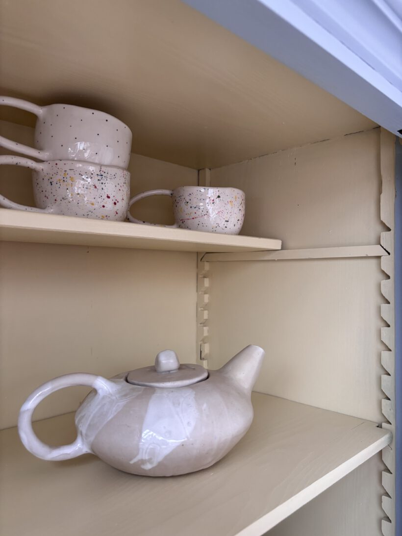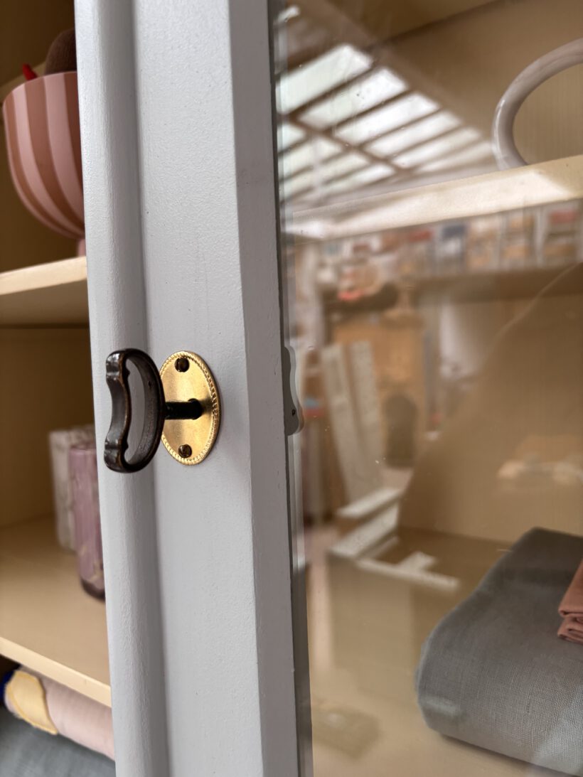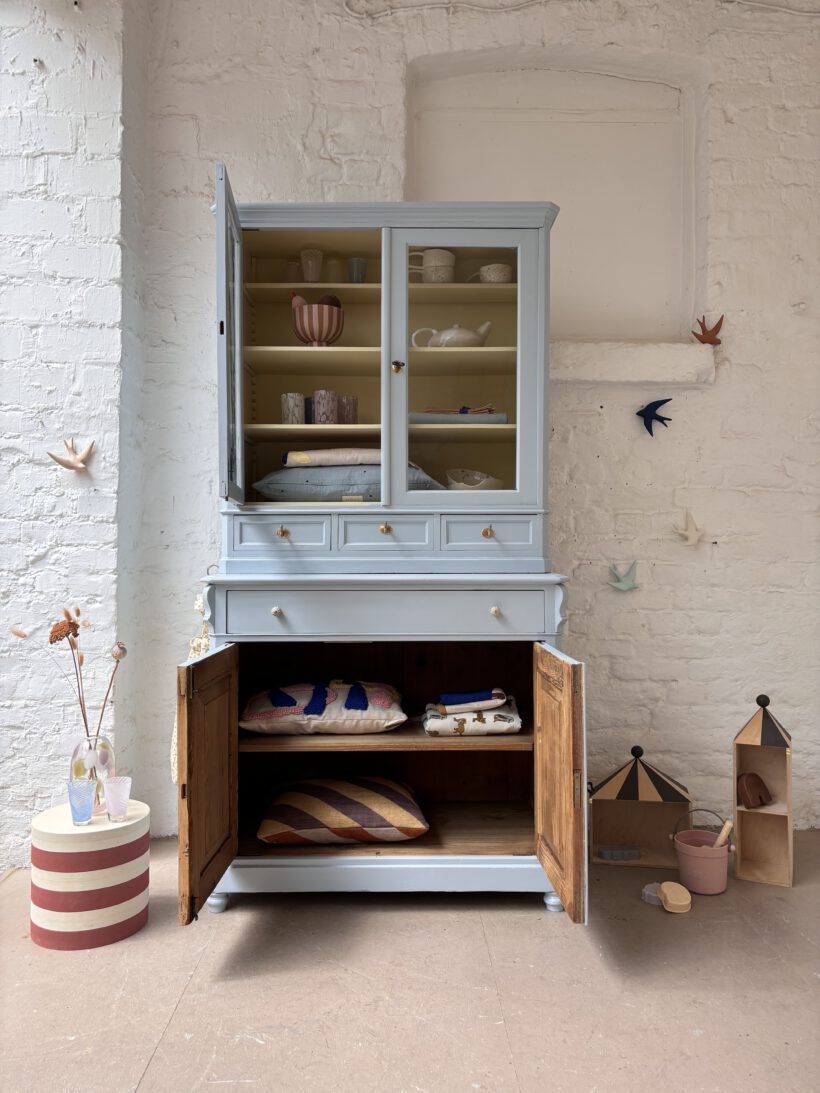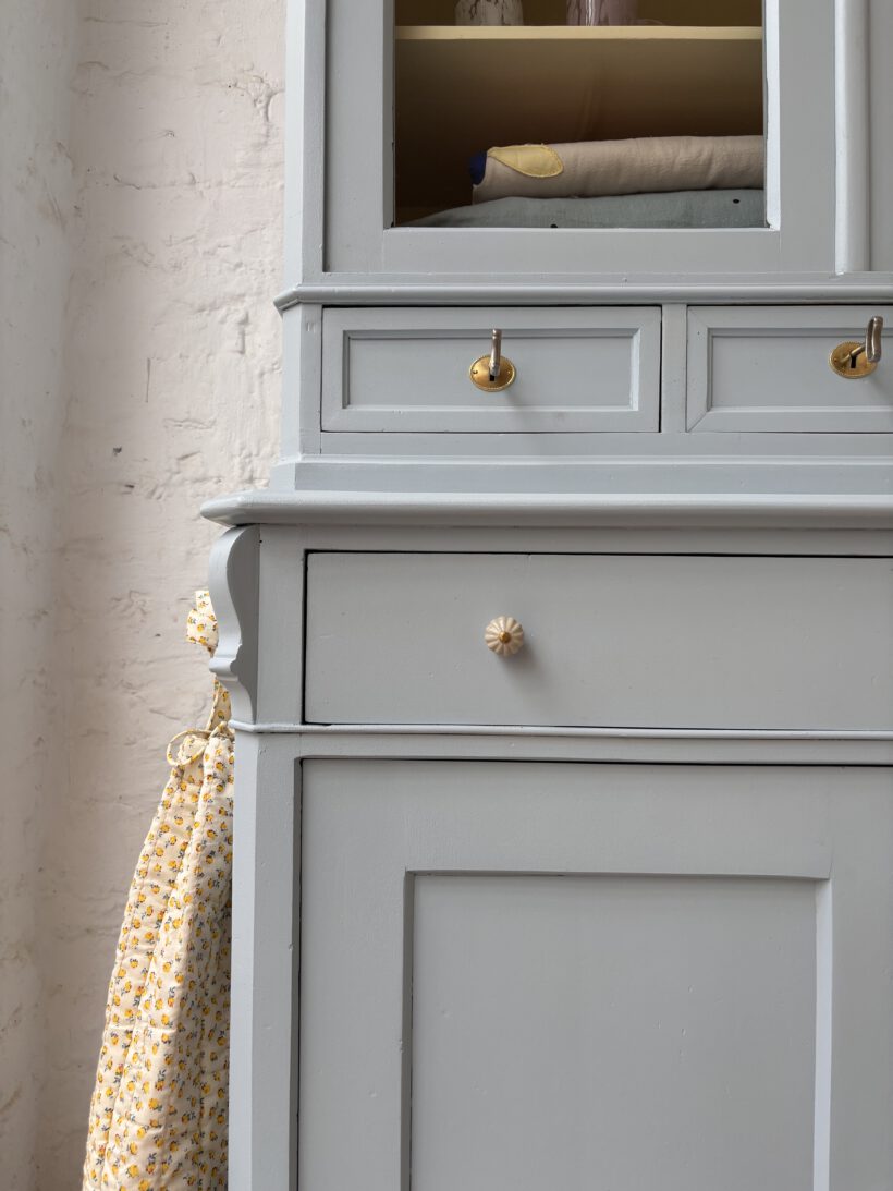 Wir haben Hubert zweifarbig aufbereitet außen in einem blaugrau innen in einem Pastelgelb. Die Farbkombi schenkt ihm etwas modernes und poppiges. Außerdem sprüht er vor Charme. Im Vitrinenteil hat er zwei große Böden und oben einen halben kleinen für Tassen – einfach toll. Die Böden sind versetzbar nach Wunsch und nach antikem Regalsystem.