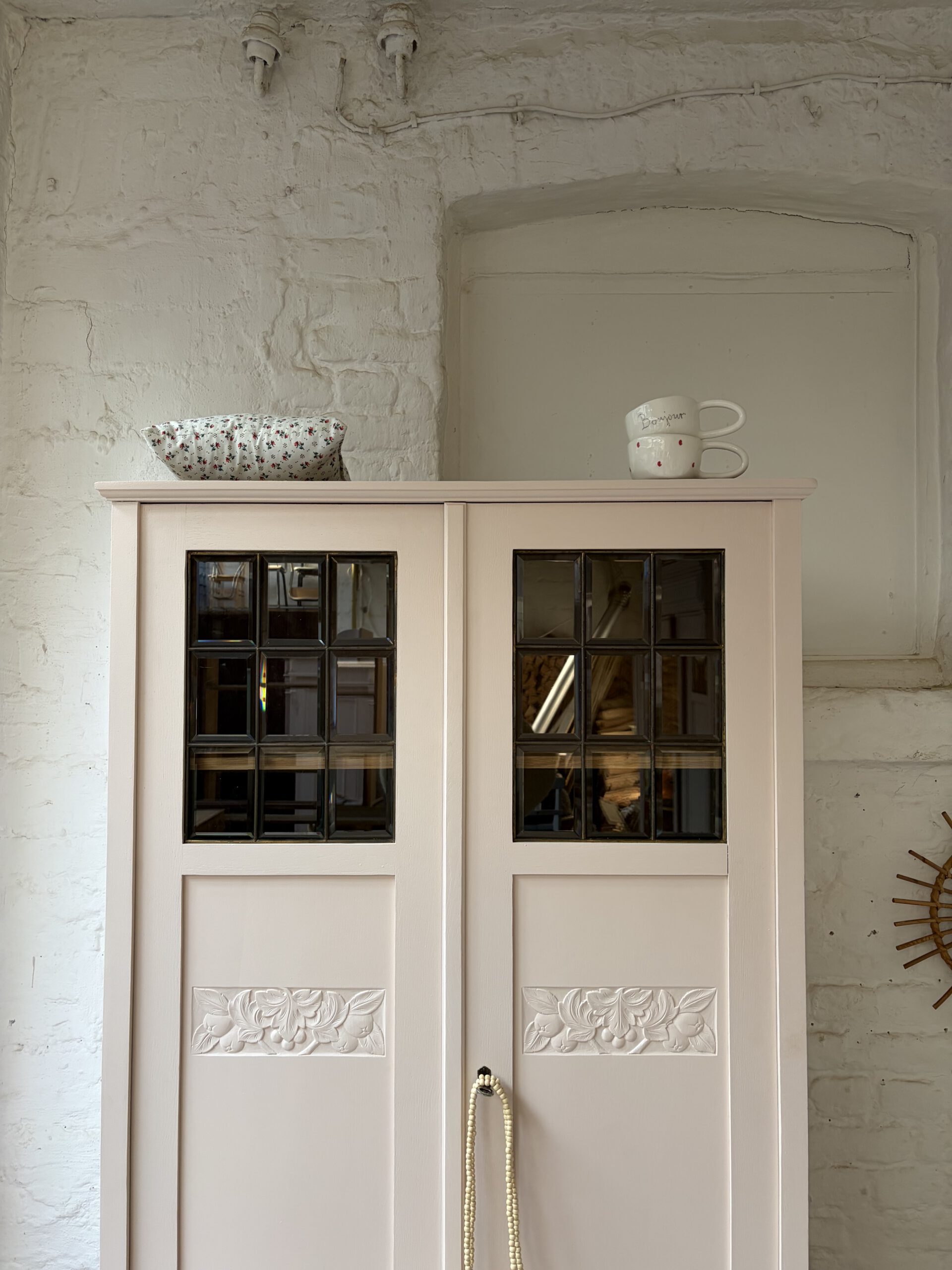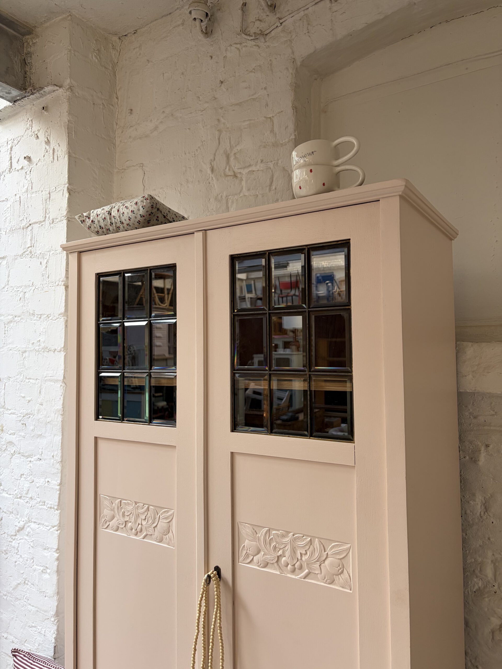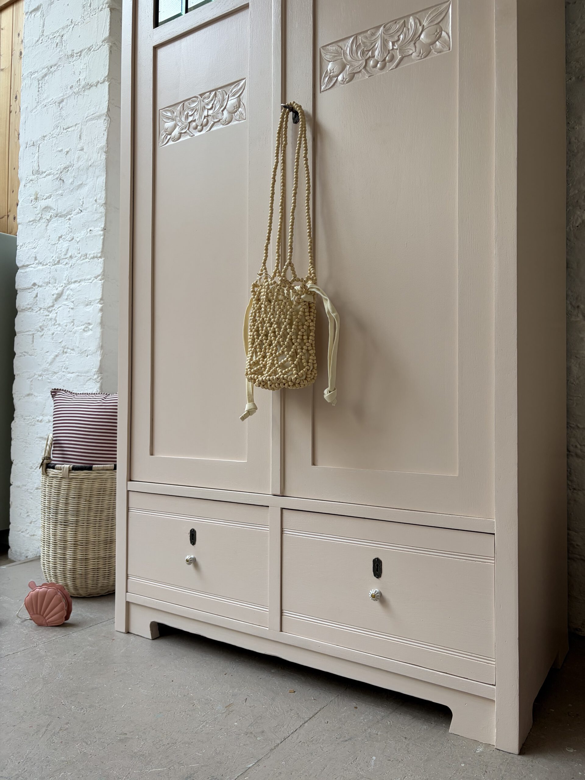 Inga trägt ein wunderschönes rosa von Farrow and Ball. Dafür wurde ihr Holz geschliffen, grundiert und drei Mal lackiert.