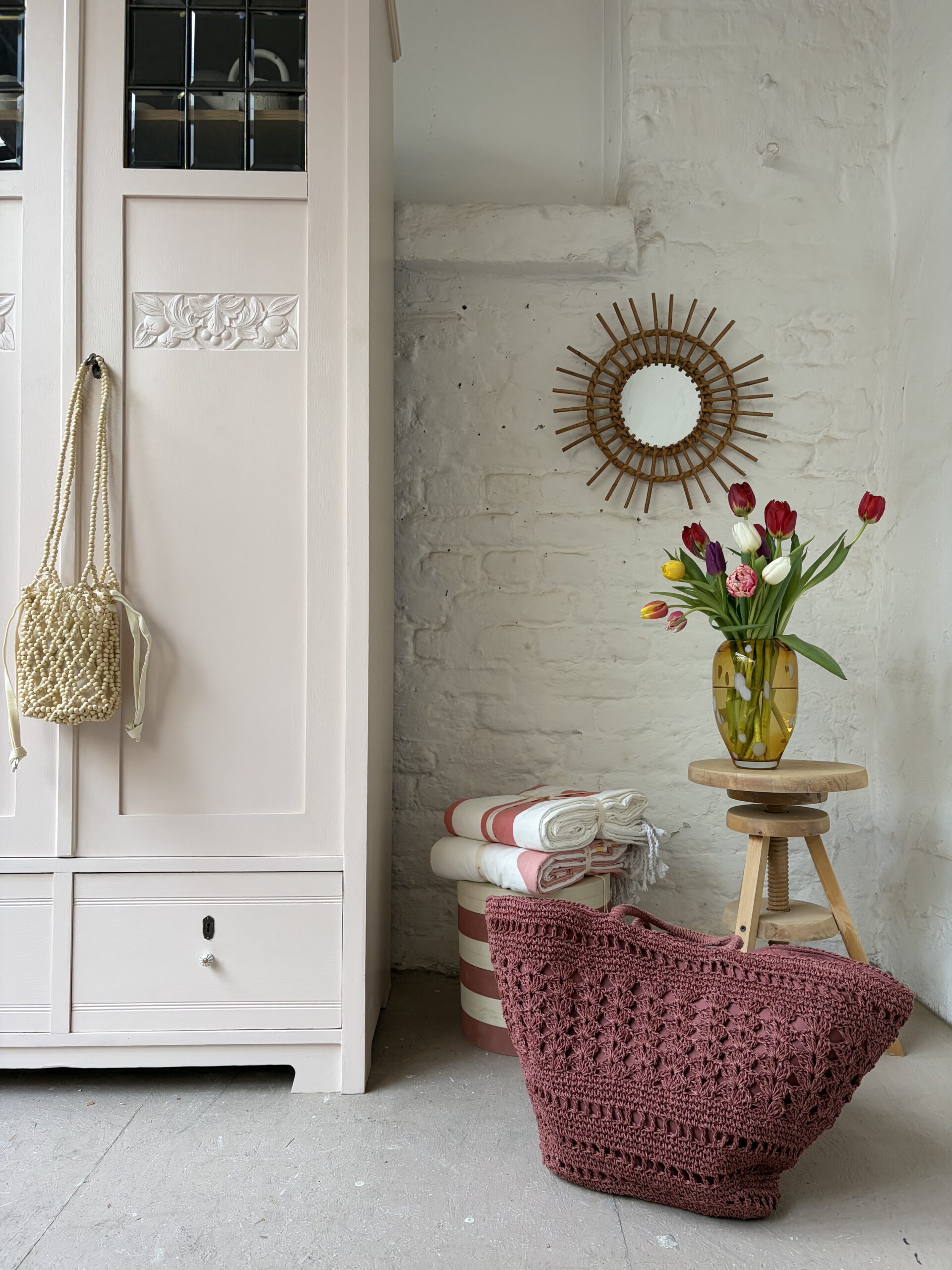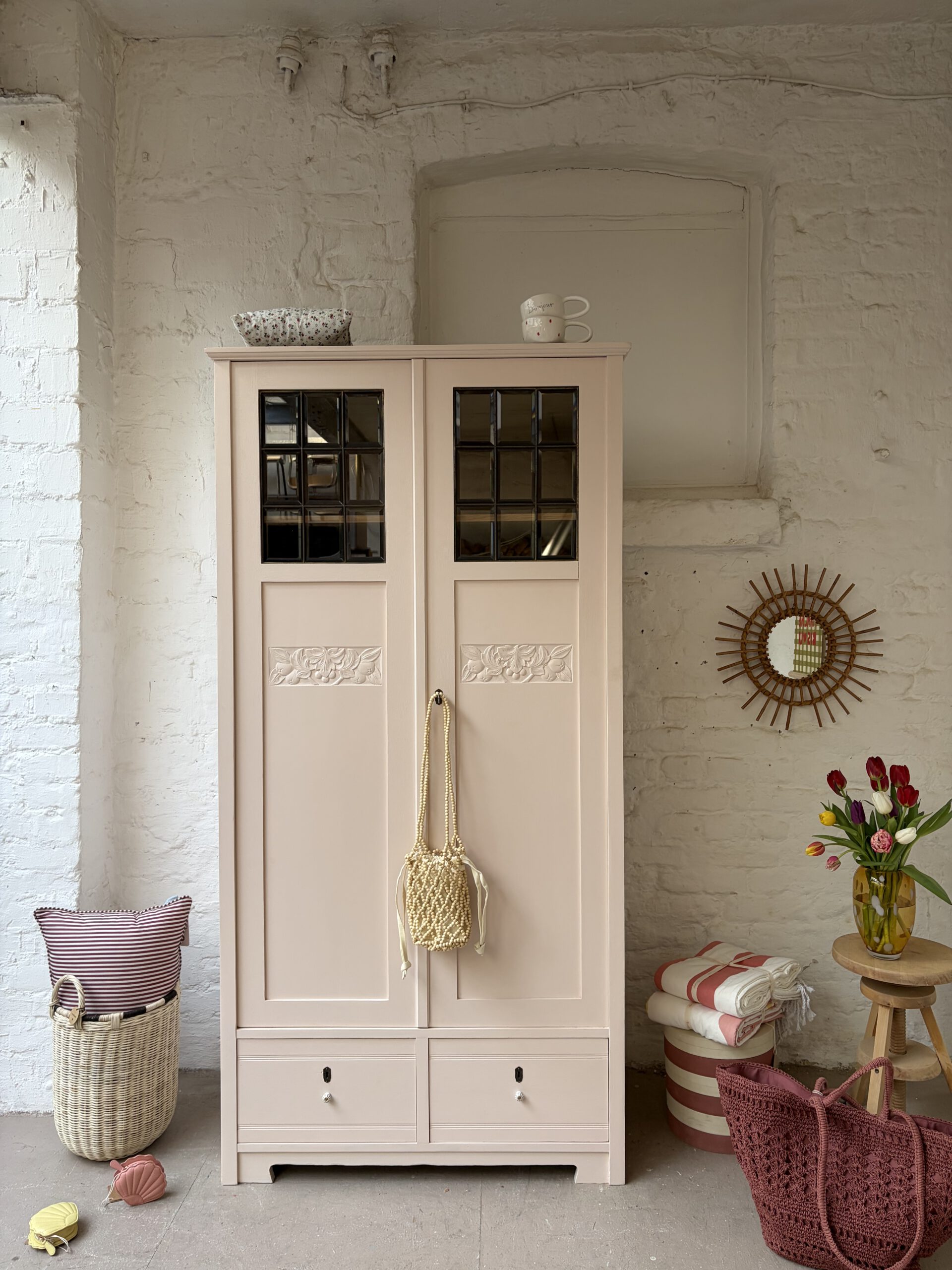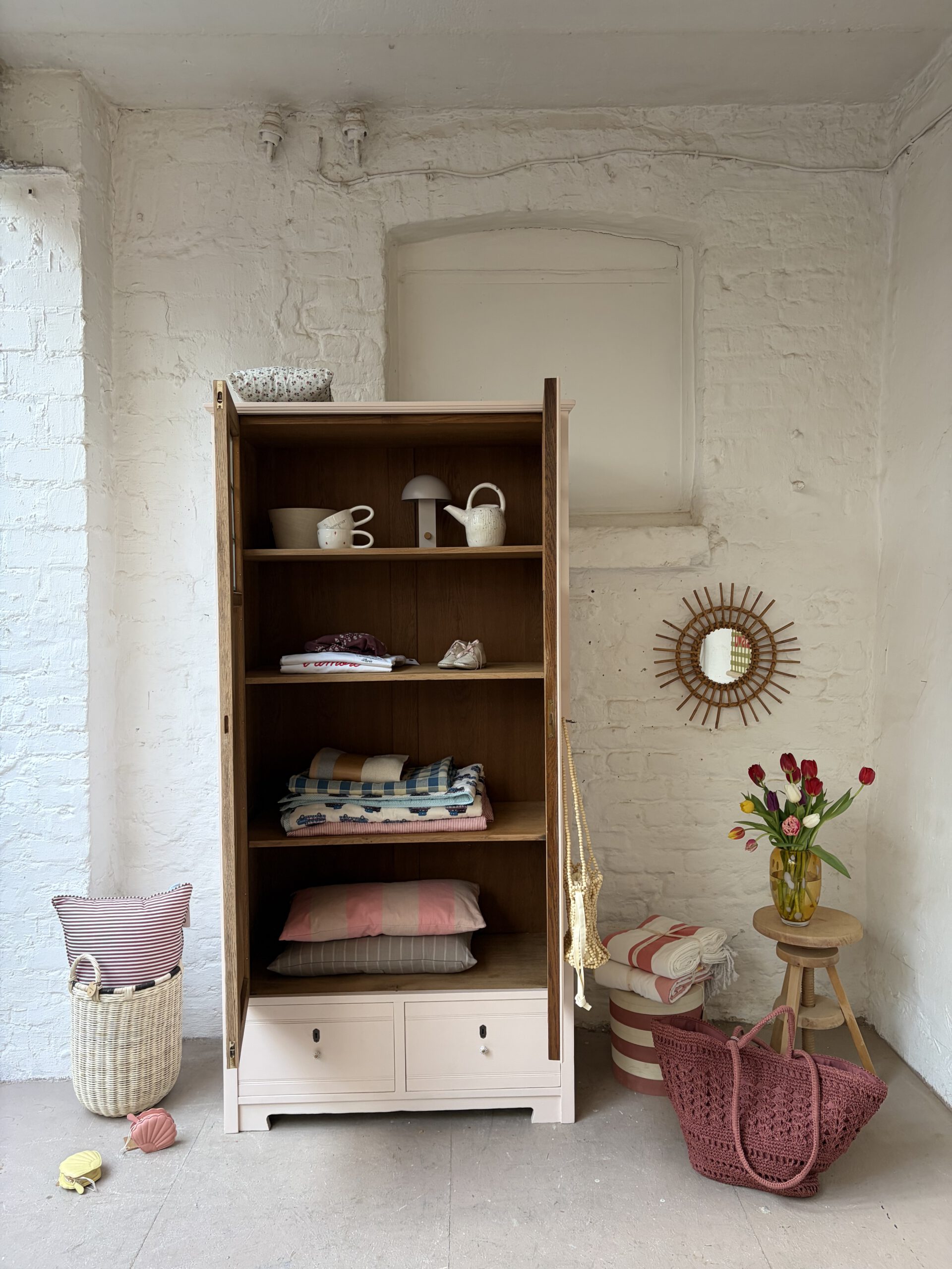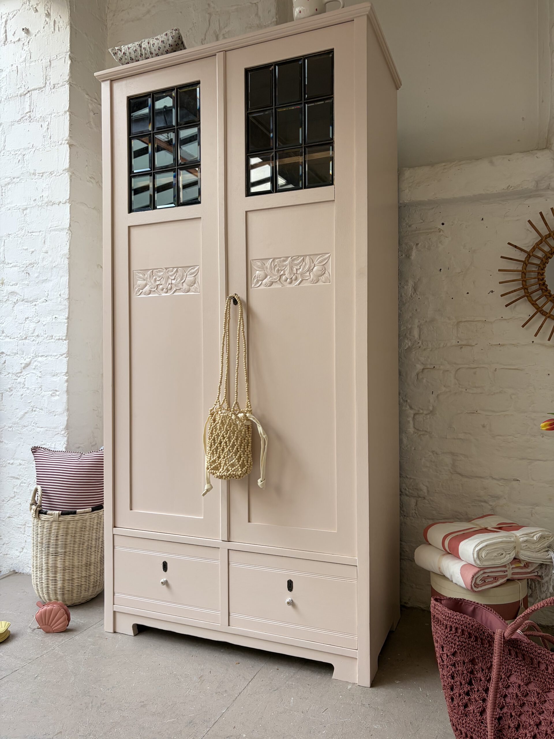 Inga trägt ein wunderschönes rosa von Farrow and Ball. Dafür wurde ihr Holz geschliffen, grundiert und drei Mal lackiert.