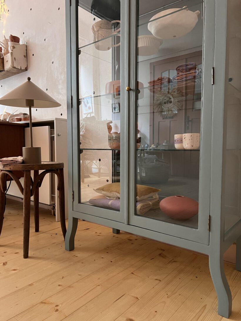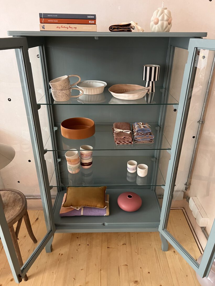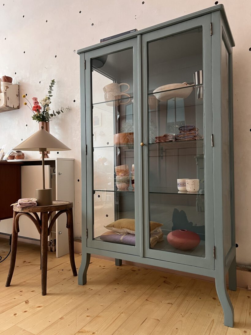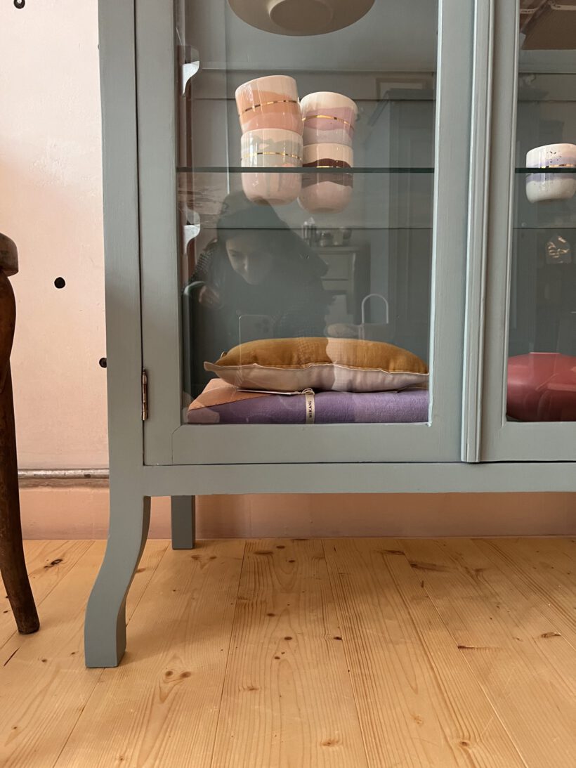 Irma brauchte viel Liebe von uns und die hat sie auch bekommen. Wir haben Sie komplett neu verglast, auch die Böden sind neu und das Glas geschliffen. Außerdem hat sie bei uns die alten Farbschichten ablegen können, denn diese lagen ihr schwer auf dem Magen. Sie wurde geschliffen, grundiert und zwei Mal lackiert. Irma trägt jetzt unser Lieblingsblau von Farrow and Ball und einen neuen alten Messingknöpf. Wir lieben die Kombi. Und überhaupt sind wir absolut verliebt! Was ein besonderes Möbel!