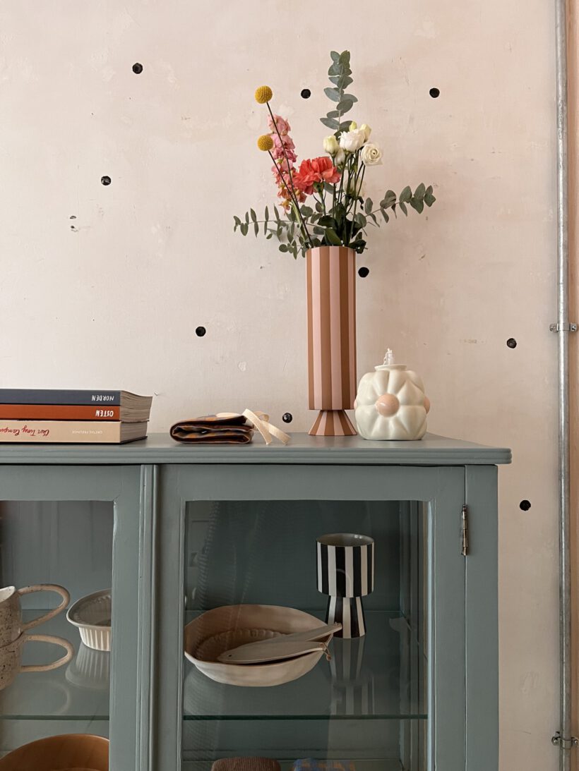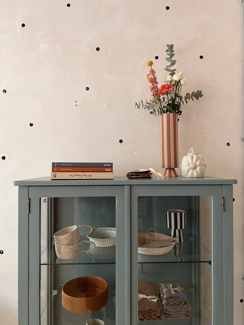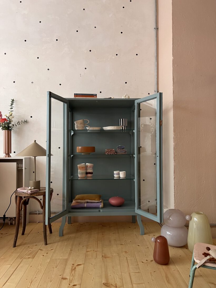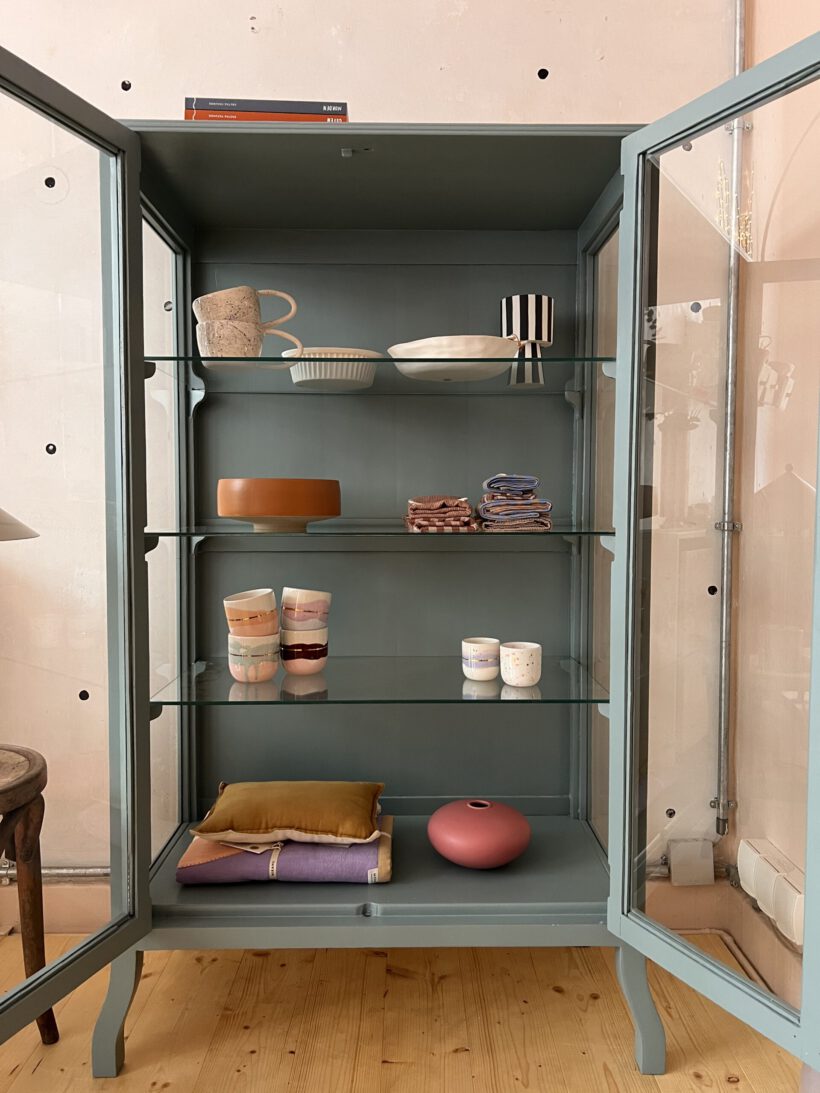 Irma brauchte viel Liebe von uns und die hat sie auch bekommen. Wir haben Sie komplett neu verglast, auch die Böden sind neu und das Glas geschliffen. Außerdem hat sie bei uns die alten Farbschichten ablegen können, denn diese lagen ihr schwer auf dem Magen. Sie wurde geschliffen, grundiert und zwei Mal lackiert. Irma trägt jetzt unser Lieblingsblau von Farrow and Ball und einen neuen alten Messingknöpf. Wir lieben die Kombi. Und überhaupt sind wir absolut verliebt! Was ein besonderes Möbel!