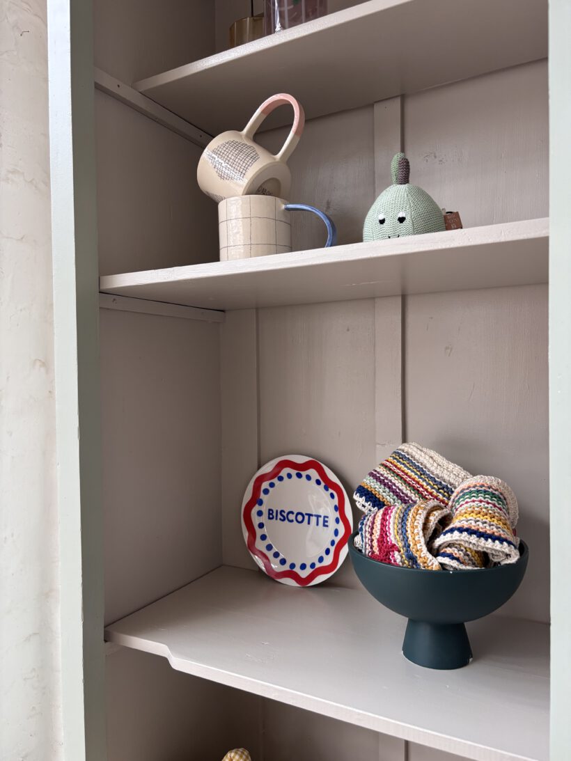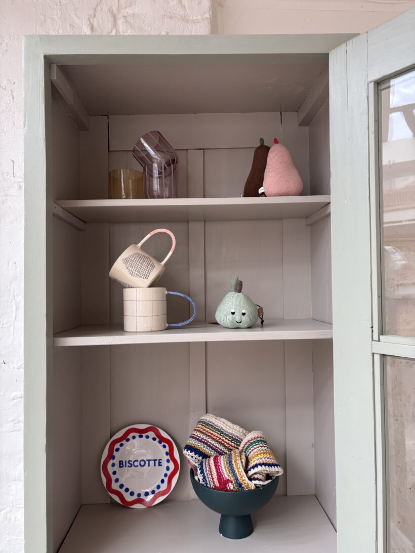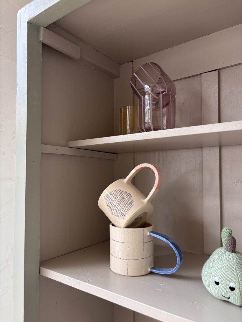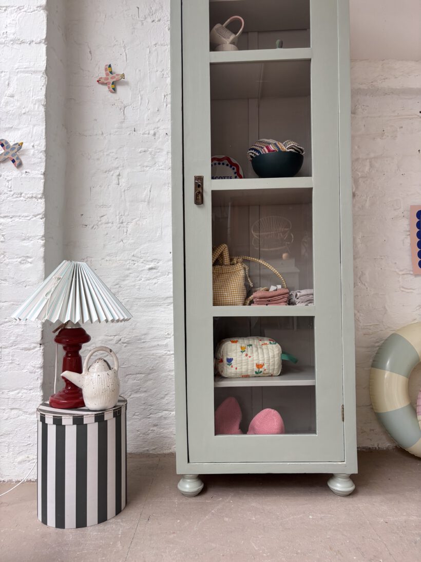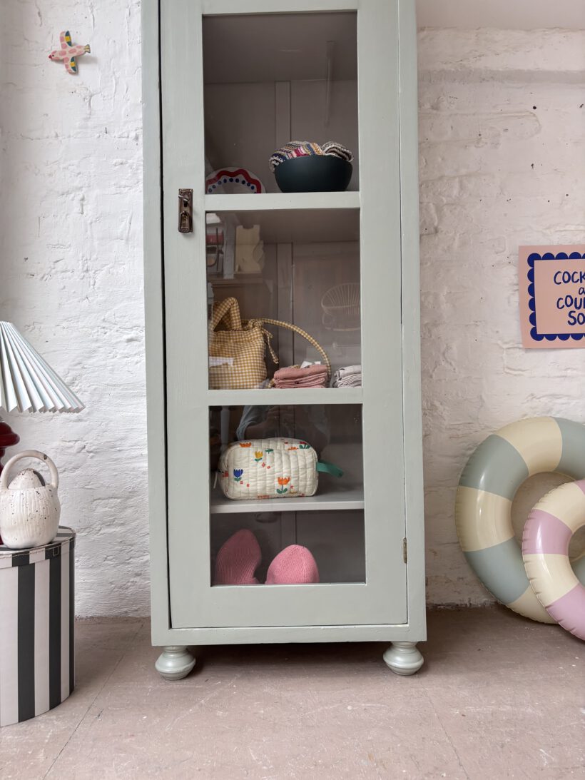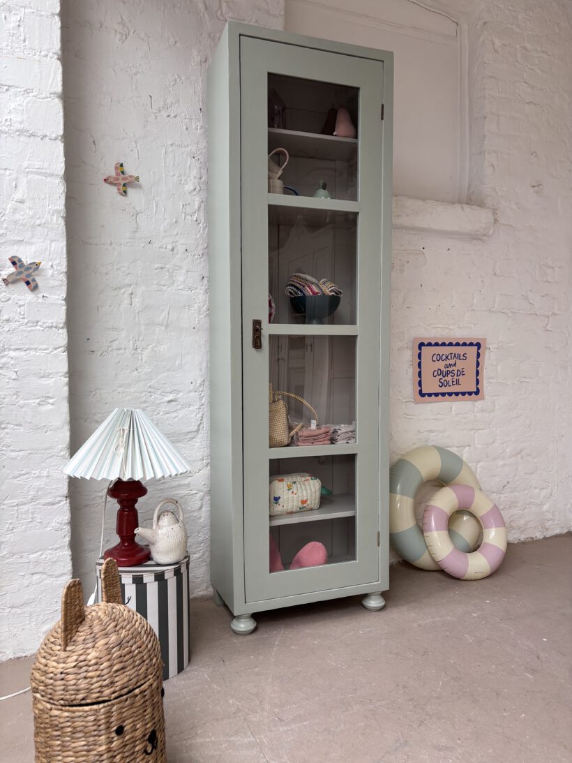 Wir haben ihn restauriert und zweifarbig aufbereitet. Außen in einem Salbeiton und innen in einem Grau von Farrow and Ball – ein zarter und schöner Kontrast. Er wurde geschliffen, ausgebessert, er hat neue Füße bekommen und er wurde einmal grundiert und zwei Mal lackiert.