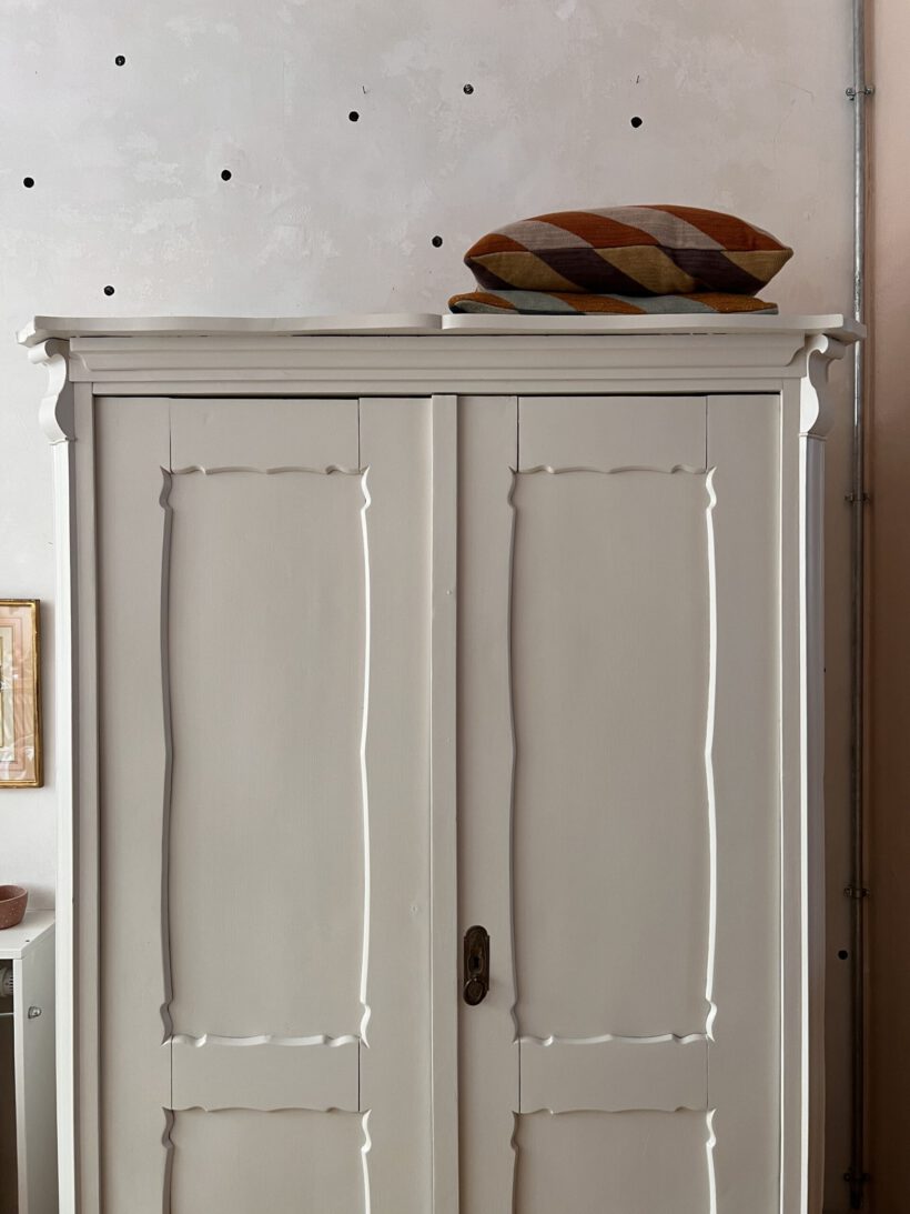 Johánna wurde von uns restauriert, geschliffen und grundiert, sowie zwei Mal lackiert in einem hellen Cremegrau von Farrow and Ball.