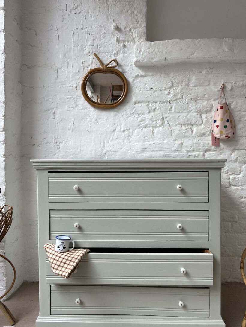 Jolie hat von uns ein schönes mint von Farrow and Ball bekommen. Dafür wurde ihr Holz komplett geschliffen, grundiert und zwei Mal lackiert.