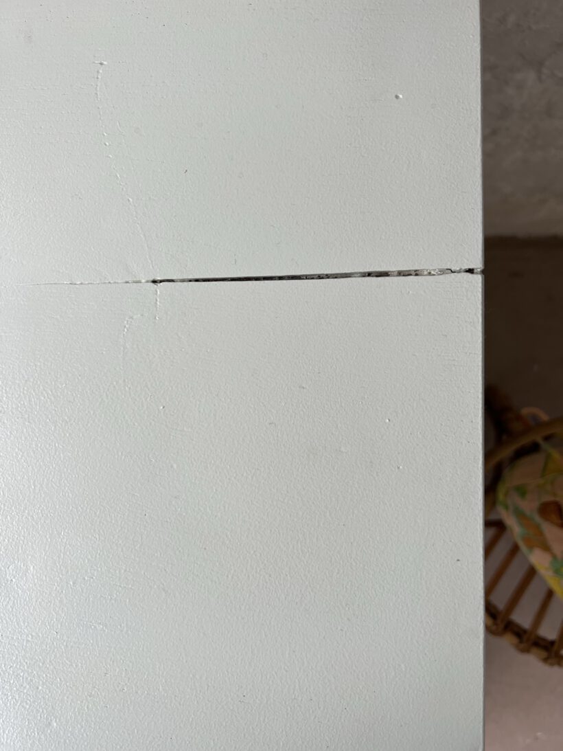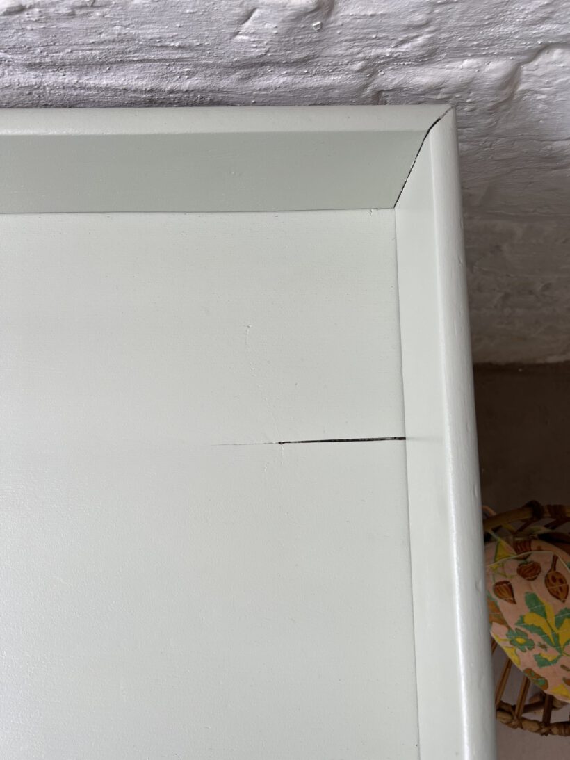Auf der Holzplatte ist hinten rechts ein kleiner Spalt, der sich im Laufe der Jahre gebildet hat: Ein charmanter Zeitzeuge;)