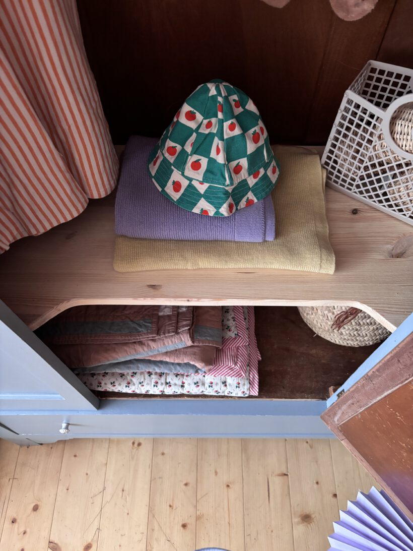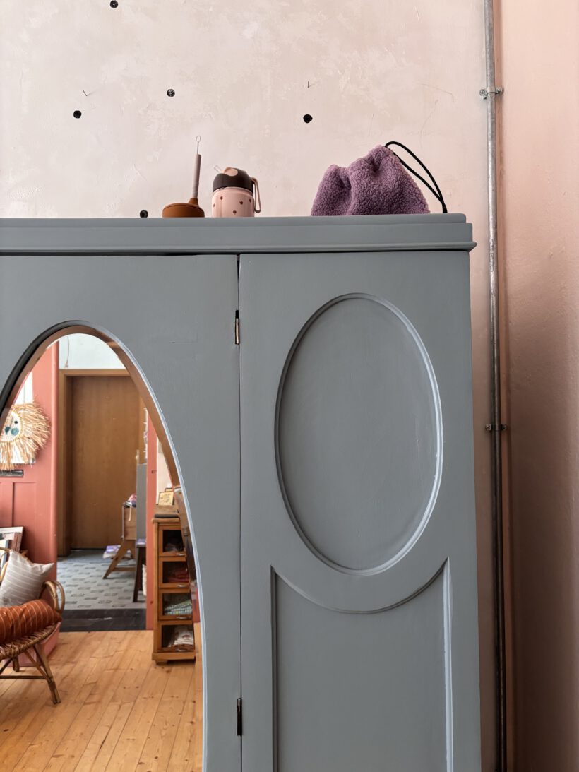 Es öffnet nur die mittlere Türe, die Seiten sind fest. Dies ist typisch für Garderobenschränken aus dem 19 und Anfang 20. Jh. Wir haben Jonny einen geschwungenen Boden zusätzlich montiert. So kann man bequem in Körben oder ähnlichem, Mützen Schals etc. verstauen.