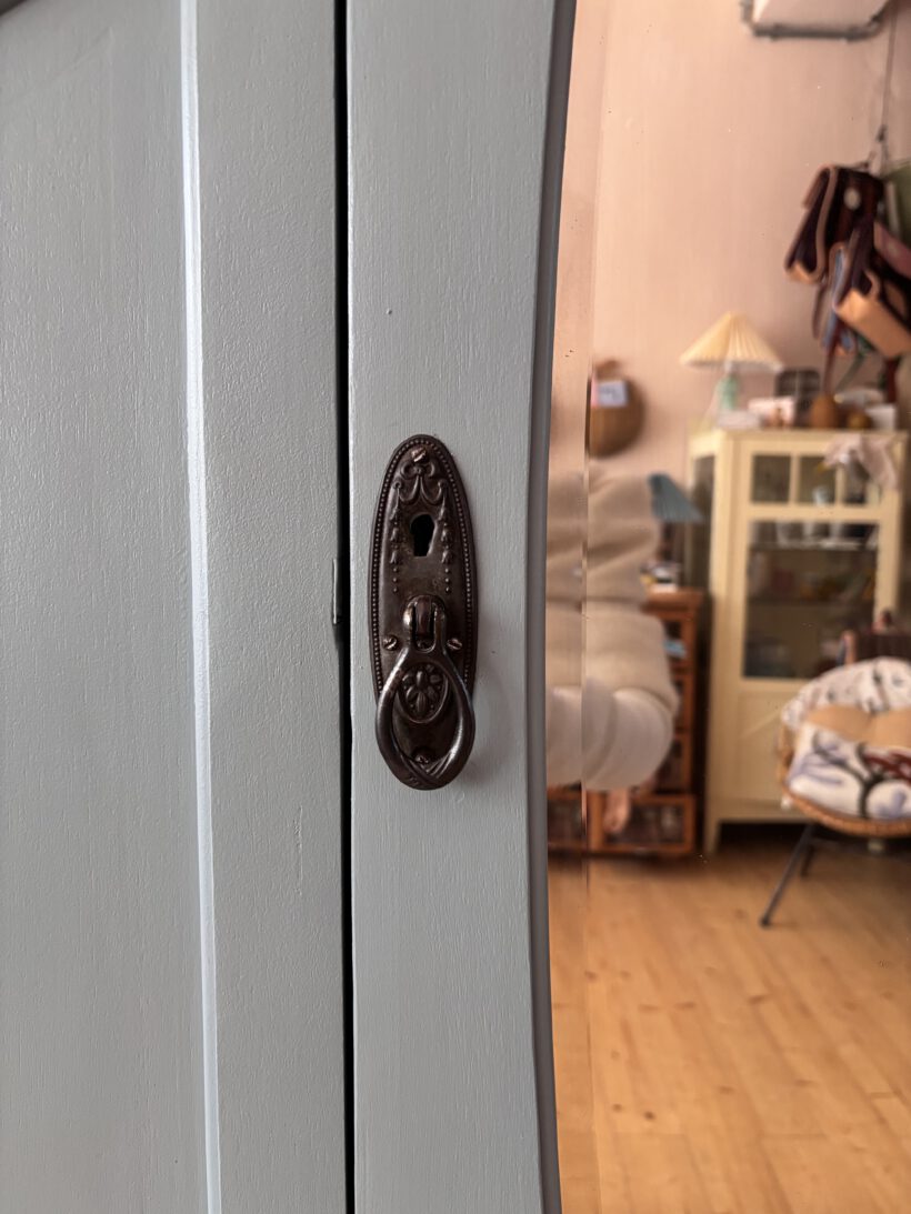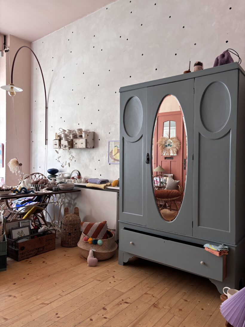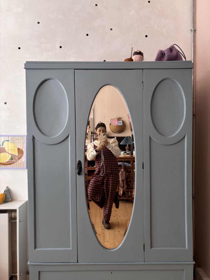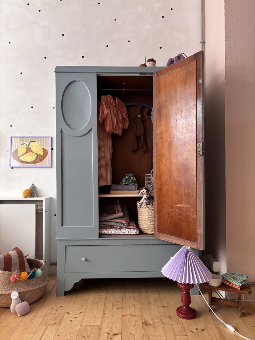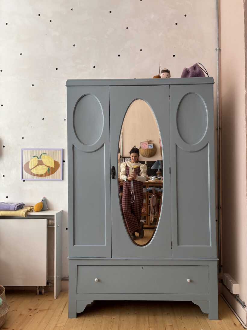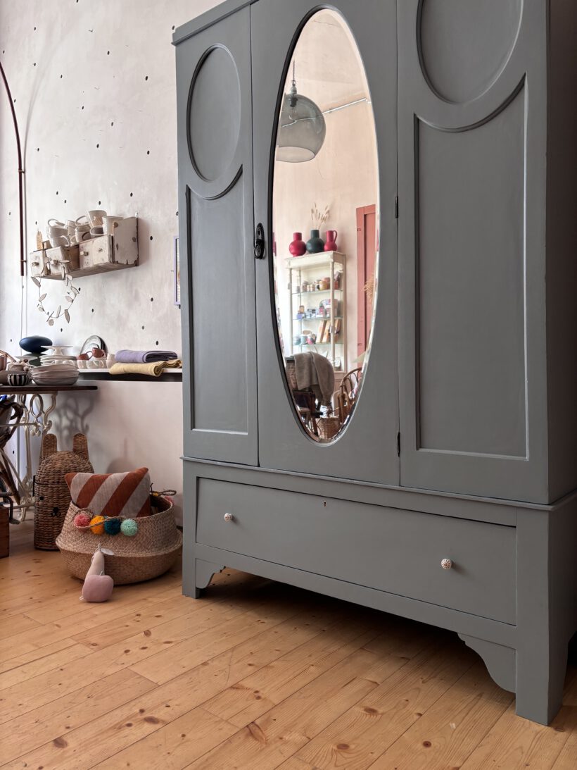 Jonny stammt aus England. Er ist ein antiker Garderobenschrank mit einer bombastisch schmalen Tiefe von nur 43,5 cm und wunderschönem rund grafischem Design. Wir lieben den original geschliffenen Spiegel und die ovalen Verzierungen. Die große Schublade ist der Hit, bietet viel Stauraum und die Beine haben Hübsche Verzierungen. Dir Tür hat keinen Schlüssel, dafür einen Clou: Die Tür öffnet und schließt durch drehen an dem Türgriff – mega!
