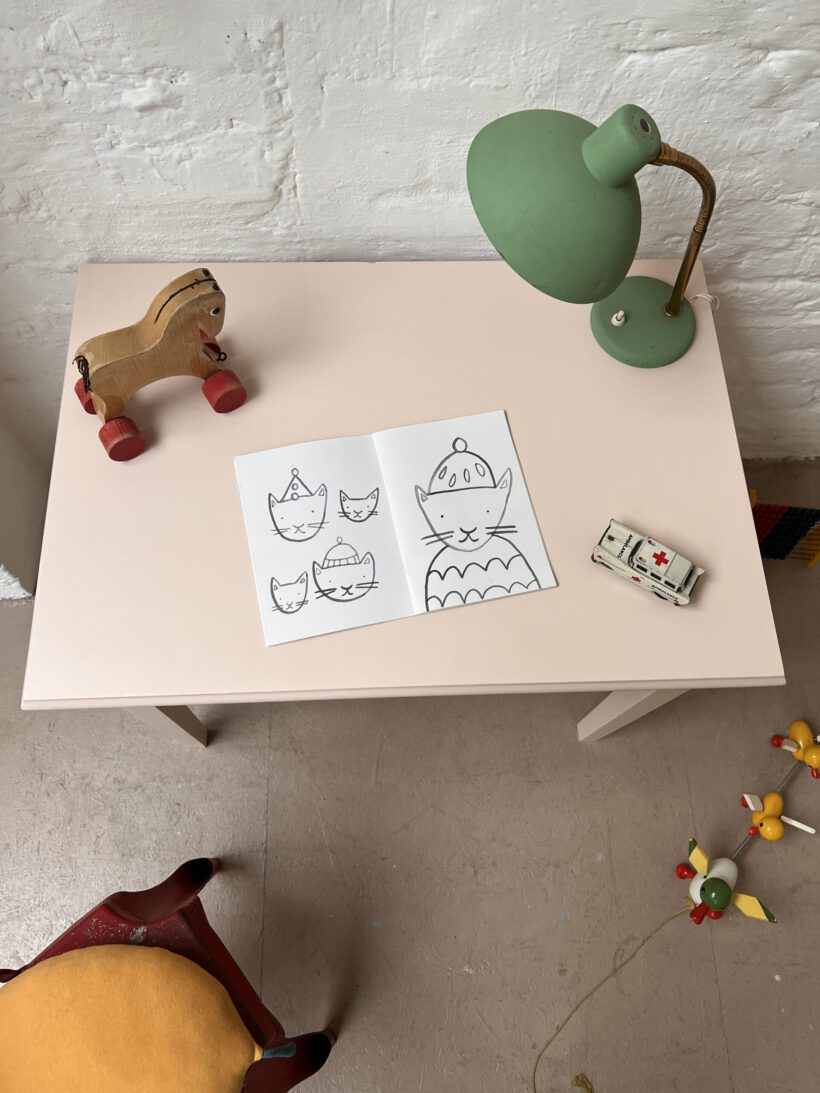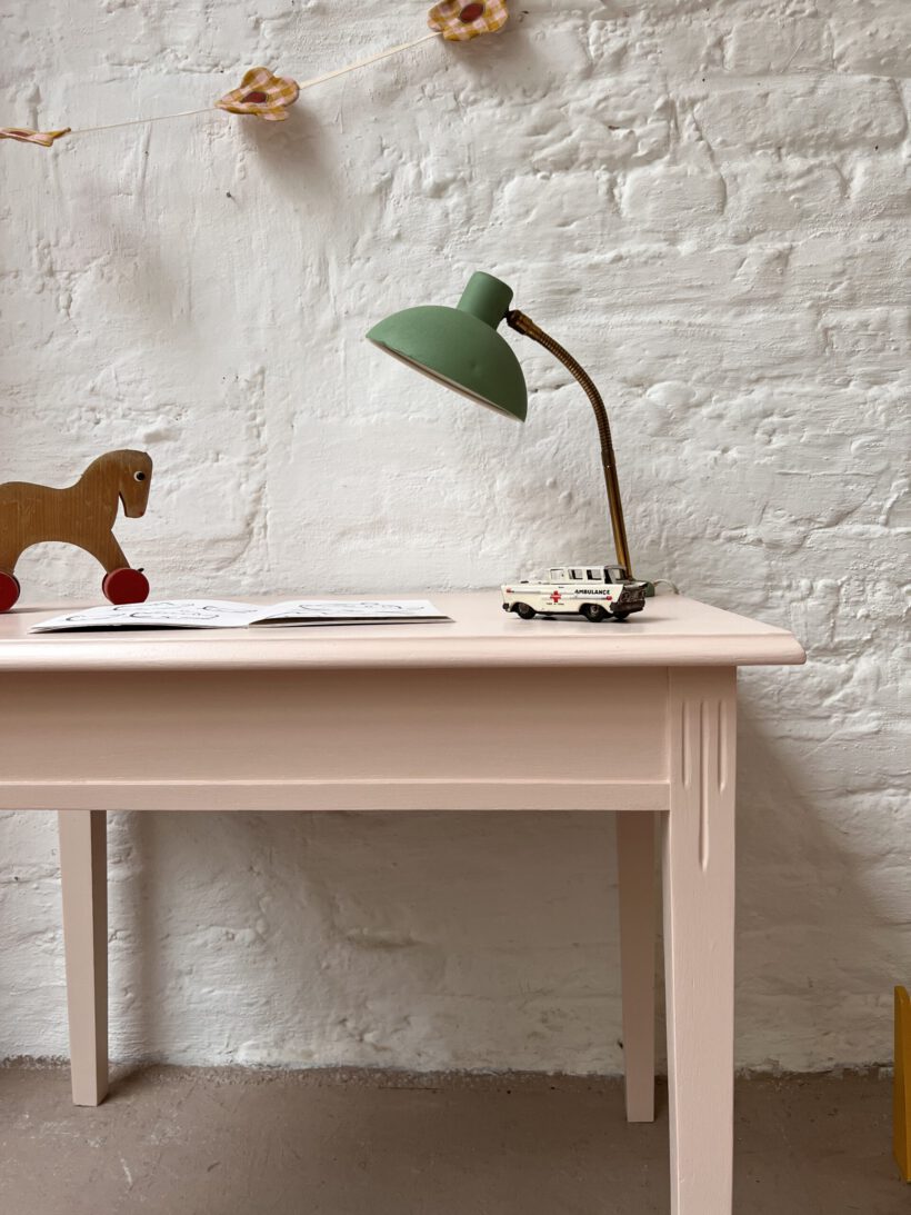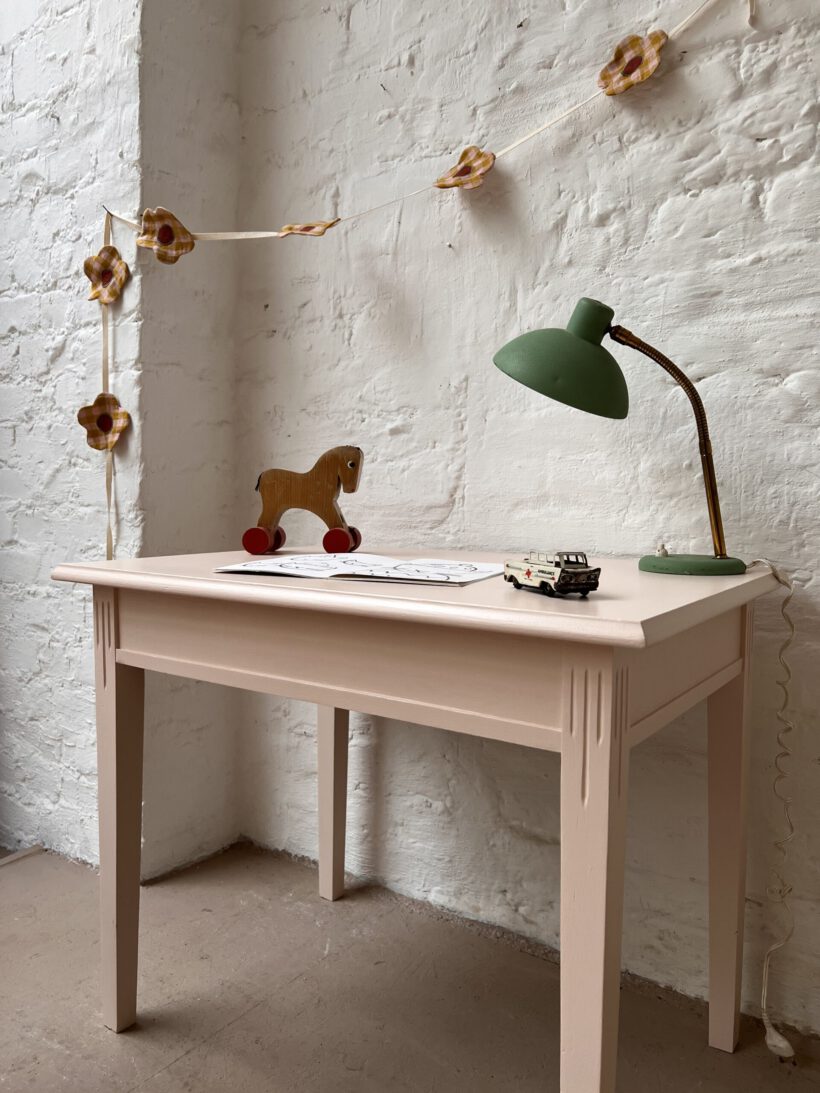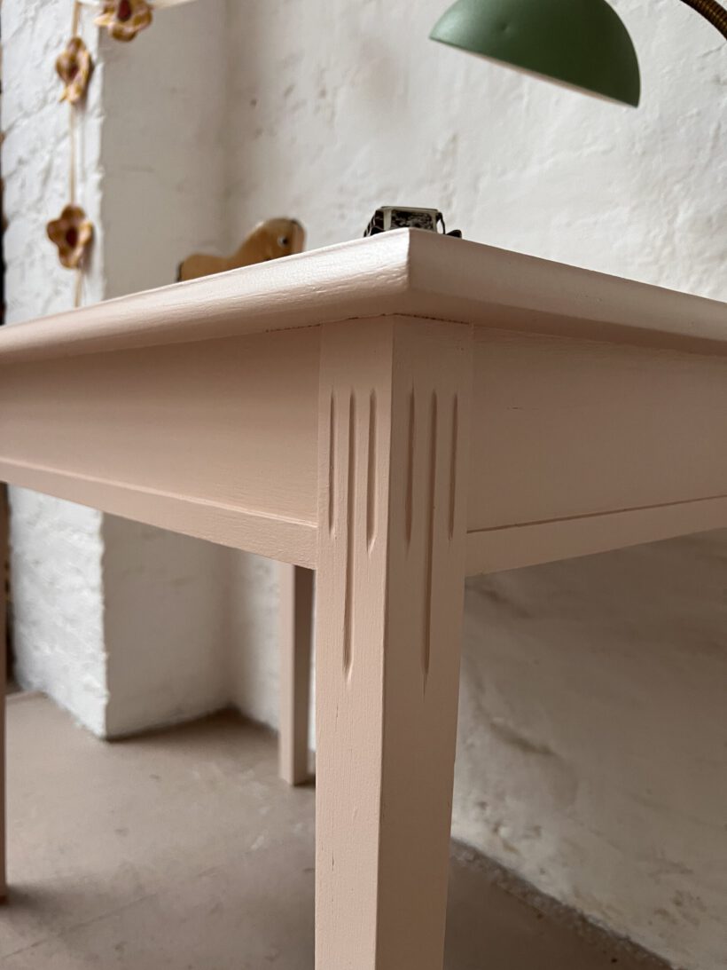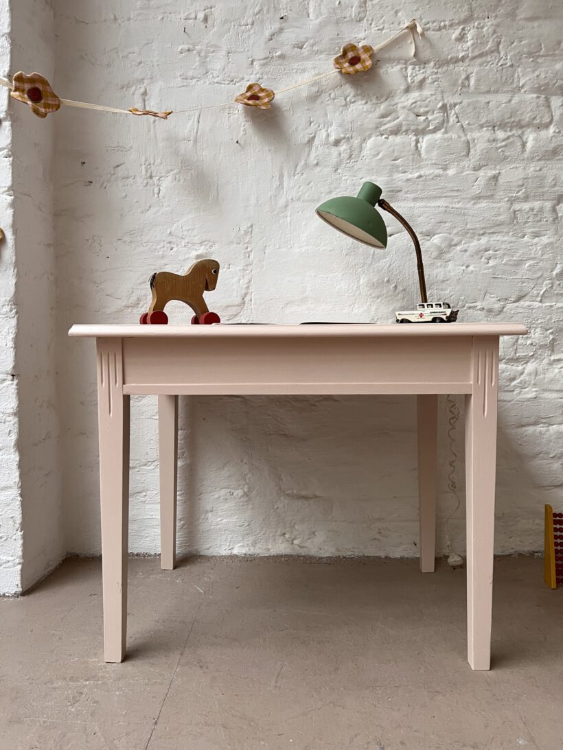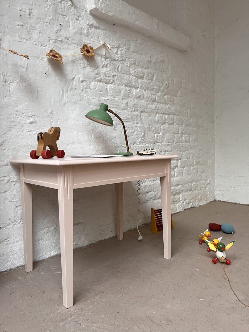 Judy wurde von uns farblich in ein zartes rosa von Farrow and Ball getaucht und eignet sich ganz wunderbar als kleiner Kindertisch ab circa 3 -6 Jahre. Für die farbliche Aufbereitung haben wir Judy´s Holz geschliffen, grundiert und zwei mal lackiert.