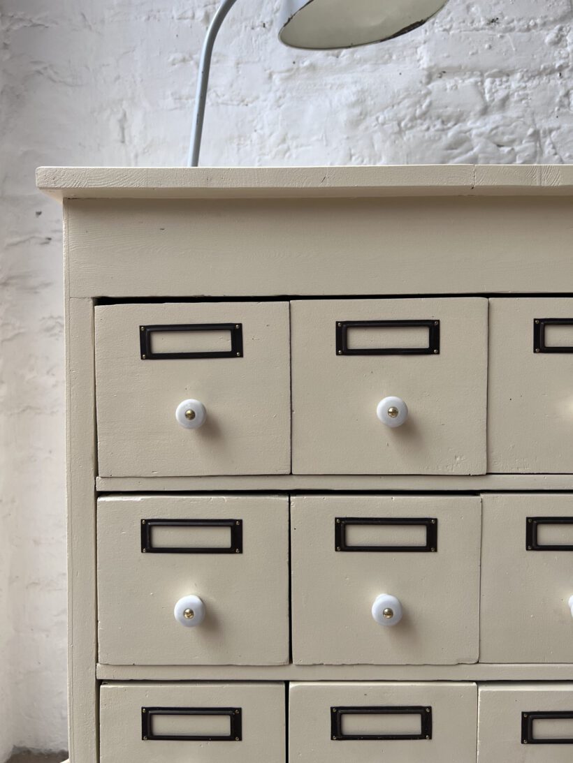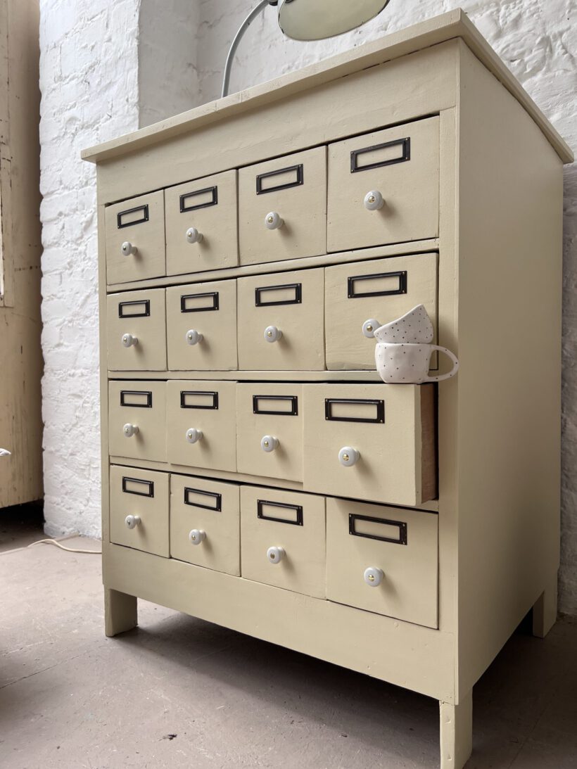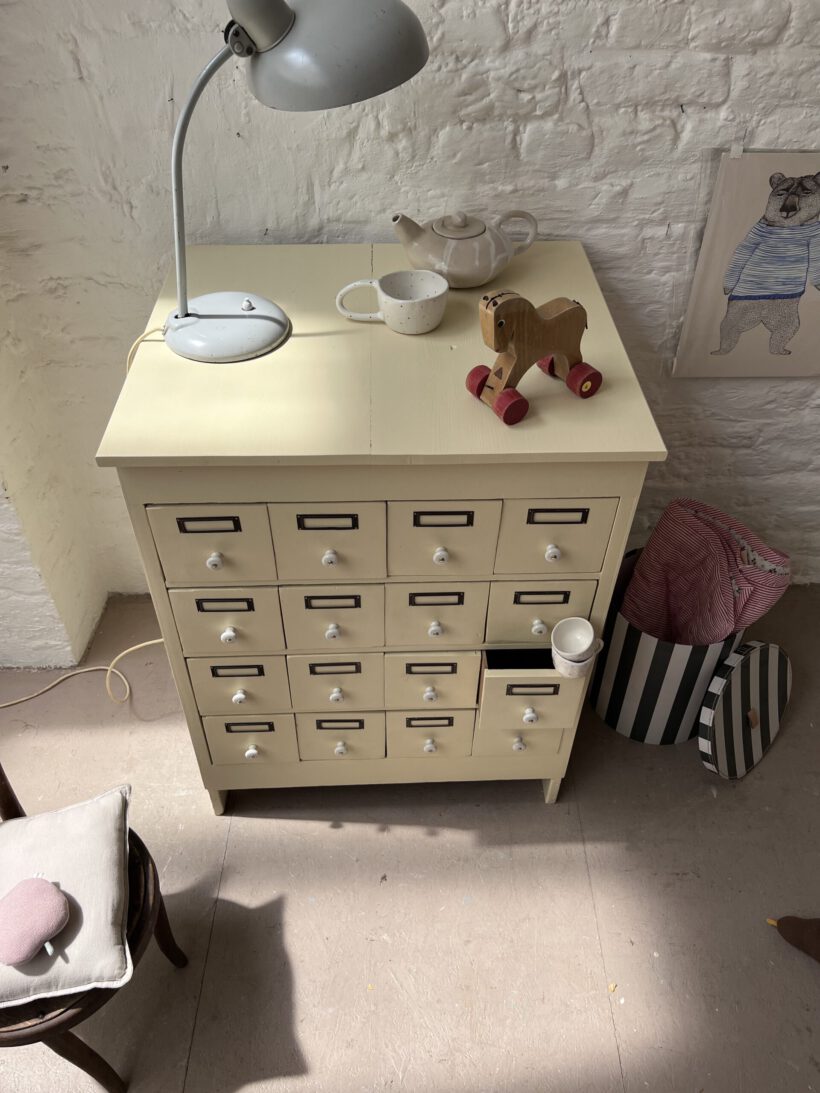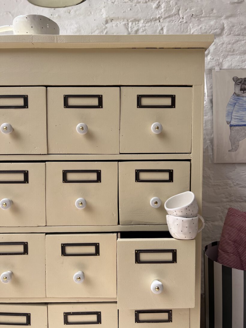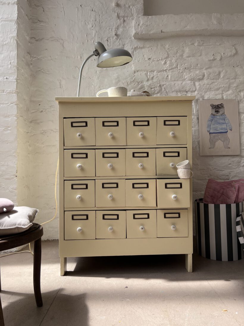 Juliette ist ein uralter Schubladenschrank aus Frankreich. Sie hat uns einige Monate in der Werkstatt charmant Gesellschaft geleistet. Es hat ein bisschen gedauert bis wir Zeit hatten uns ihrer anzunehmen. Sie brauchte viel Zeit und Liebe. Wir haben Juliette quasi ein neues Leben geschenkt: neue Seiten, ein neues Dach, viele Löcher gestopft etc. Ein Grund warum wir leider die alten Schriften und Etiketten nicht erhalten konnten. Dafür aber ihrem charmanten Gemüt eine passende Farbe verleihen konnten – ein wunderschönes Gelb von Farrow and Ball. Juliette wurde restauriert, geschliffen, das Holz ausgebessert, grundiert und zwei Mal lackiert. Sie hat eine schöne Patina (siehe Fotos).