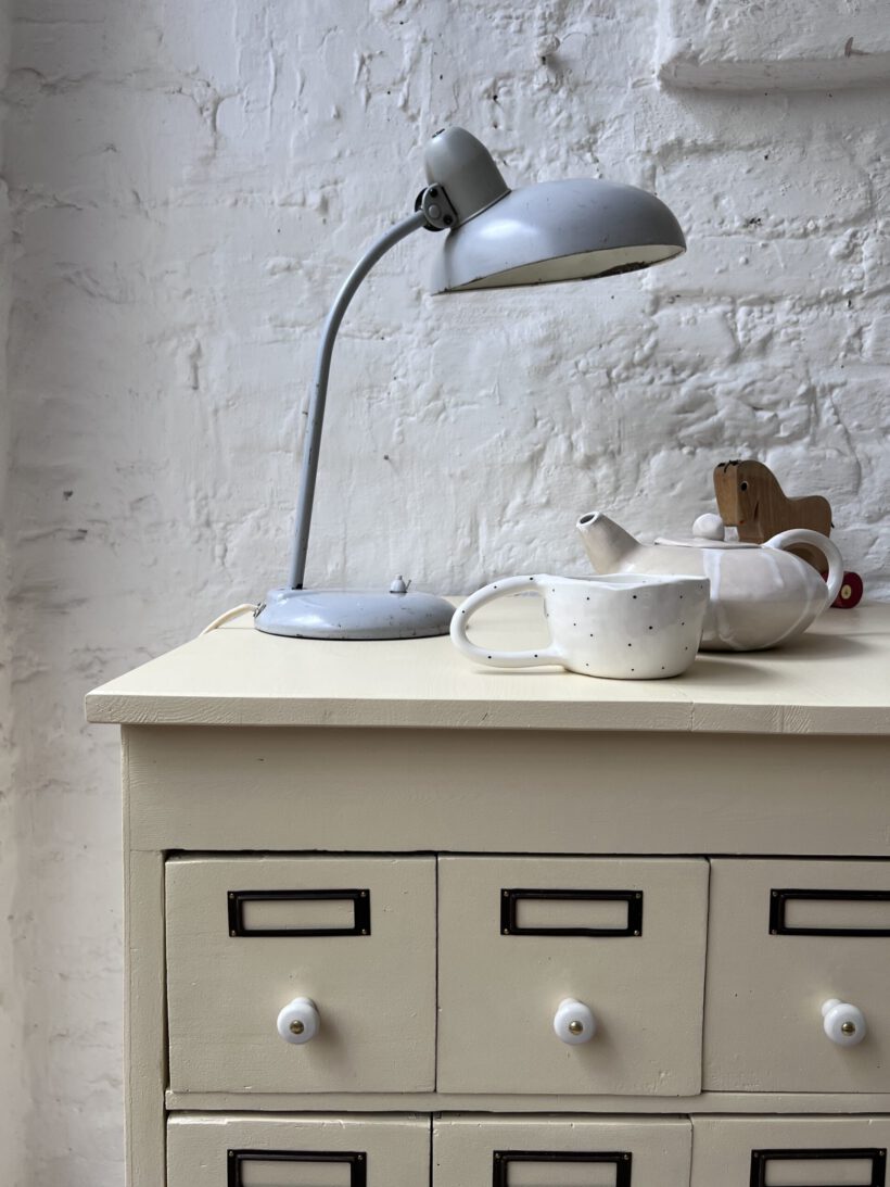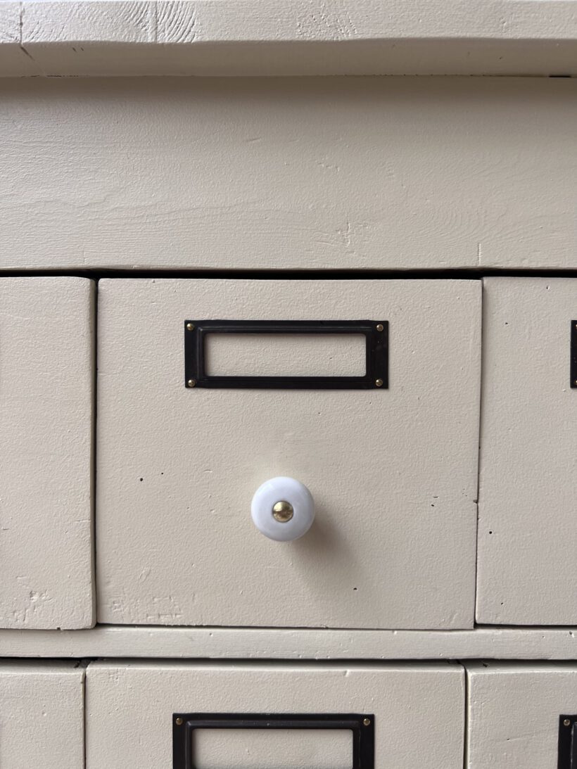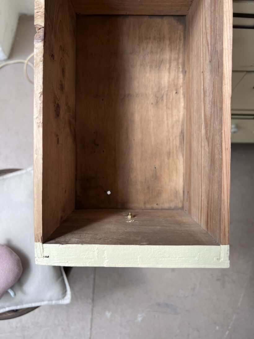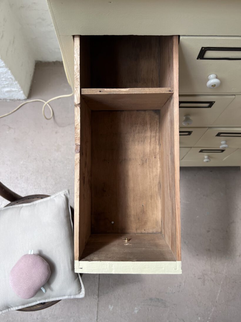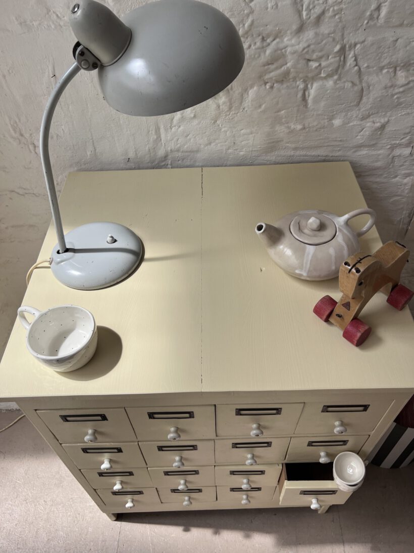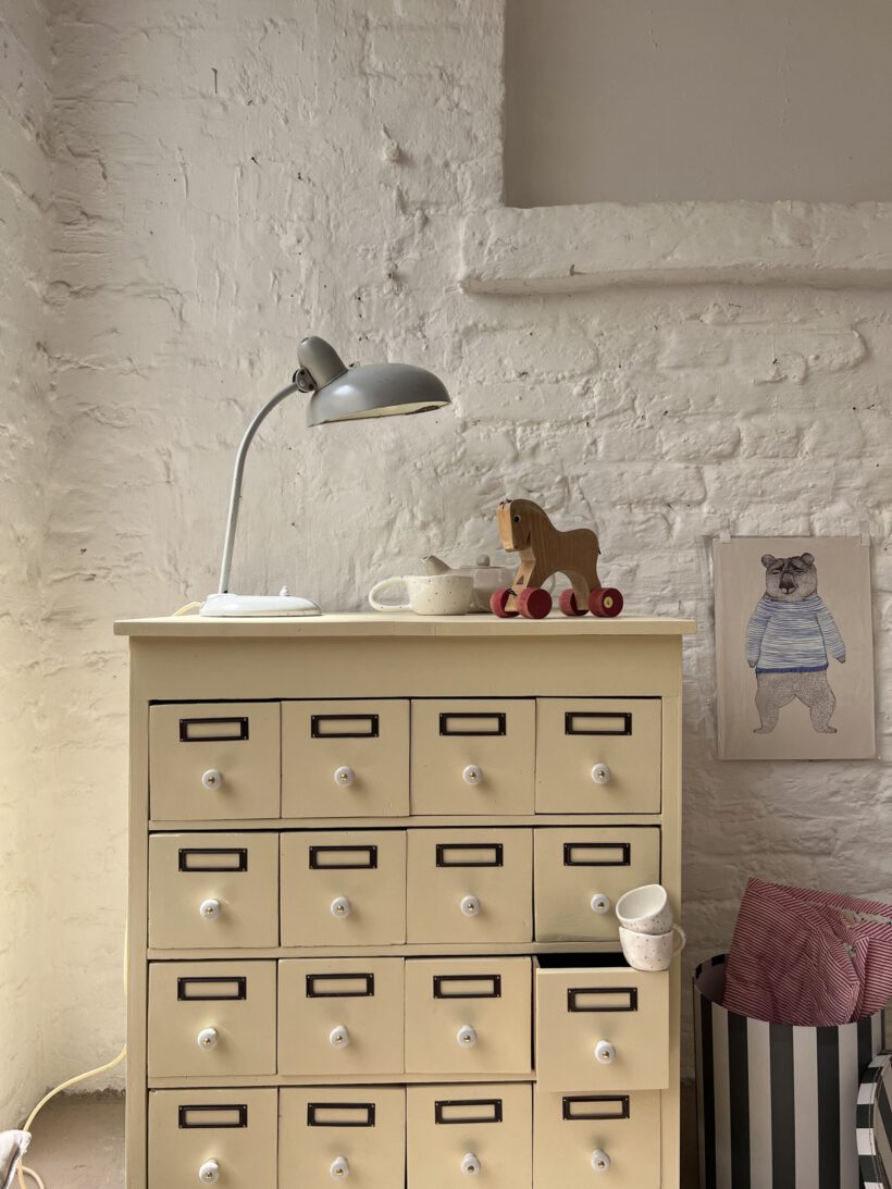 Juliette ist ein uralter Schubladenschrank aus Frankreich. Sie hat uns einige Monate in der Werkstatt charmant Gesellschaft geleistet. Es hat ein bisschen gedauert bis wir Zeit hatten uns ihrer anzunehmen. Sie brauchte viel Zeit und Liebe. Wir haben Juliette quasi ein neues Leben geschenkt: neue Seiten, ein neues Dach, viele Löcher gestopft etc. Ein Grund warum wir leider die alten Schriften und Etiketten nicht erhalten konnten. Dafür aber ihrem charmanten Gemüt eine passende Farbe verleihen konnten – ein wunderschönes Gelb von Farrow and Ball. Juliette wurde restauriert, geschliffen, das Holz ausgebessert, grundiert und zwei Mal lackiert. Sie hat eine schöne Patina (siehe Fotos).