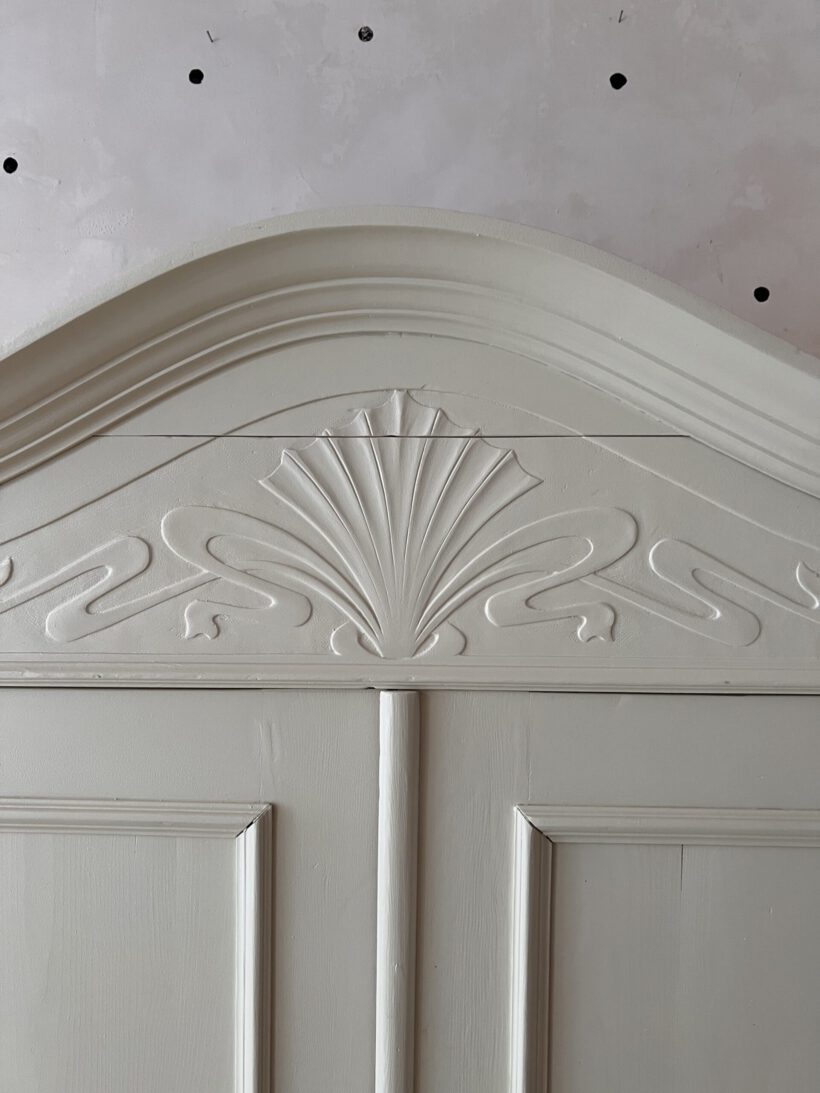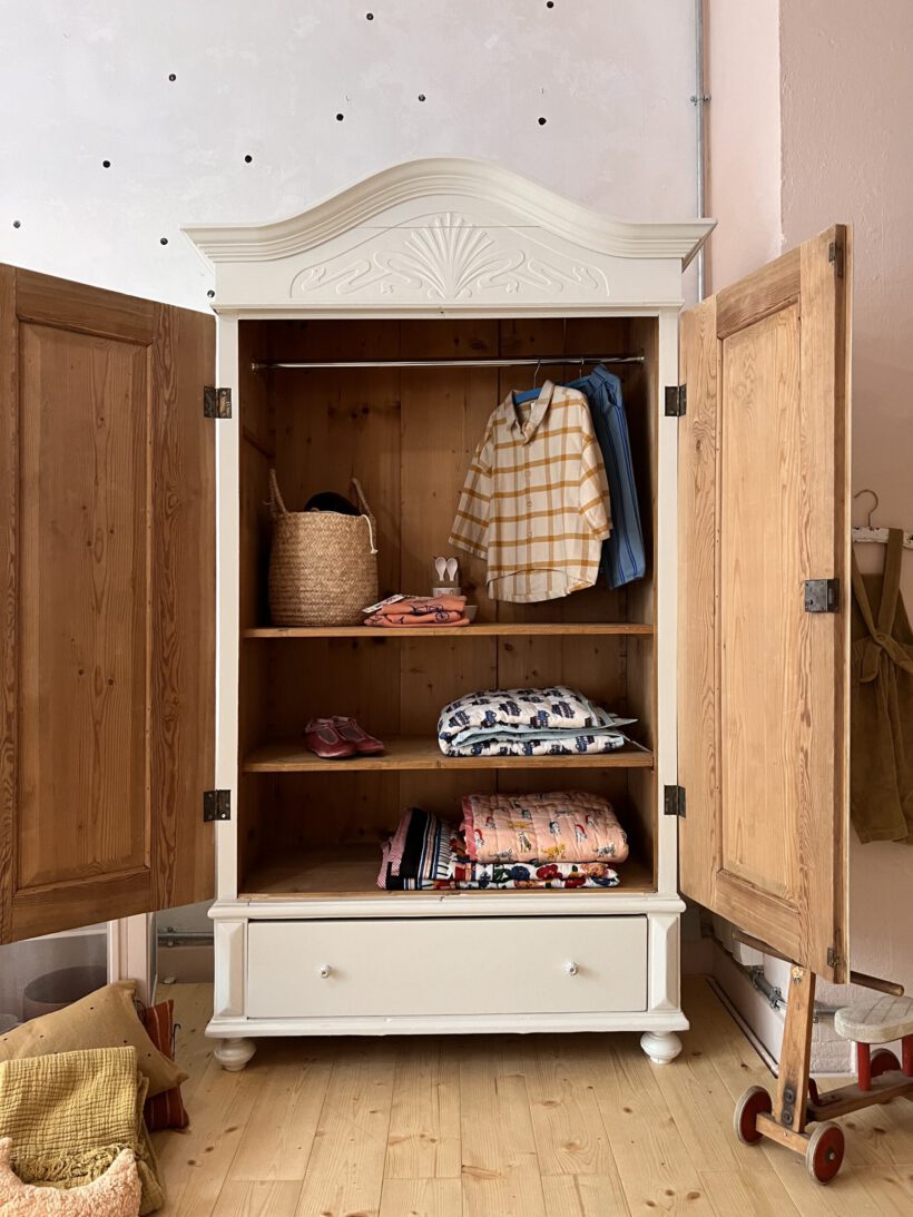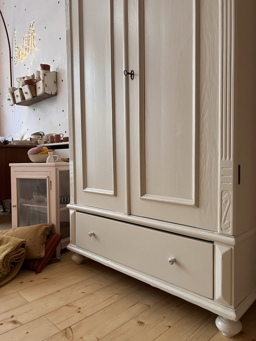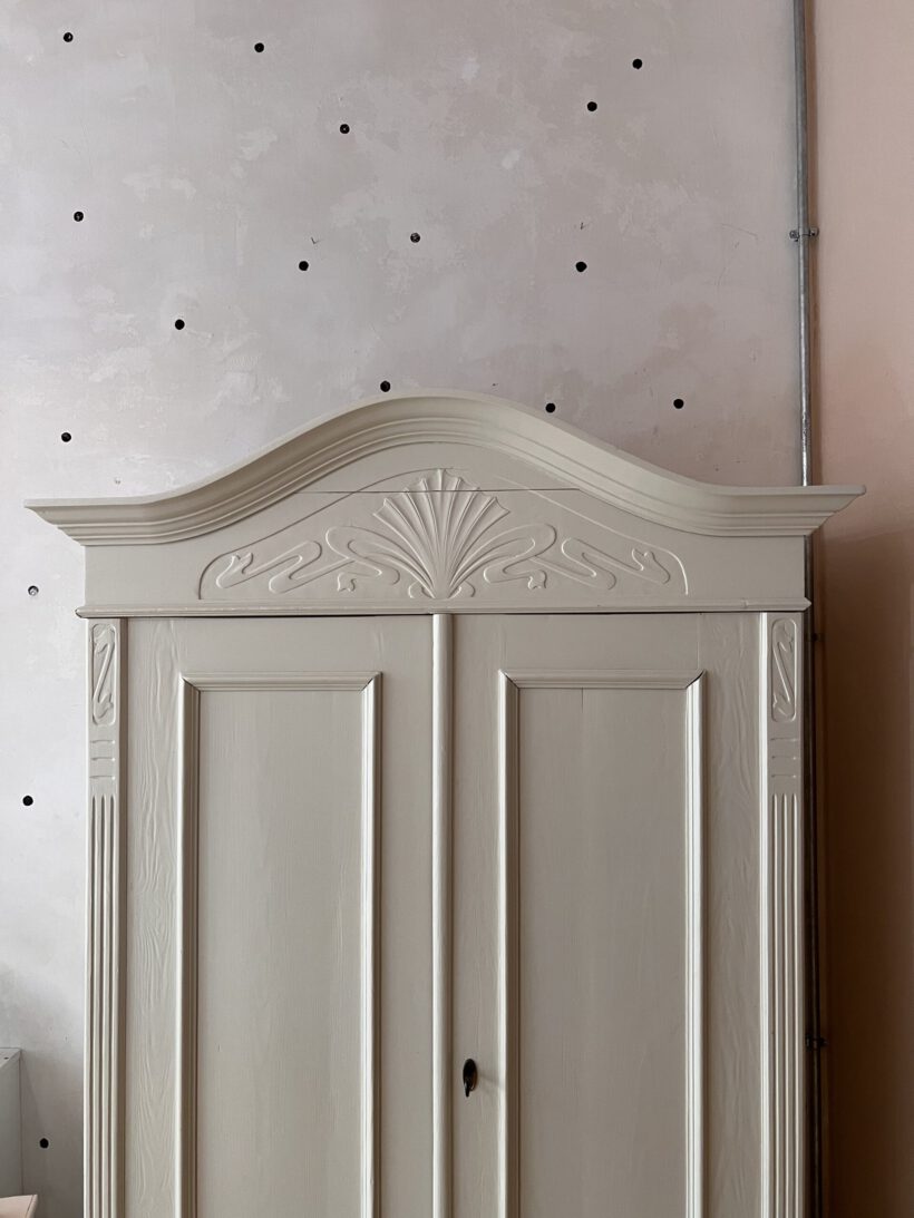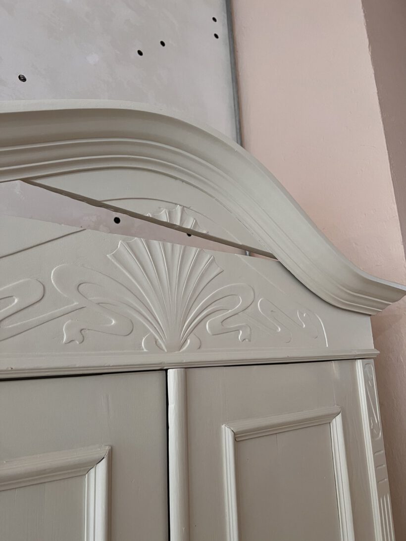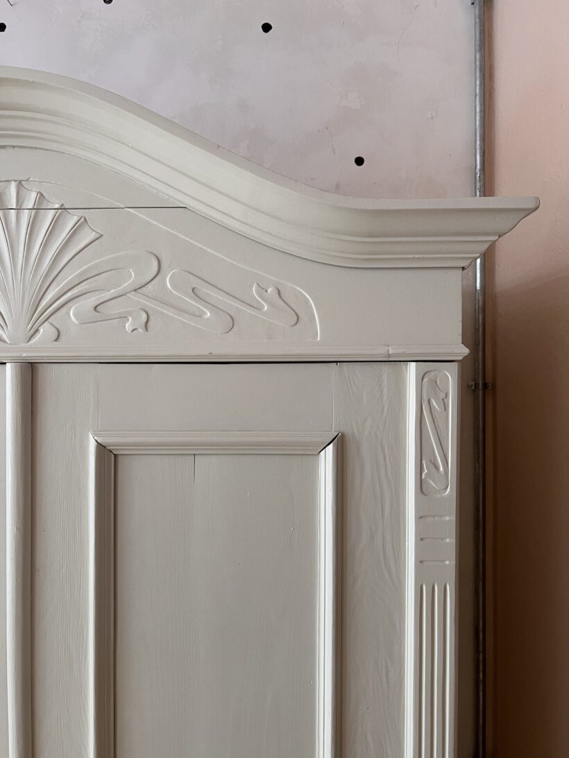 ein ganz besonderes Schätzchen an Kleiderschrank. Käthe ist ein alter Jugendstilschrank mit ganz ungewöhnlichen schönen Holzverzierungen. Ihre Krone und ihre Seiten zeigen hübsche dezent hervorstechende Schnitzerein. Außerdem hat Käthe einen ganz besonderen Clou. Sie wurde vor gut 100 Jahren Mass angefertigt. Die Krone lässt sich oben zur Hälfe abnehmen. Wir vermuten dies war eine Sonderanfertigung für ein kleines feines Zimmer, in das Käthe sonst nicht gepasst hätte. Viele Bauernhäuser waren damals niedrig und mit schmalen niedrigen Türen gebaut. Um irgendeine Ecke passte es wohl nicht in den gewünschten Raum;-)