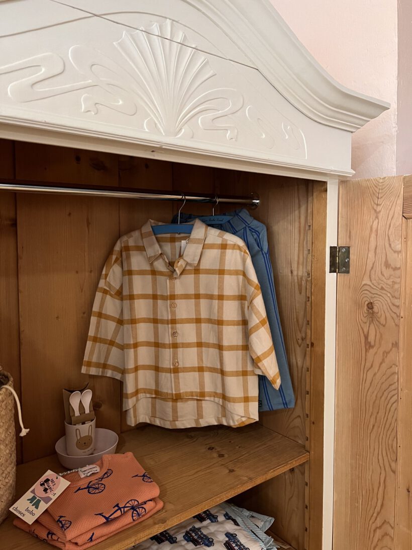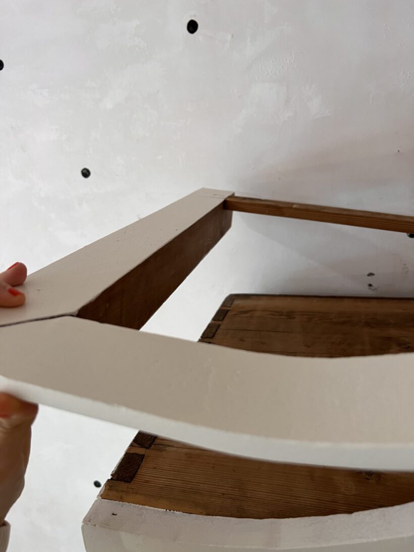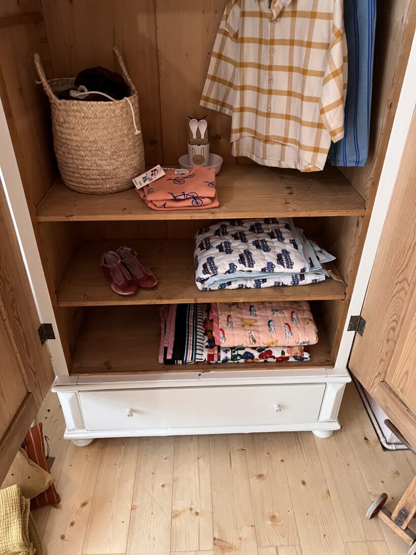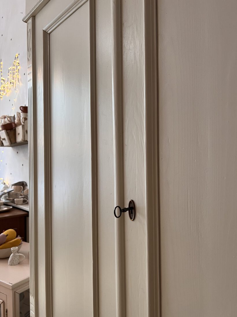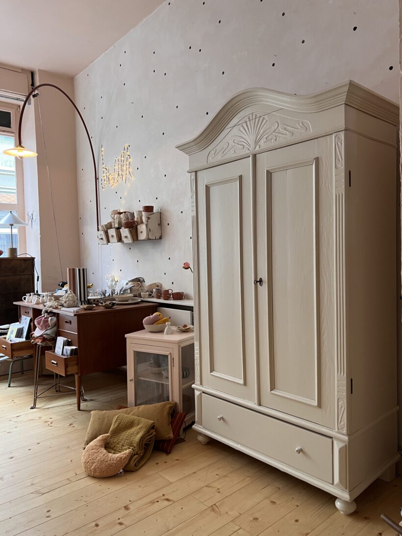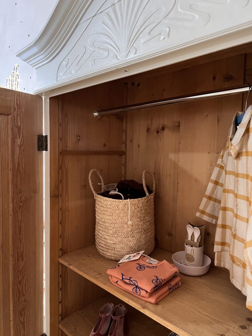 ein ganz besonderes Schätzchen an Kleiderschrank. Käthe ist ein alter Jugendstilschrank mit ganz ungewöhnlichen schönen Holzverzierungen. Ihre Krone und ihre Seiten zeigen hübsche dezent hervorstechende Schnitzerein. Außerdem hat Käthe einen ganz besonderen Clou. Sie wurde vor gut 100 Jahren Mass angefertigt. Die Krone lässt sich oben zur Hälfe abnehmen. Wir vermuten dies war eine Sonderanfertigung für ein kleines feines Zimmer, in das Käthe sonst nicht gepasst hätte. Viele Bauernhäuser waren damals niedrig und mit schmalen niedrigen Türen gebaut. Um irgendeine Ecke passte es wohl nicht in den gewünschten Raum;-)