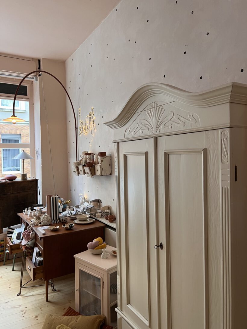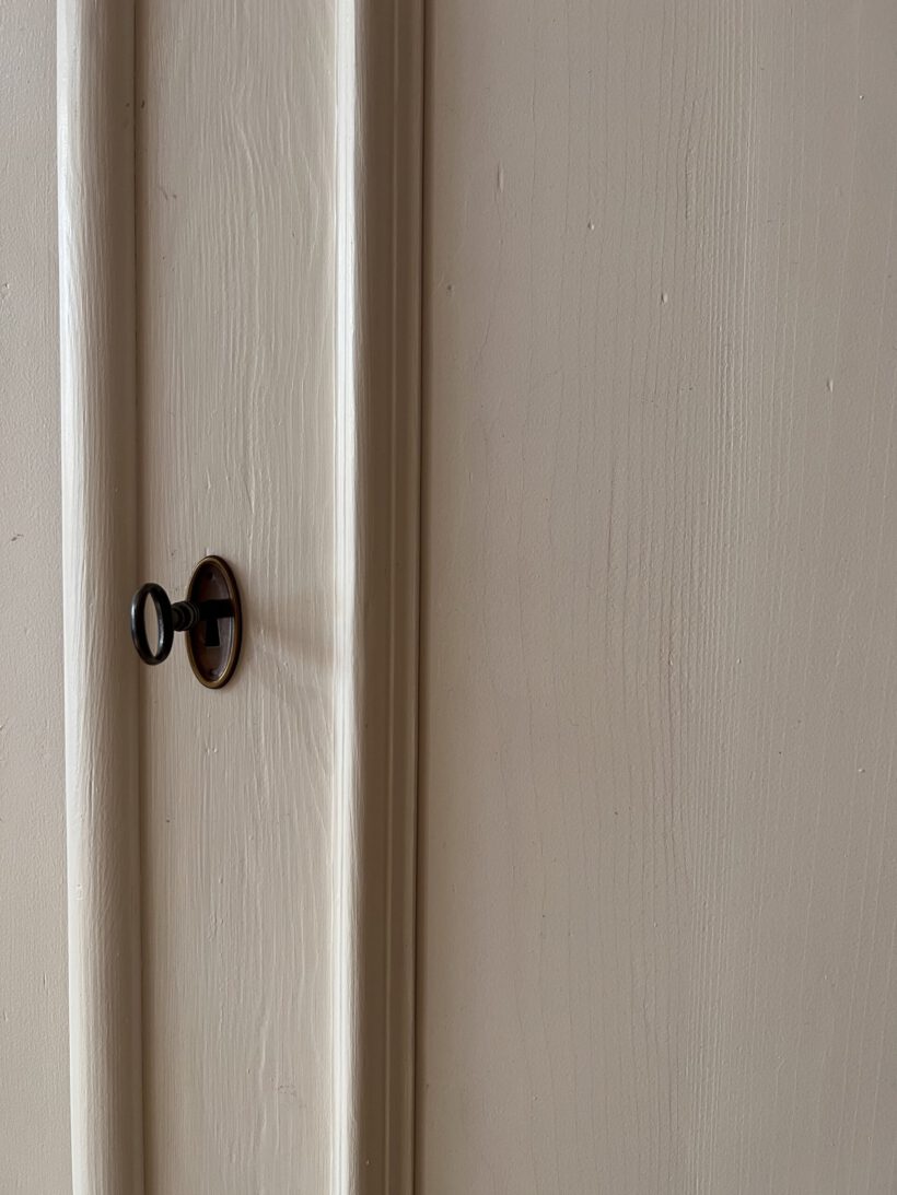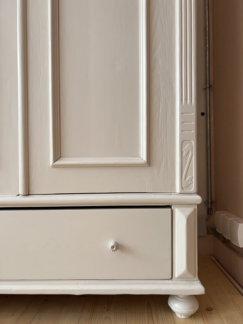 Käthe wurde von uns restauriert, geschliffen, grundiert und zwei Mal lackiert in einem warmen weiß von Farrow and Ball. Die Keramikknöpfe und Beschläge haben wir erneuert.