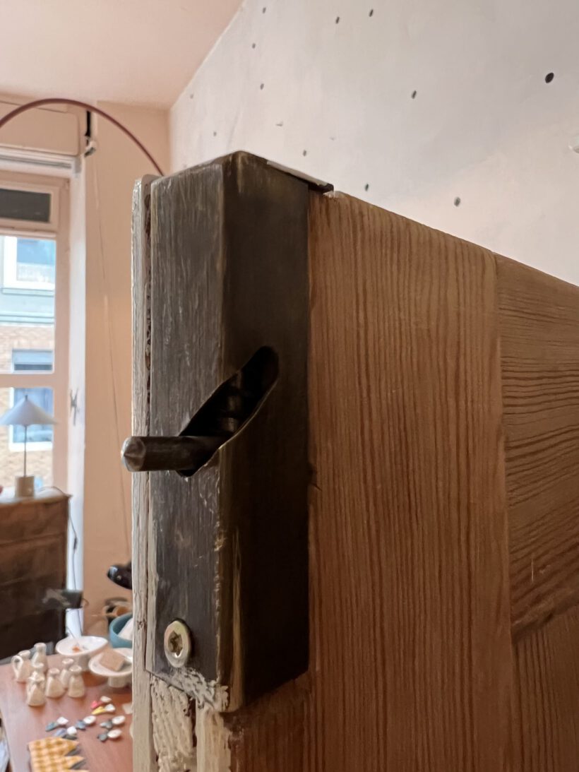 Innen hat Käthe zwei beliebig versetzbare Böden und eine nachträglich eingebaute Kleiderstange. Der alte Schlüssel ist vorhanden. Die Türen schließen gut. Die obere Festellfassung der linken Tür von innen lässt sich nicht mehr schließen, die untere schliesst gut. Siehe Fotos.