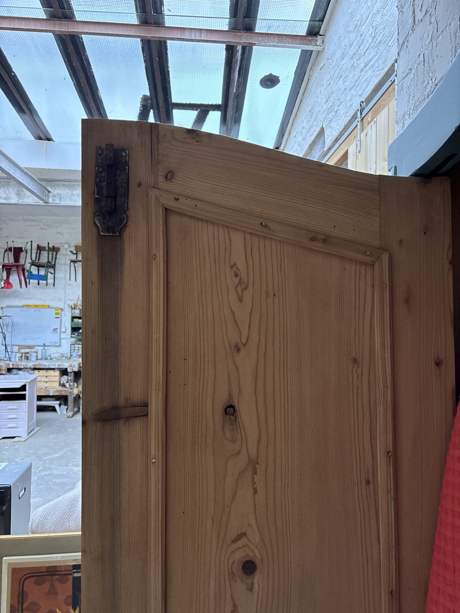 Innen hat er von uns einen Boden und eine. Kleiderstange bekommen. Die Türe schließt rechts per Schlüssel, links per Hacken oben und unten.