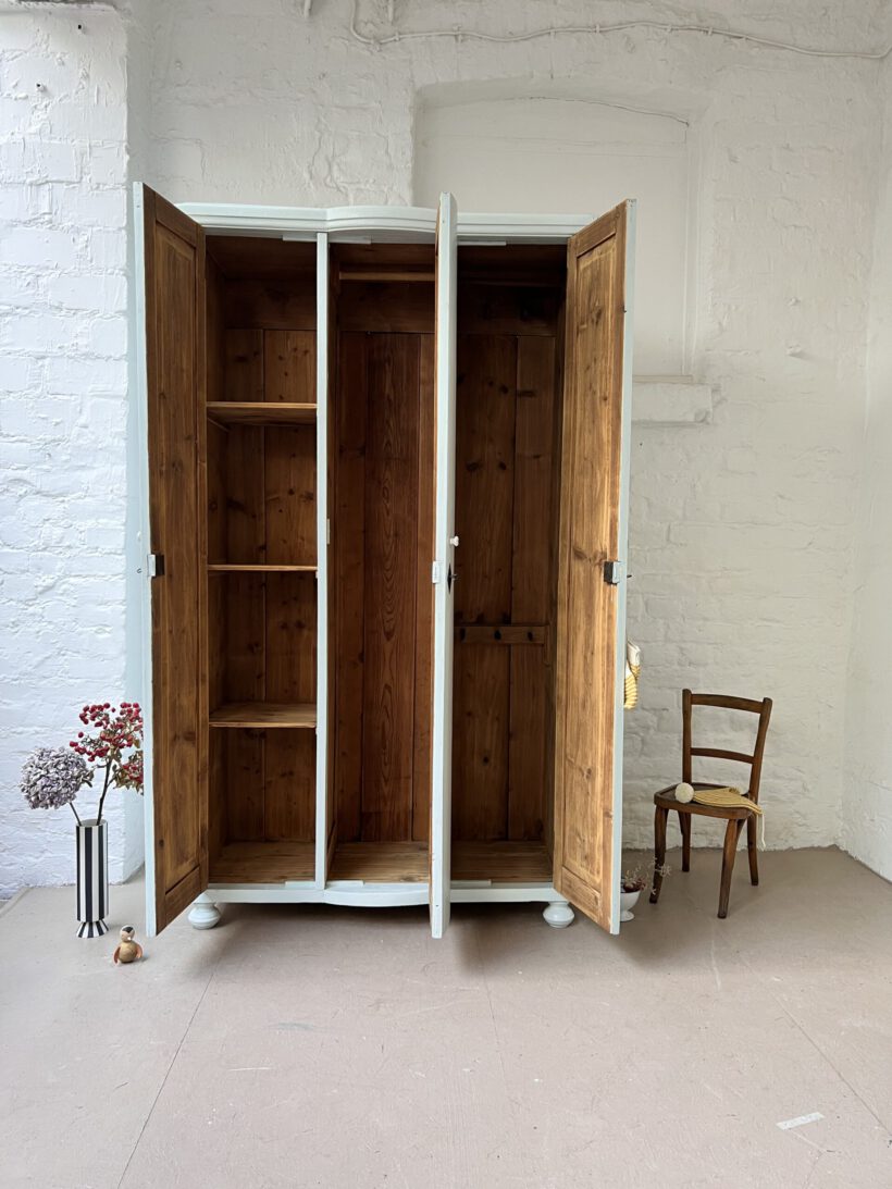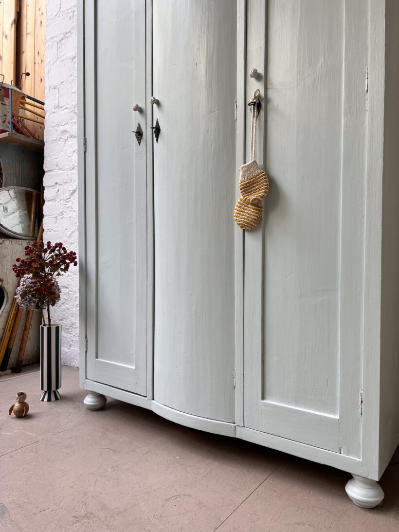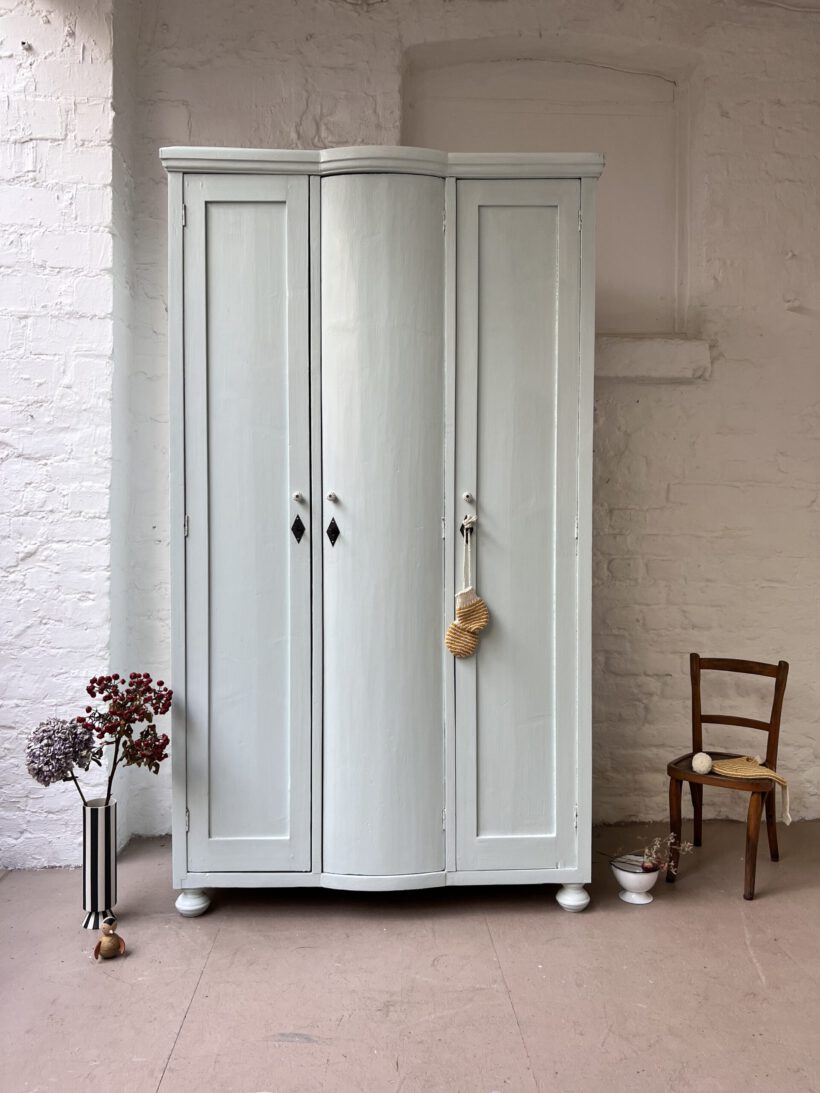 ist ein ganz besonderes Exepmlar. Selten trifft man Dreitürer mit solch schmalen Maßen. Zudem ist die mittleren Tür rund – ein Traum! Katarina hat überdies noch ein zauberhaftes Innenleben: links Fächer, in der Mitte und rechts Je eine Kleiderstange. So praktisch. Alle drei Schlüssel funktionieren und Katarina freut sich auf ein neues Leben in einem schönen Zuhause.