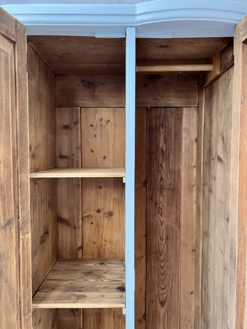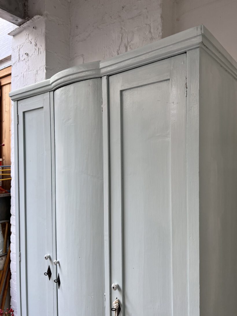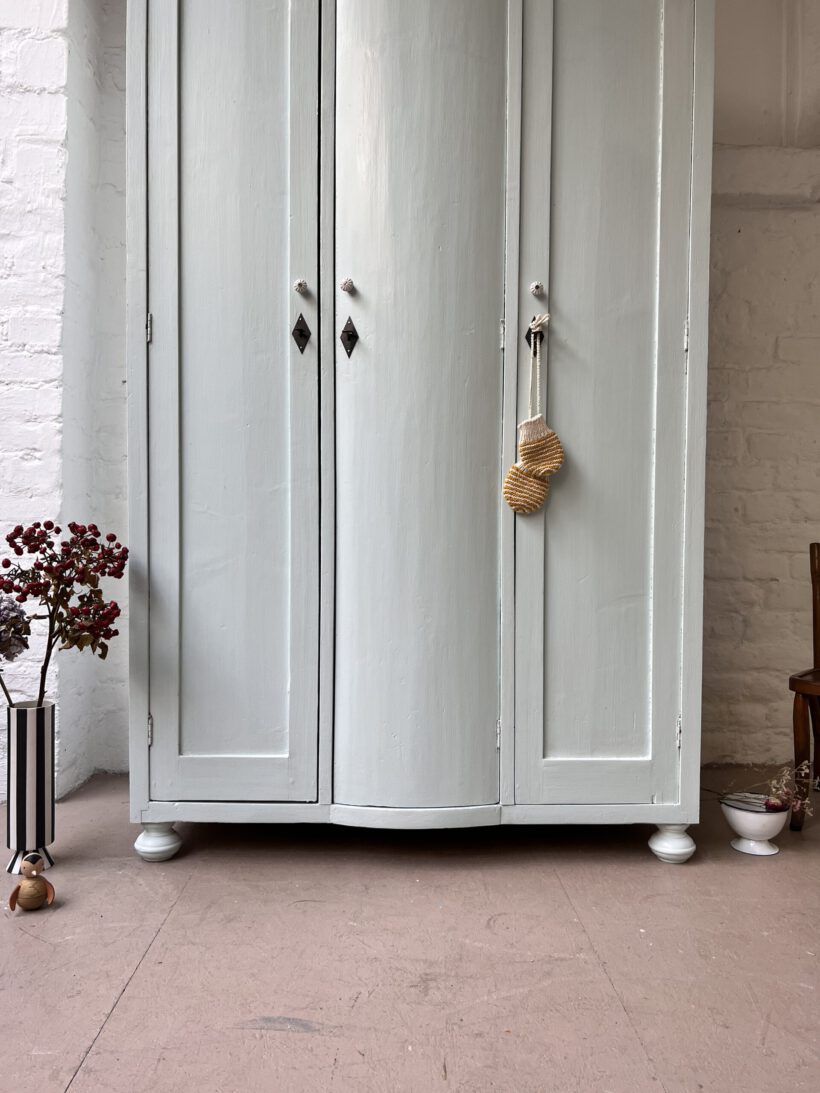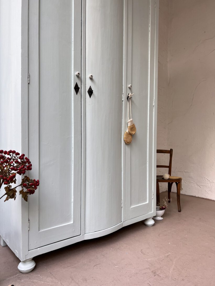 ist ein ganz besonderes Exepmlar. Selten trifft man Dreitürer mit solch schmalen Maßen. Zudem ist die mittleren Tür rund – ein Traum! Katarina hat überdies noch ein zauberhaftes Innenleben: links Fächer, in der Mitte und rechts Je eine Kleiderstange. So praktisch. Alle drei Schlüssel funktionieren und Katarina freut sich auf ein neues Leben in einem schönen Zuhause.