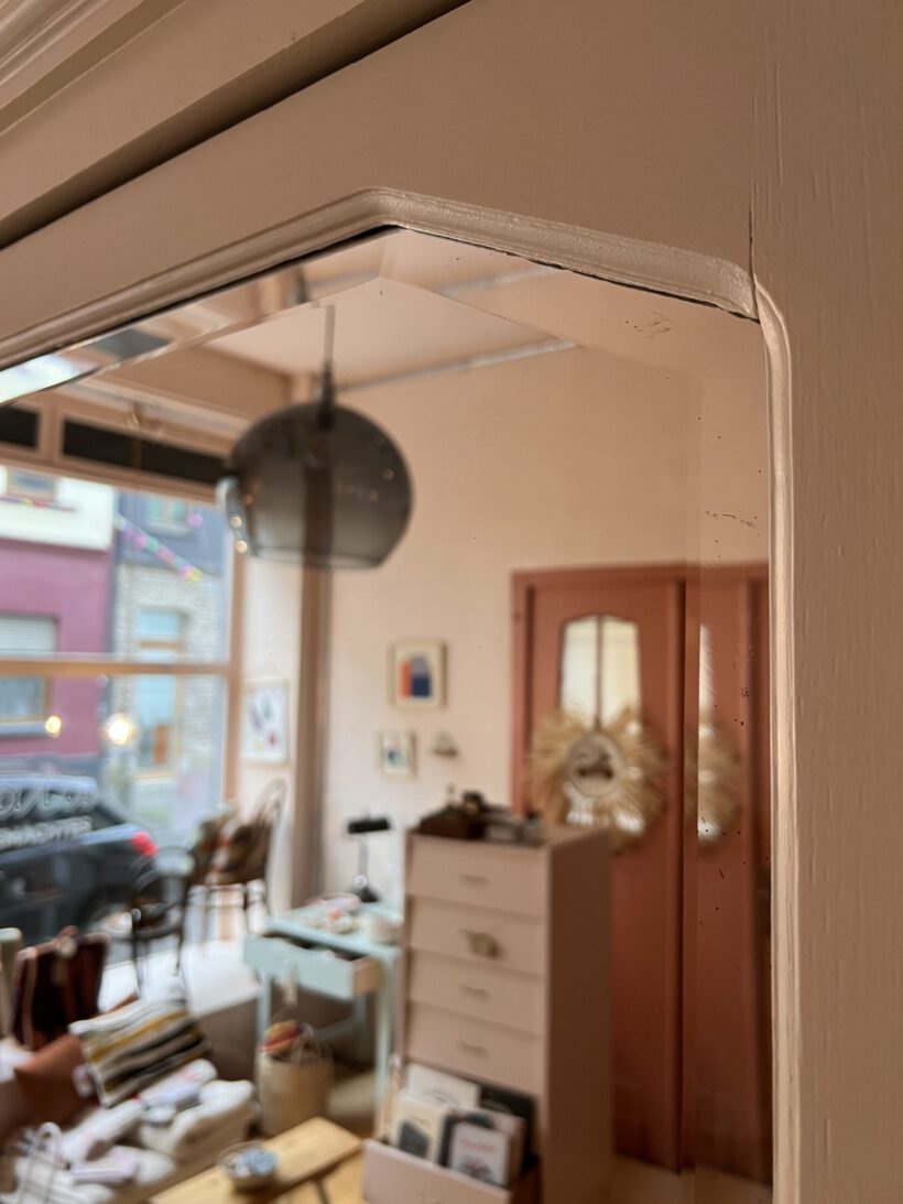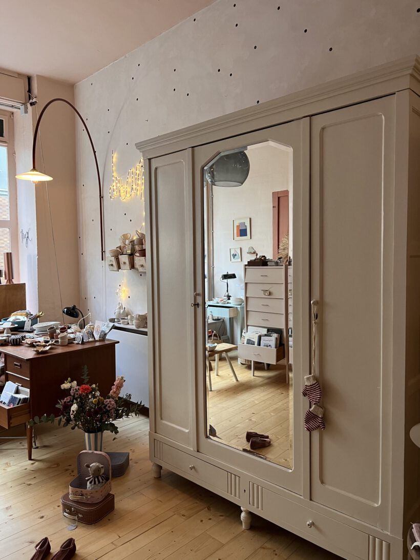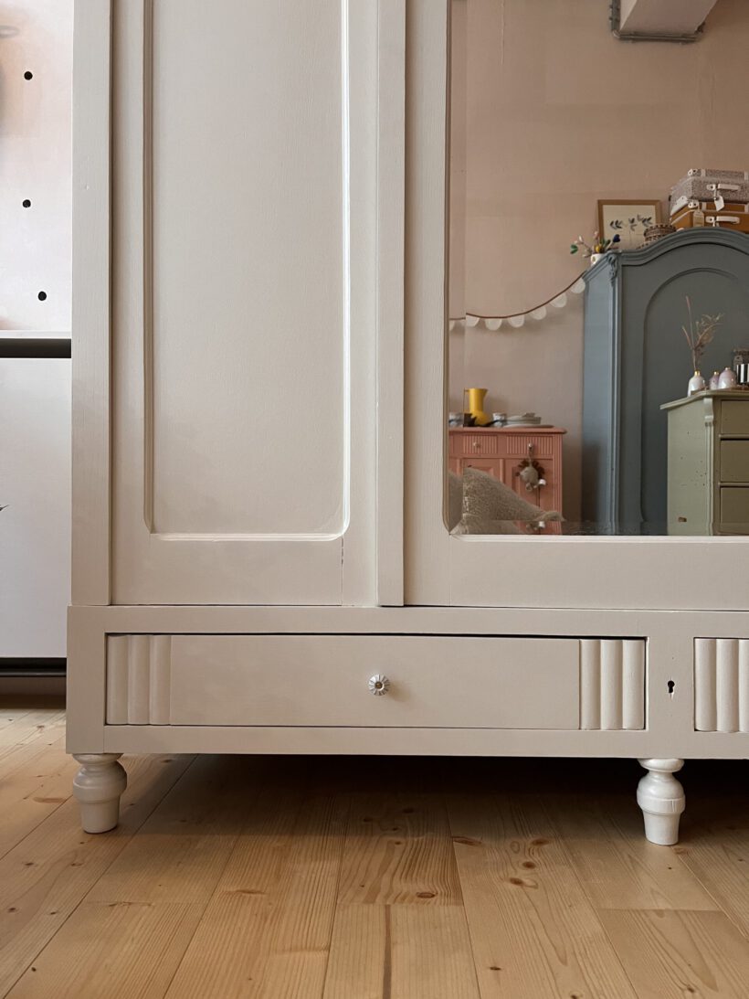 Kathi hat eine schöne Mischung aus klaren Formen und dezenten Details. Sie wirkt trotz ihrer Grösse sehr zart und luftig. Besonders schön ist der alte geformte und geschliffene Spiegel, sowie das Kathi vorne auf drei Beinen steht. Das ist sehr ungewöhnlich. Das Spiegelglas ist an den Kanten geschliffen – ein Traum. Der Spiegel hat Patina, man kann sich natürlich trotzdem wunderbar darin sehen. Die Patina ist vor allem im unteren Spiegelbereich und äußerst charmant. Ein Schlüssel ist erhalten, der beide Türen öffnet und schließt.