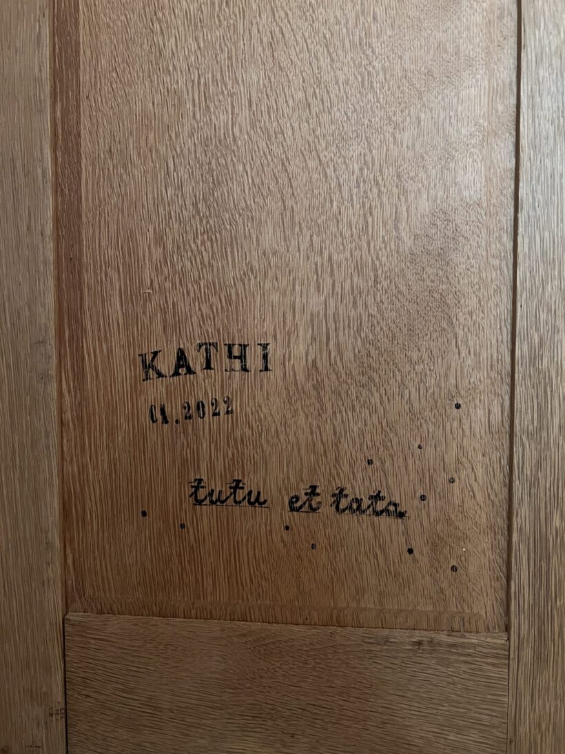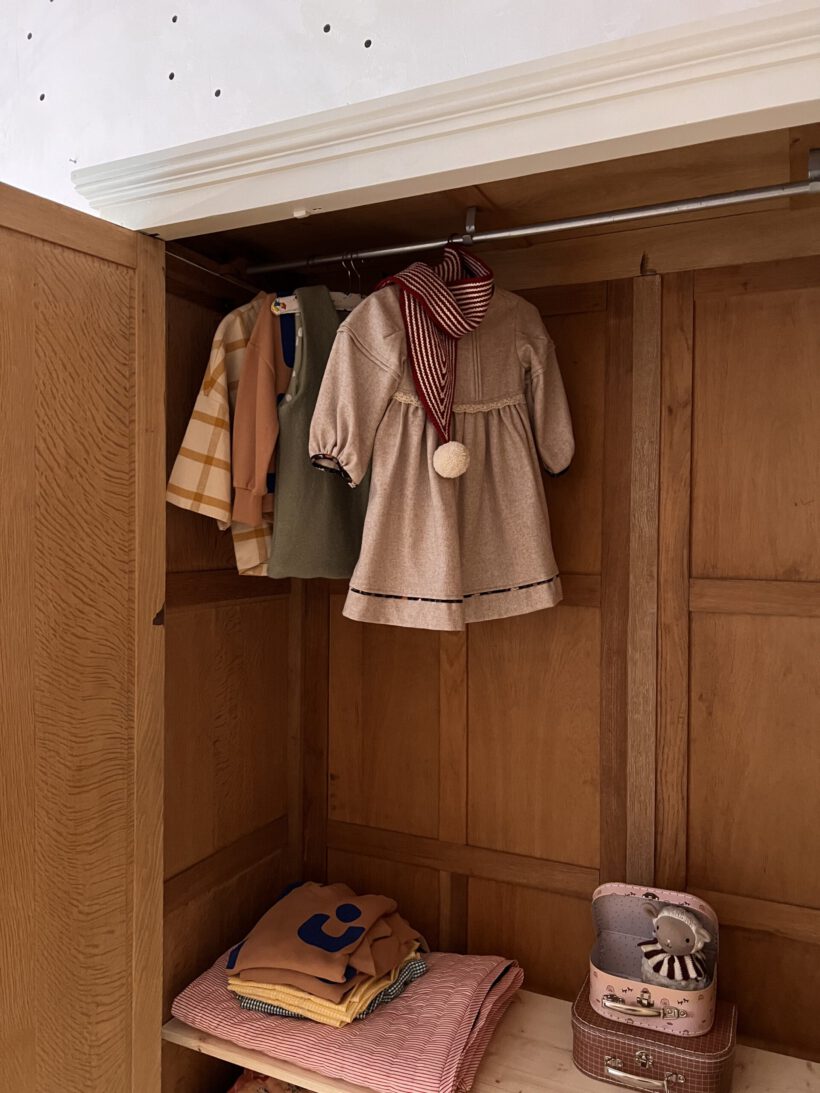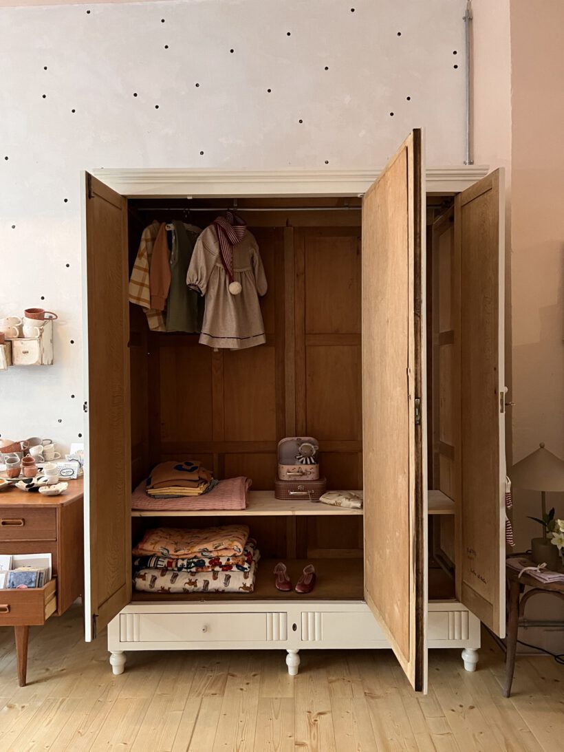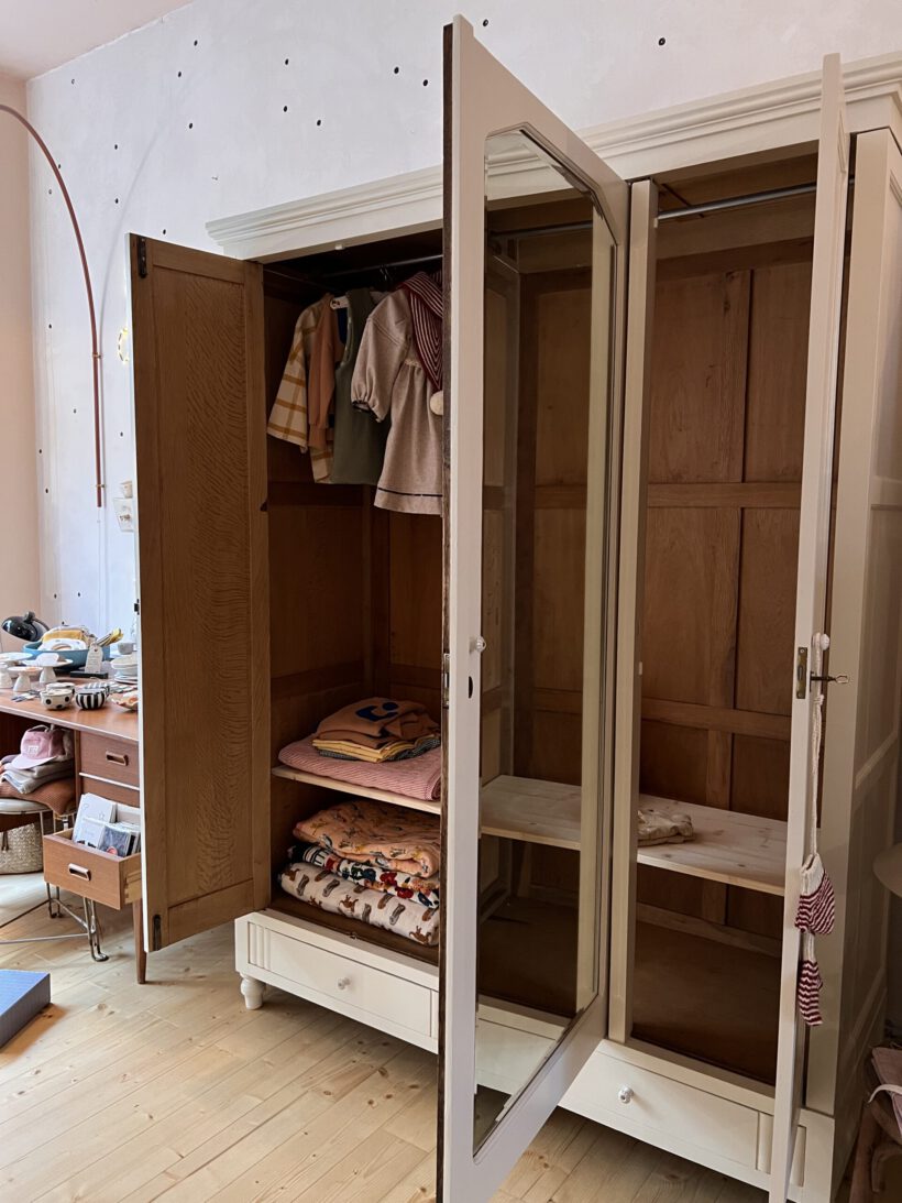 Kathi hat von uns nachträglich einen Böden montiert bekommen, in Fichtenholz unlasiert. Die Kleiderstange liegt im oberen Bereich des Schrankes.
