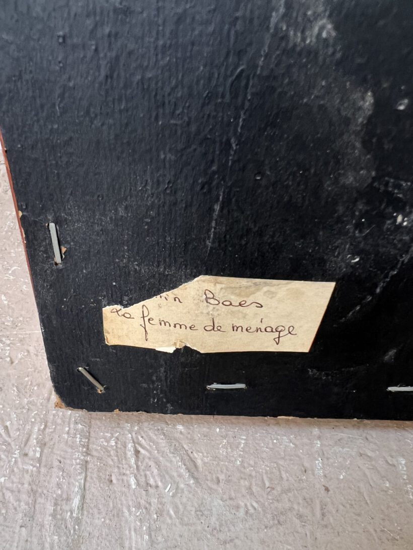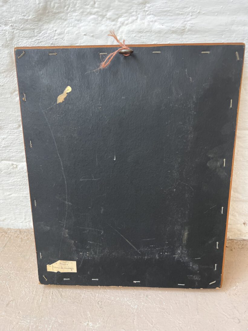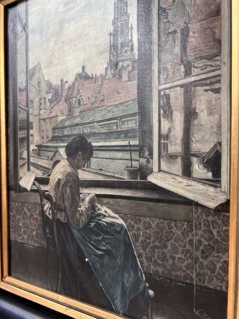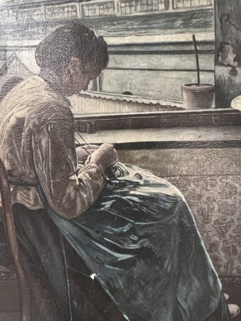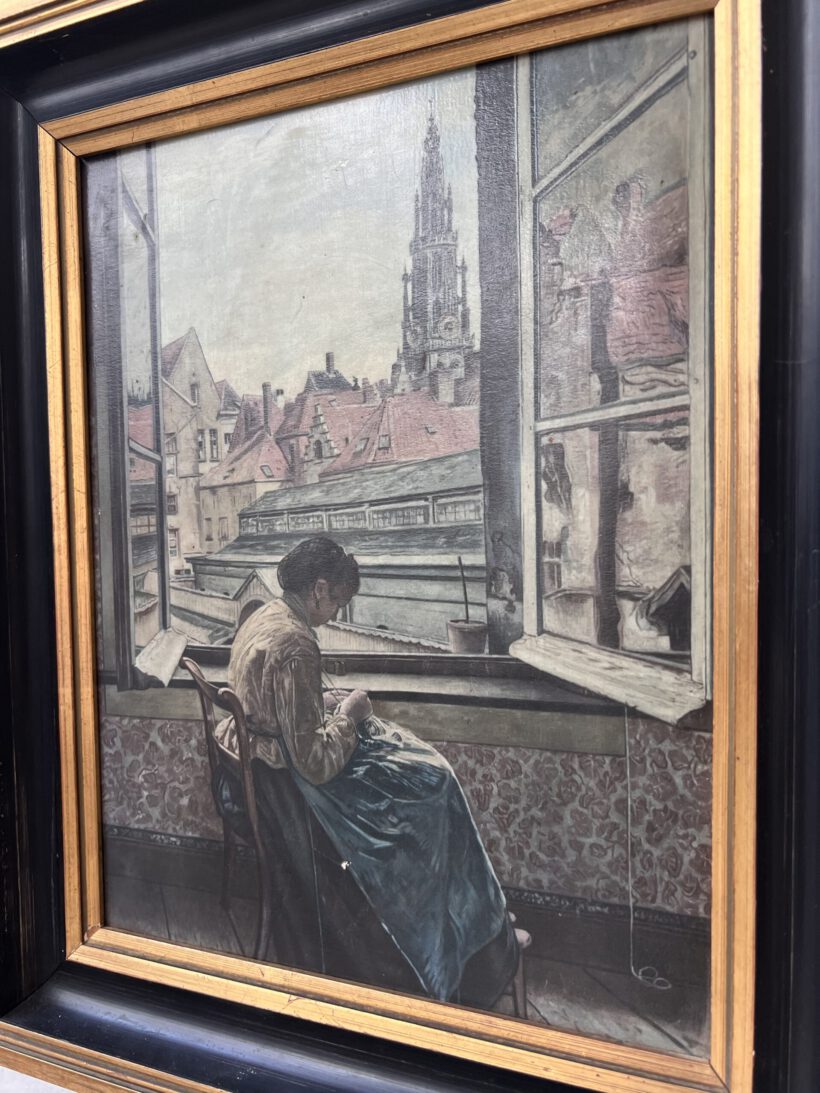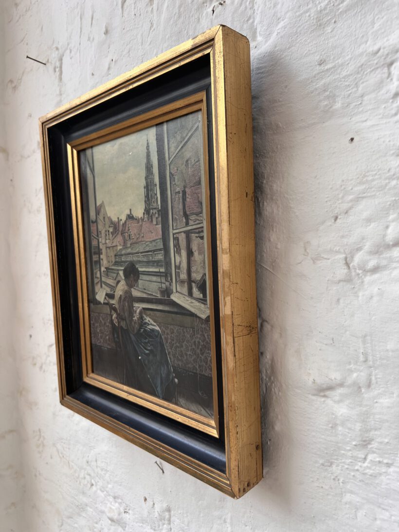 Wunderschöner antiker Kunstdruck der „La femme de menage“ – auf Deutsch das Dienstmädchen.Das Gemälde ist von einem sehr schönen alten gold-schwarz farbenem Holzrahmen umfasst.