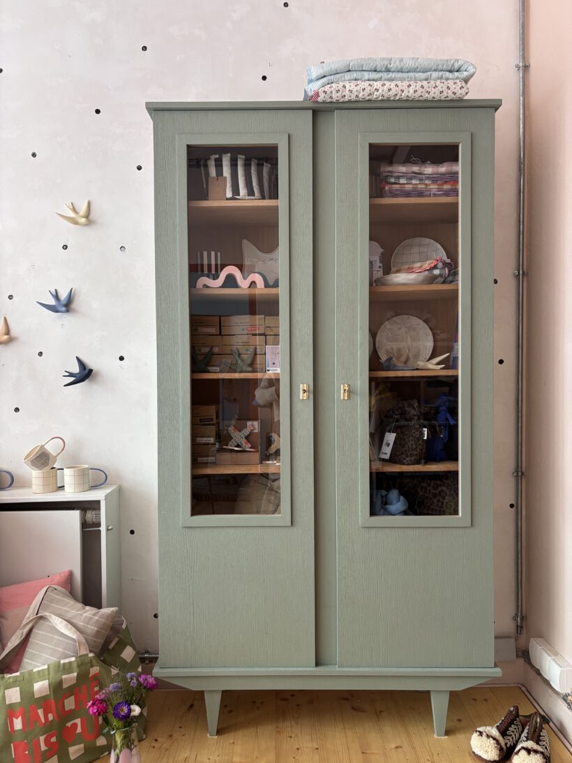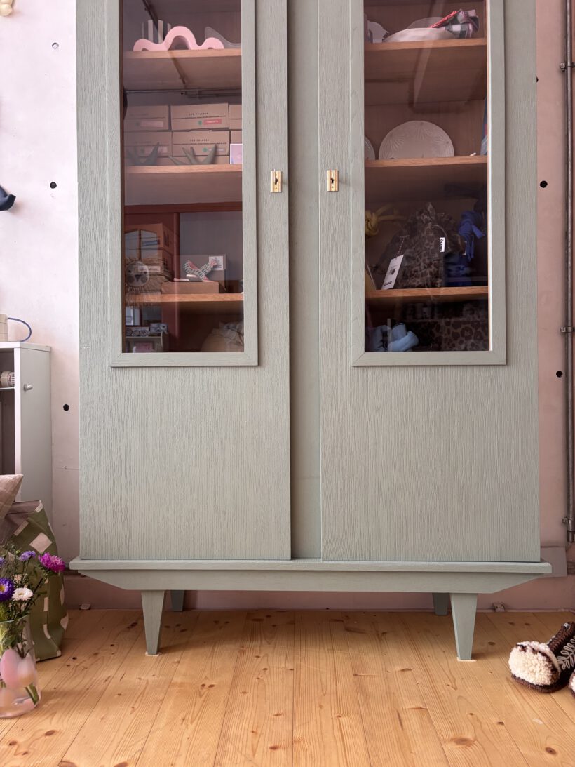 tolle Vitrine aus den 50er/60er Jahren. Hoch, schmal und nur 35 cm tief. Ein Allroundtalent.