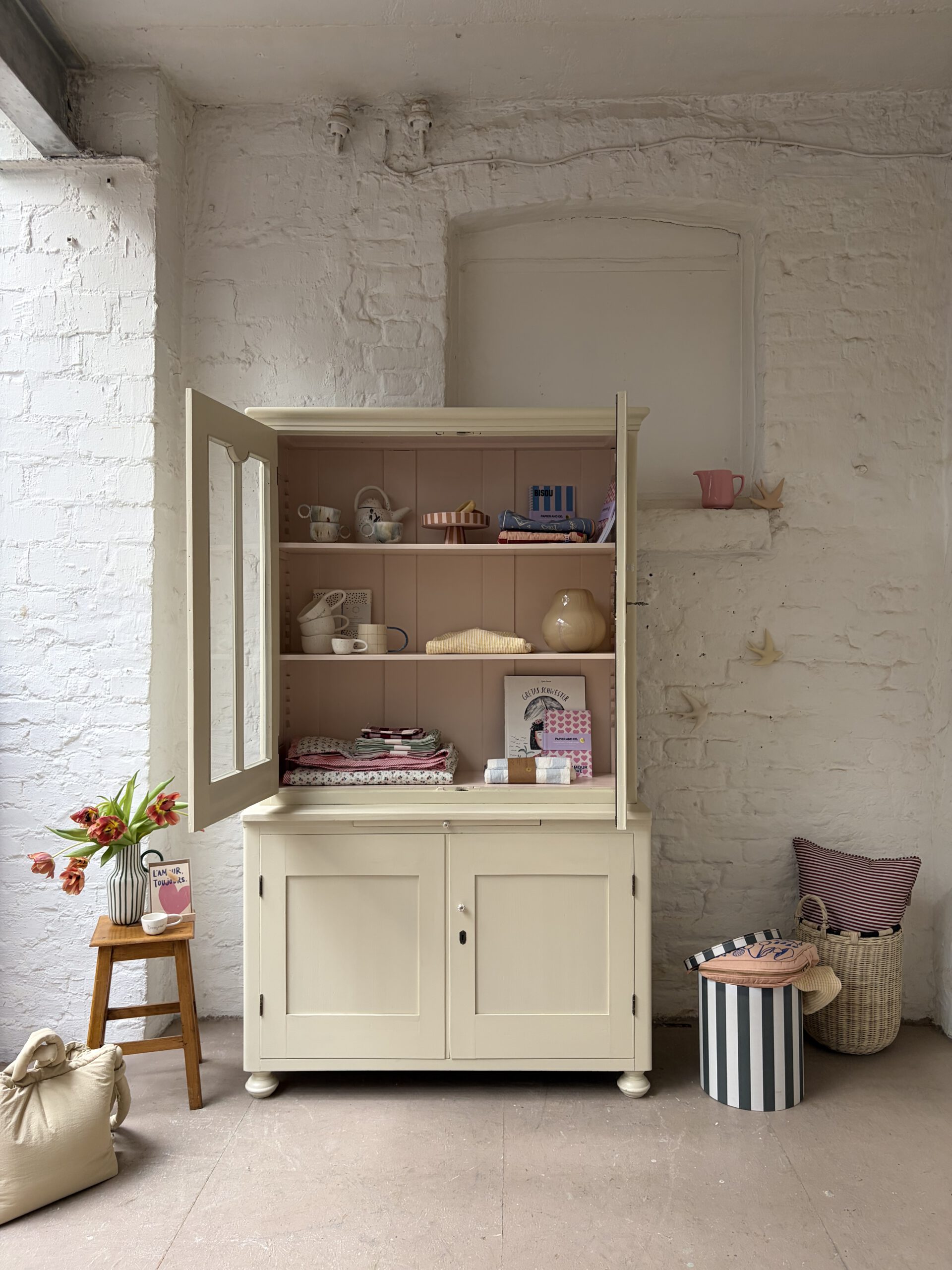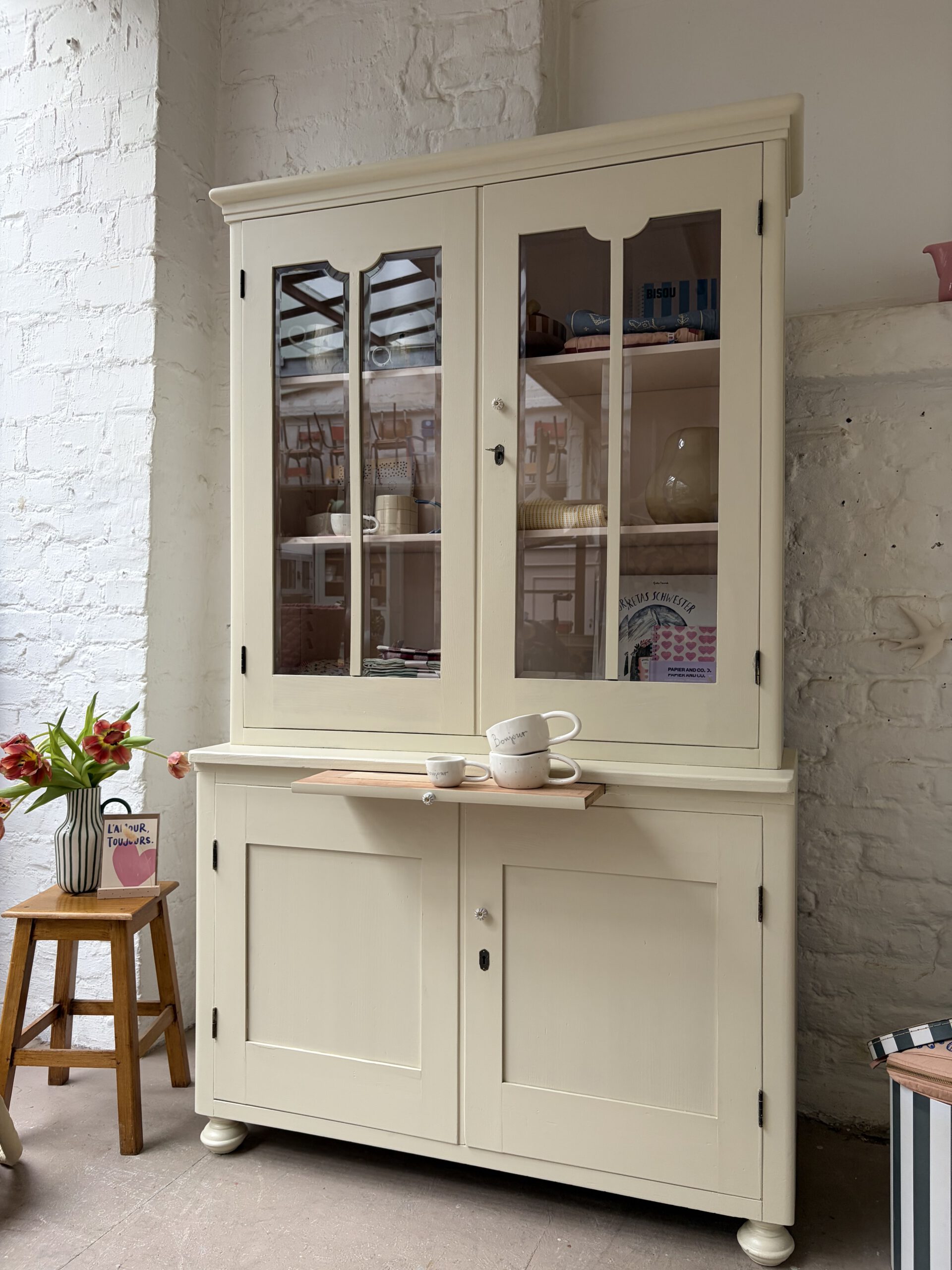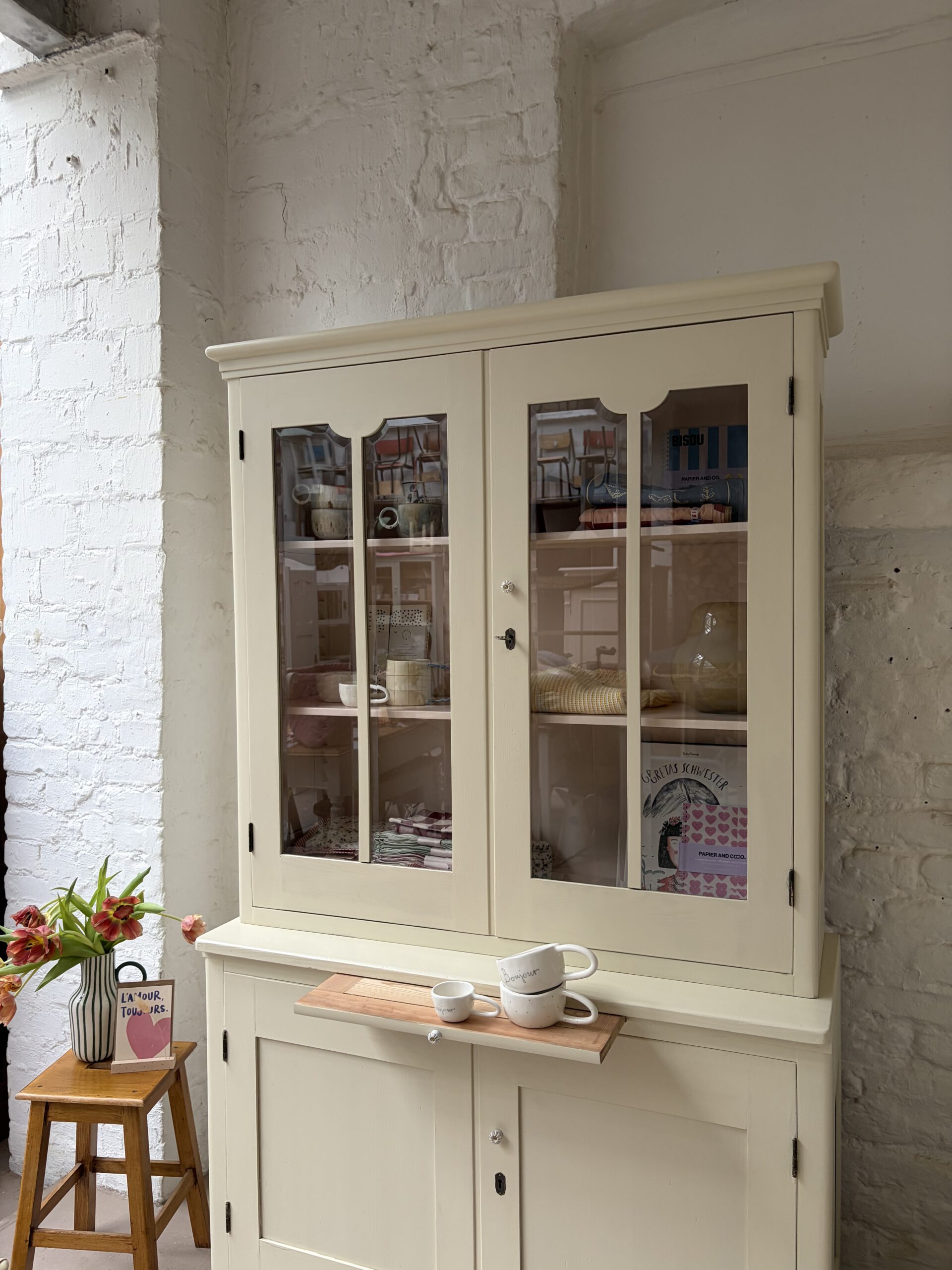 was ein besonderes Möbel! unten Kommode unten Vitrine. Einfach nur wunderschön und einzigartig. Für Lieselotte musste ein buttergelb her. Wir hatten aber kein, das uns gefiel. Also haben wir ein ungemischt aus Farrow and Ball Farben und innen im Vitrinenteil steckt ein schönes Apricotrosa. Wir lieben das Ergebnis und hoffen ihr auch. Kommode und Vitrinenteil sind trennbar und Lieselotte damit ein Möbel für jede Gelegenheit. Die Kommode trägt noch ein ausziehbares Tischlein – so süß!