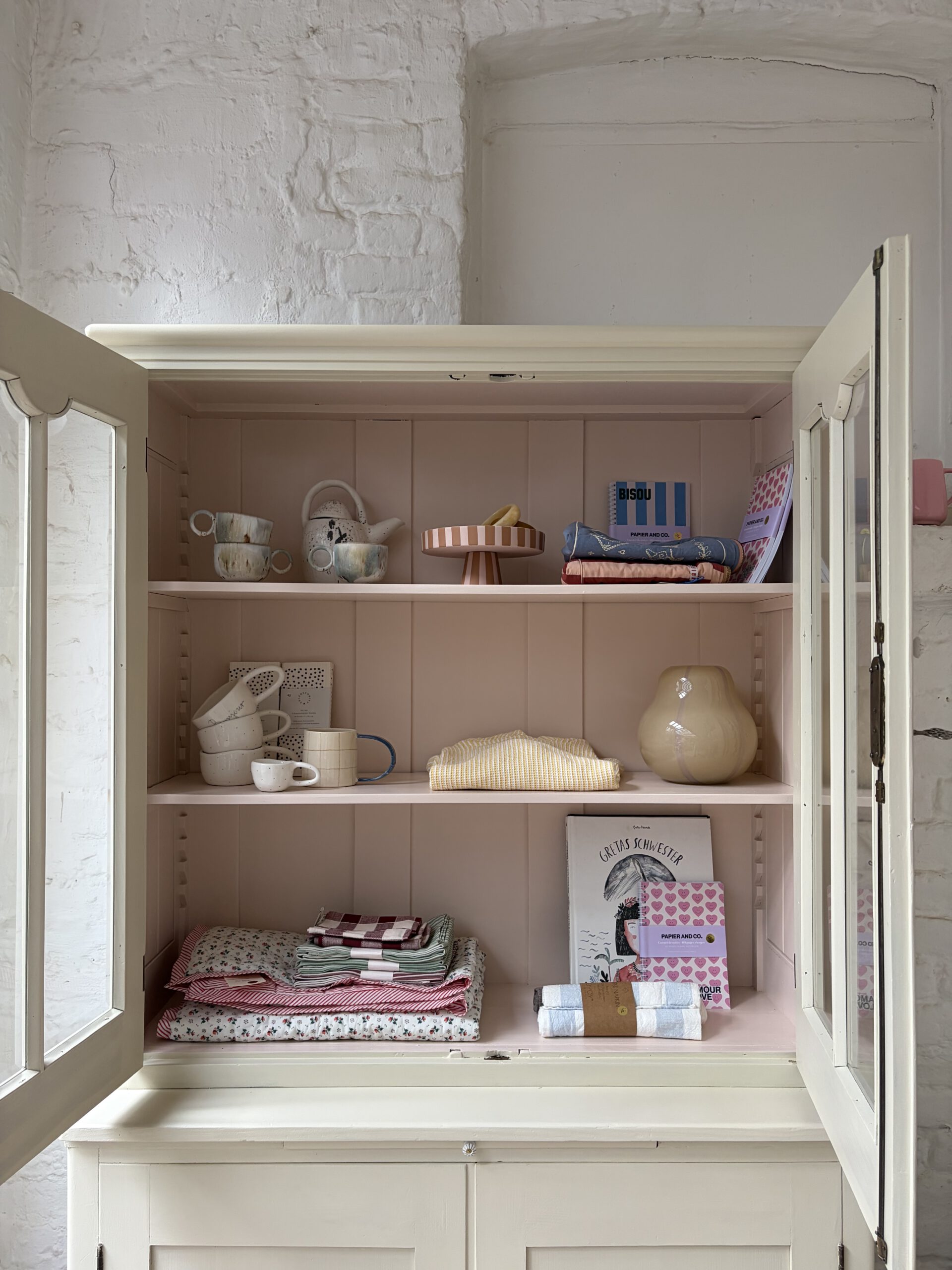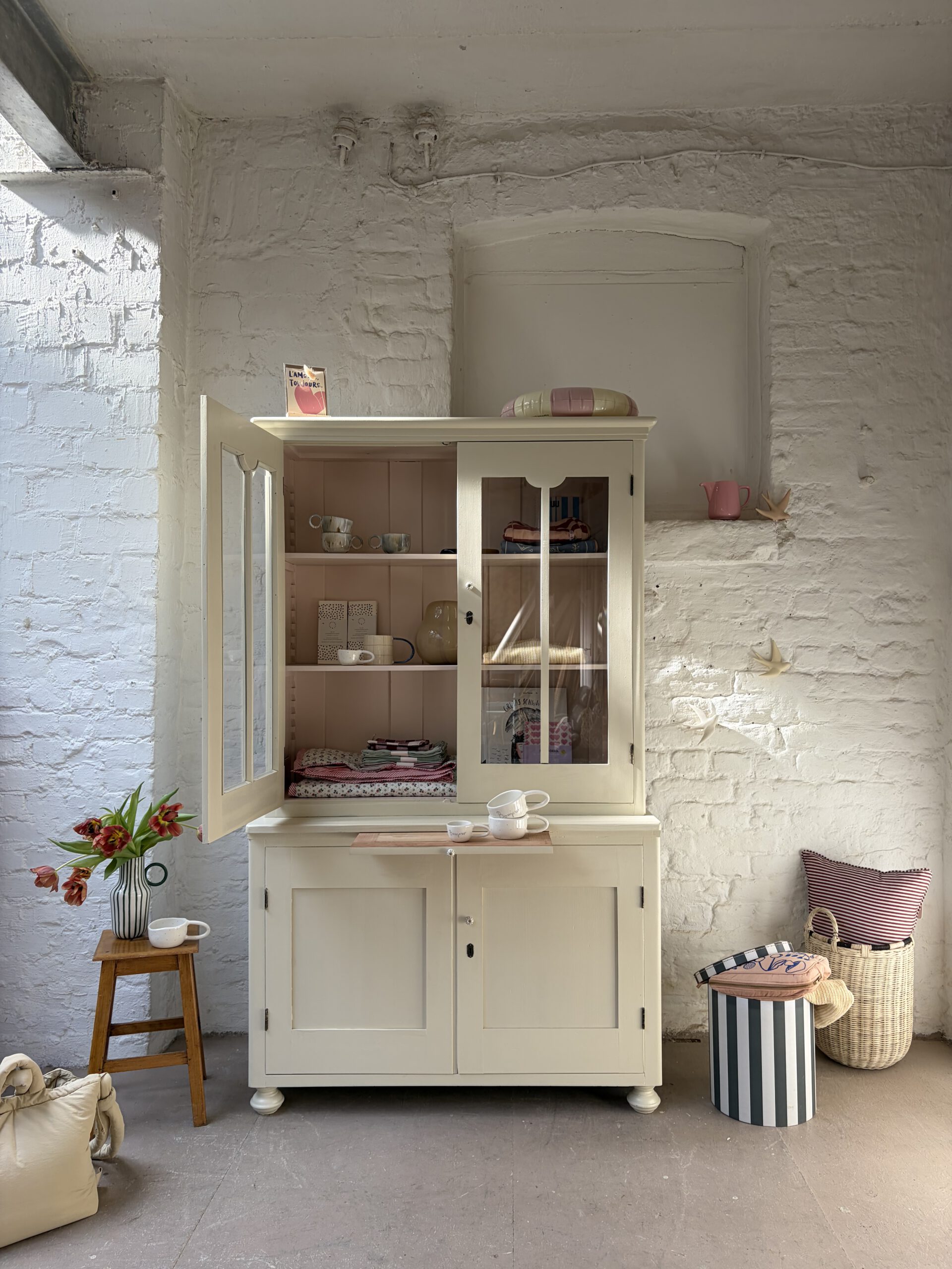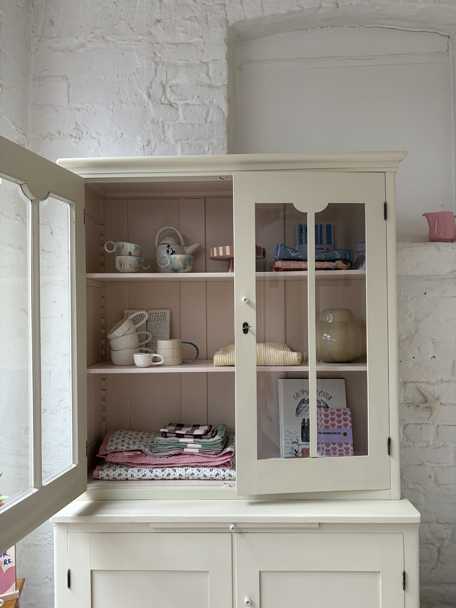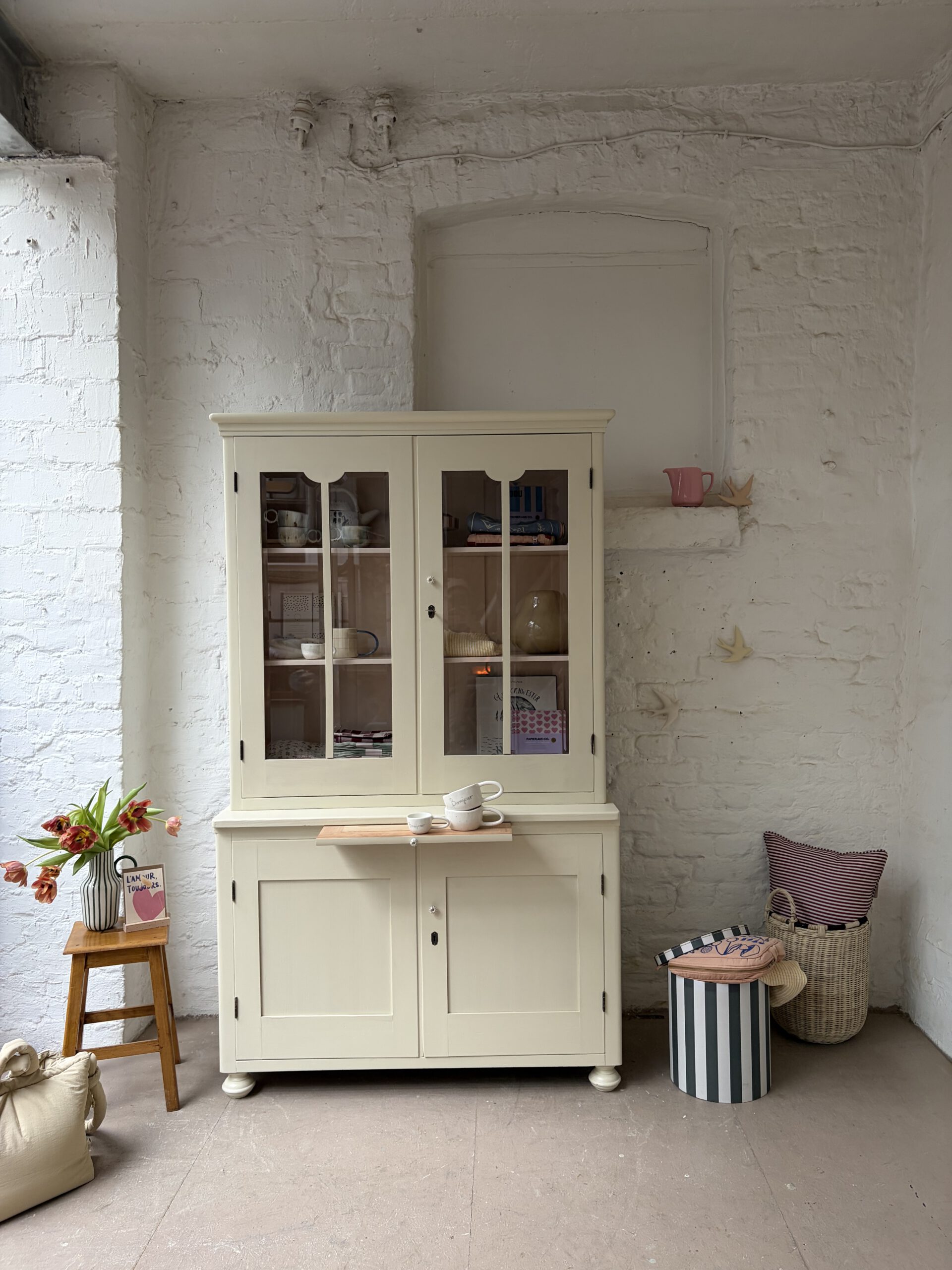 was ein besonderes Möbel! unten Kommode unten Vitrine. Einfach nur wunderschön und einzigartig. Für Lieselotte musste ein buttergelb her. Wir hatten aber kein, das uns gefiel. Also haben wir ein ungemischt aus Farrow and Ball Farben und innen im Vitrinenteil steckt ein schönes Apricotrosa. Wir lieben das Ergebnis und hoffen ihr auch. Kommode und Vitrinenteil sind trennbar und Lieselotte damit ein Möbel für jede Gelegenheit. Die Kommode trägt noch ein ausziehbares Tischlein – so süß!