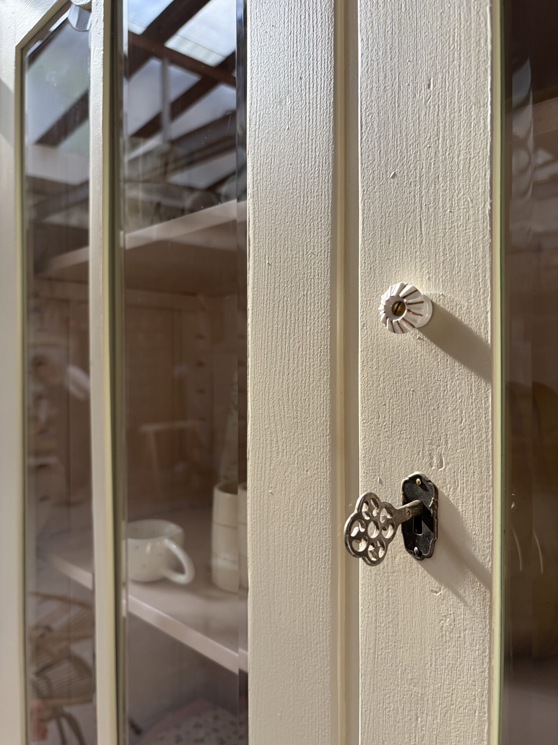 Die Böden im Vitrinenteil sind versetzbar. Die Beschläge und Keramikknöpfe neu. Unten schließt die Tür per Kugelschnapper oben mit Schlüssel.