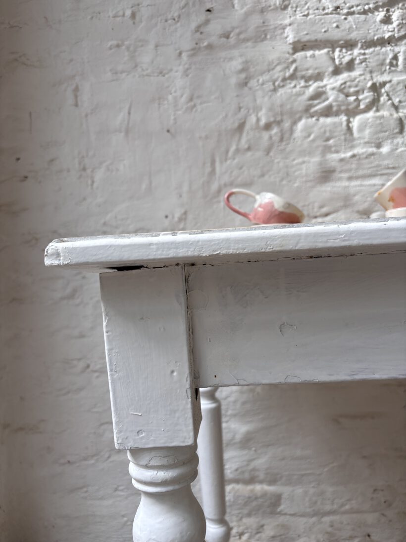 Wir haben sie genau so belassen wie sie ist. Sie war schon weiß, hat Patina aus vergangenen Zeiten, die wunderschön charmant ist. Hier und da gibt es kleine uralte Holzwurmspuren, die natürlich nicht mehr aktiv sind und Zeugen der Antiquität und des guten Holzes. Außerdem sieht man, dass Lisienne schon mehrere Farben getragen hat, an ihrer Patina – sehr schön! Die Tischplatte haben wir noch einmal weich geschliffen und versiegelt.