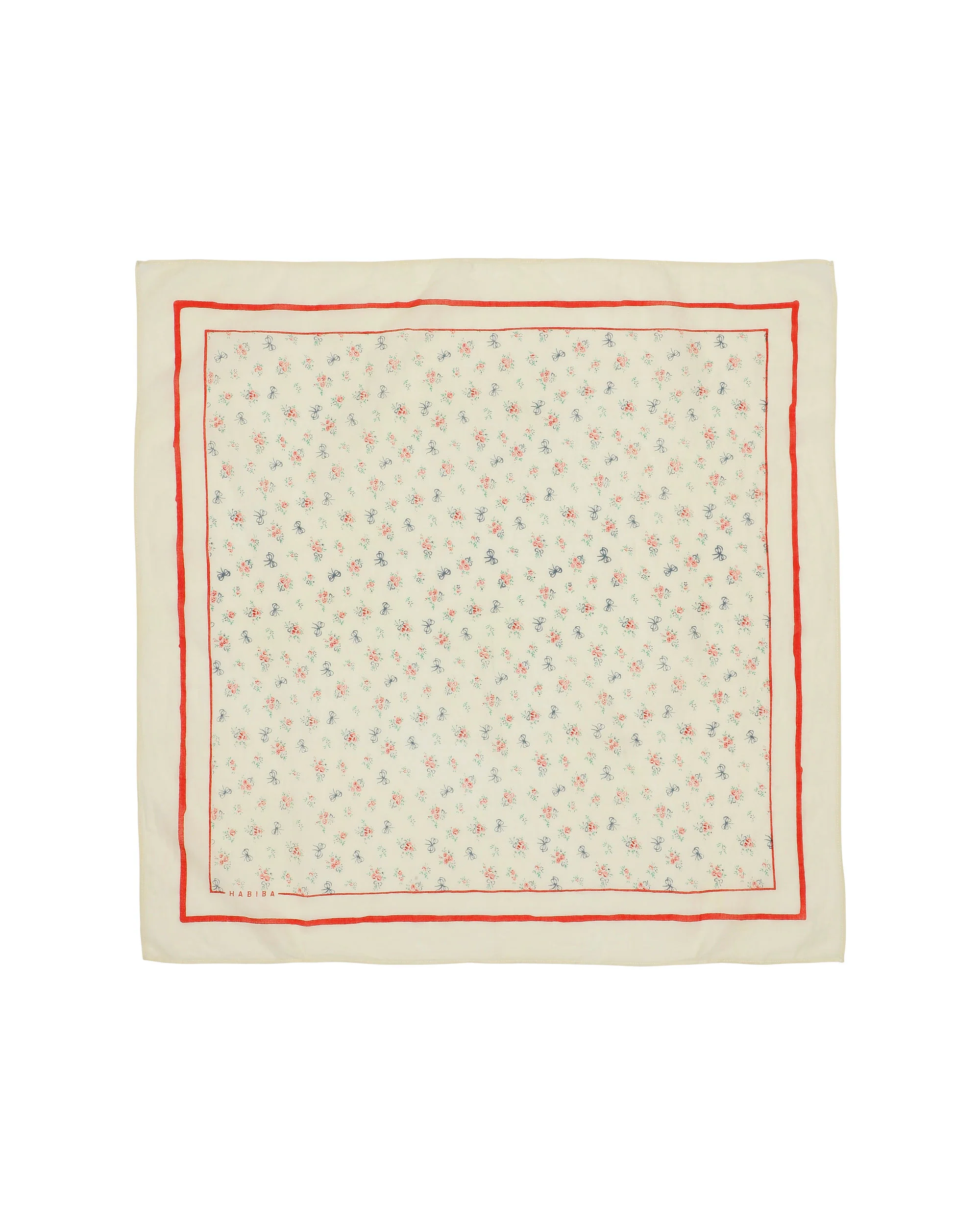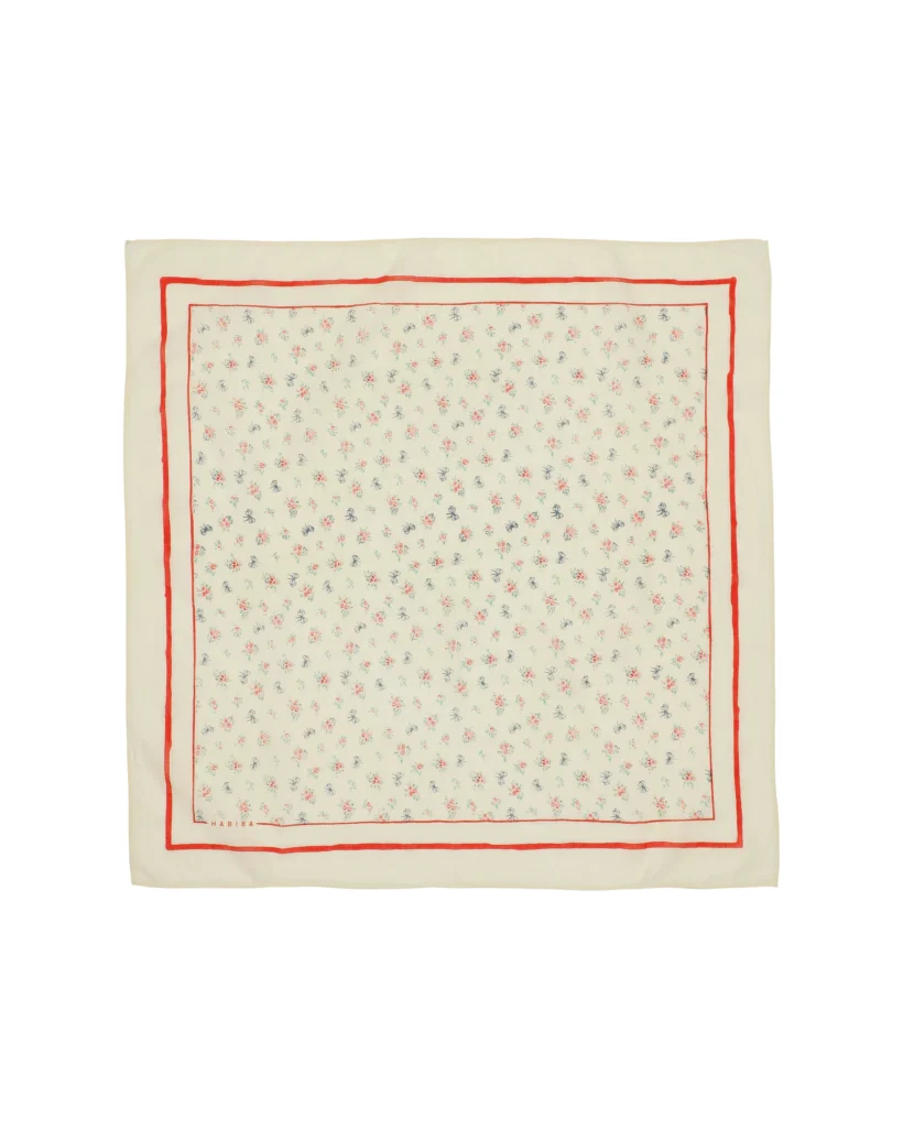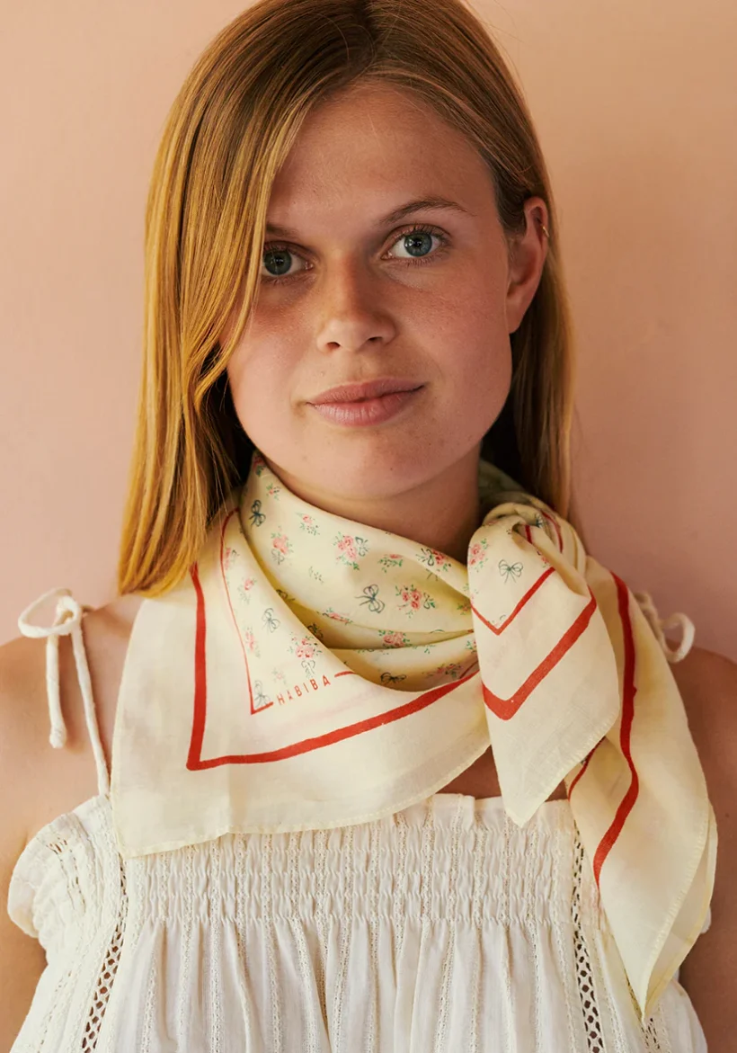 Perfekt für den Sommer. Das Halstuch hat einen schönen kleinen Druck mit kleinen Blumen und Schleifen in frischer Farbe. Der handgezeichnete Rand mit dem kleinen Logo macht es sehr persönlich – mit Liebe von HABIBA.
