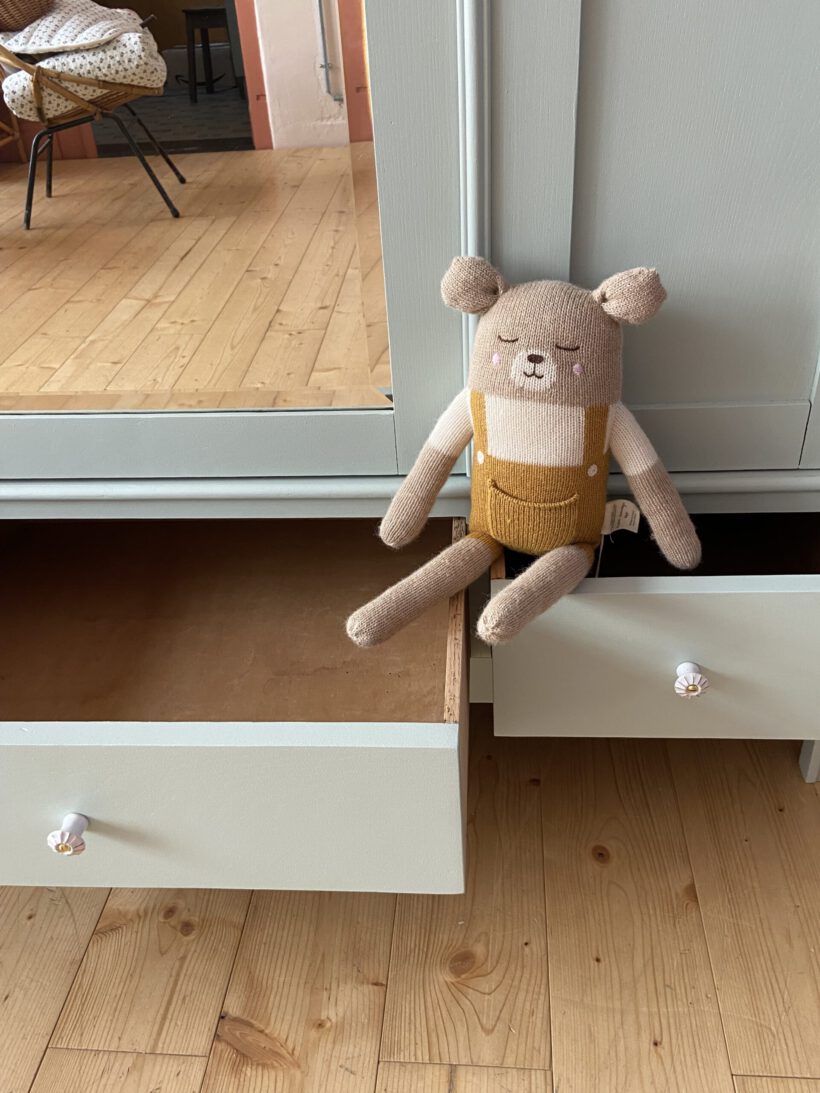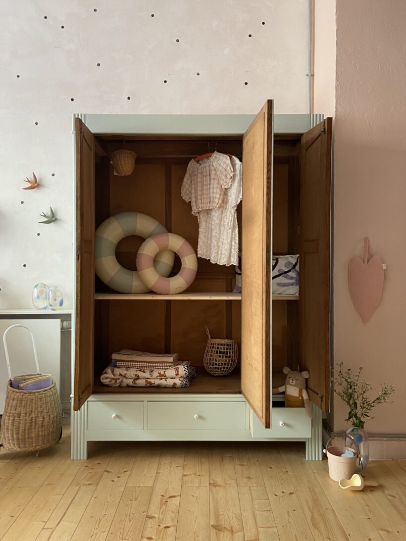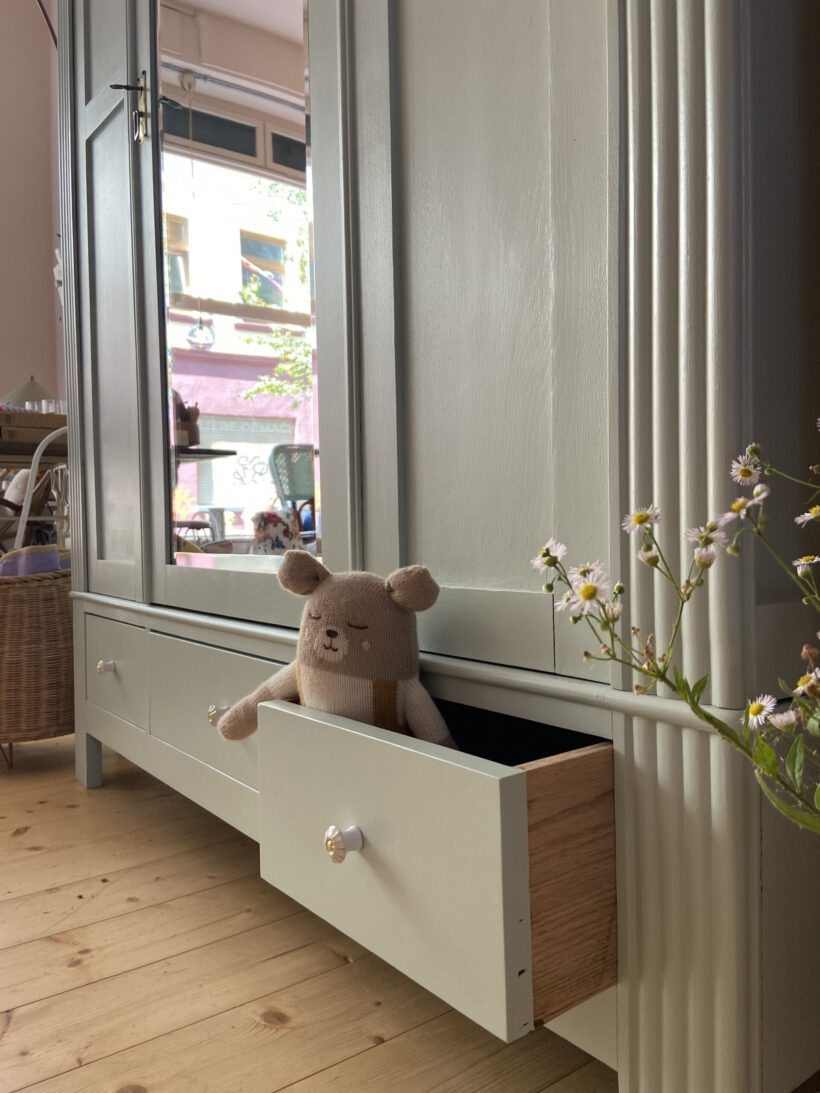 Innen hat Livie eine Kleiderstange und einen Einlegeboden, den wir nachträglich eingebaut haben. Er unterscheidet sich farblich von dem Eichenholz des Inneren des Schrankes.