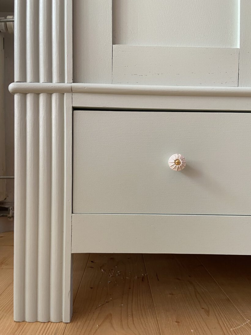 Wir haben Livie restauriert, geschliffen und grundiert, sowie zwei Mal lackiert und sie in ein zartes minigrün von Farrow and Ball getaucht.