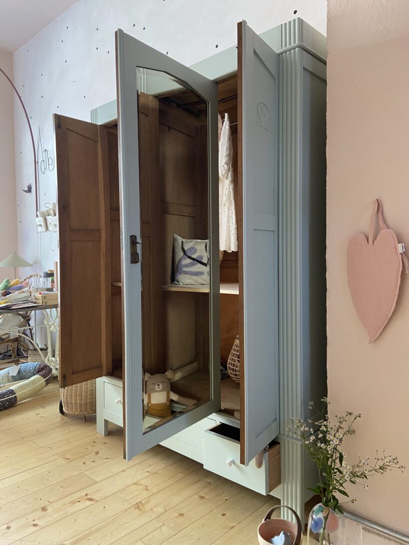 Livie ist ein antiker Spiegelsteckschrank aus Frankreich aus den 1920er Jahren. Sie hat ein wunderschönes Design: zarte dezente Blumenschnitzereien, schöne halbrunde Profilleisten und einen geschliffenen Spiegel in der Tür- ein Traum. Alles ist noch original erhaltenen und benötigte lediglich etwas Liebe bei der Restaurierung 😉 Sogar das Schloss schließt einwandfrei mit dem noch vorhandenen Schlüssel.