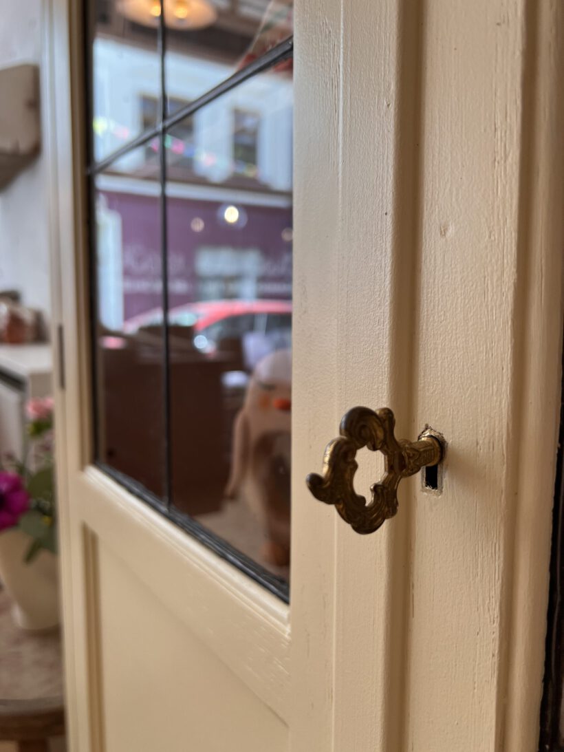 Innen hat sie von uns ein zartes rosa von Farrow and Ball bekommen und außen ein helles pastellgelb. Dafür wurde sie innen und außen geschliffen, grundiert und 2.mal lackiert. Der alte schöne Schlüssel ist noch vorhanden und funktioniert gut.