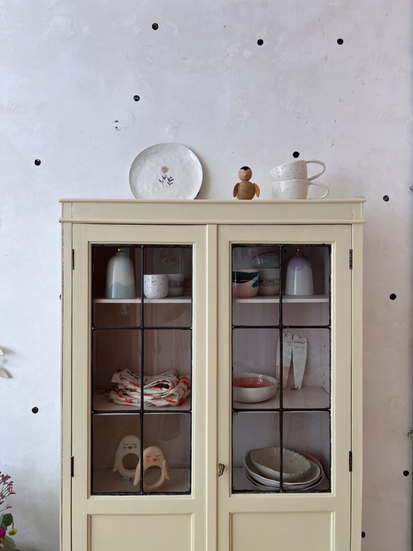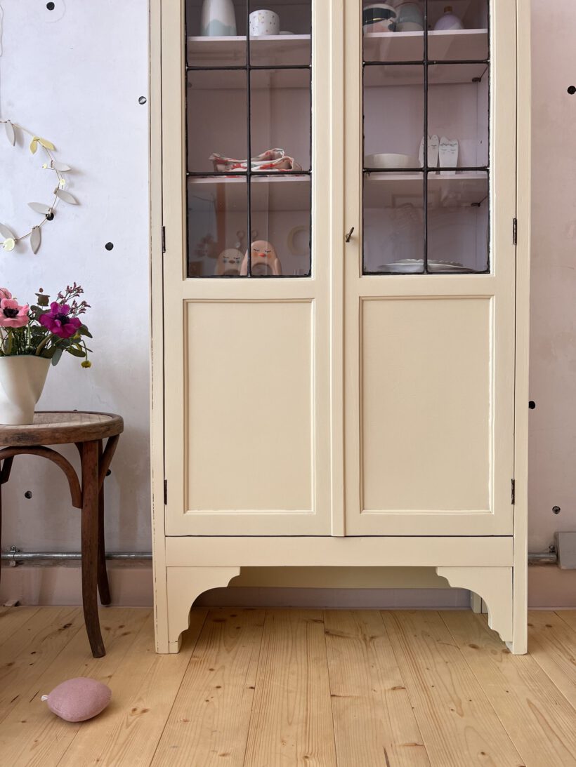 unsere wunderhübsche so besondere neue Vitrine! Lizzie ist sehr schmal, sie ist gerade mal 24,5 cm tief und wir lieben schmale Möbel, da man sie so gut wie in jedem Raum einsetzen kann. Sie hat noch ihre alten bleiverglasten Fenster und so zauberhafte Füße.