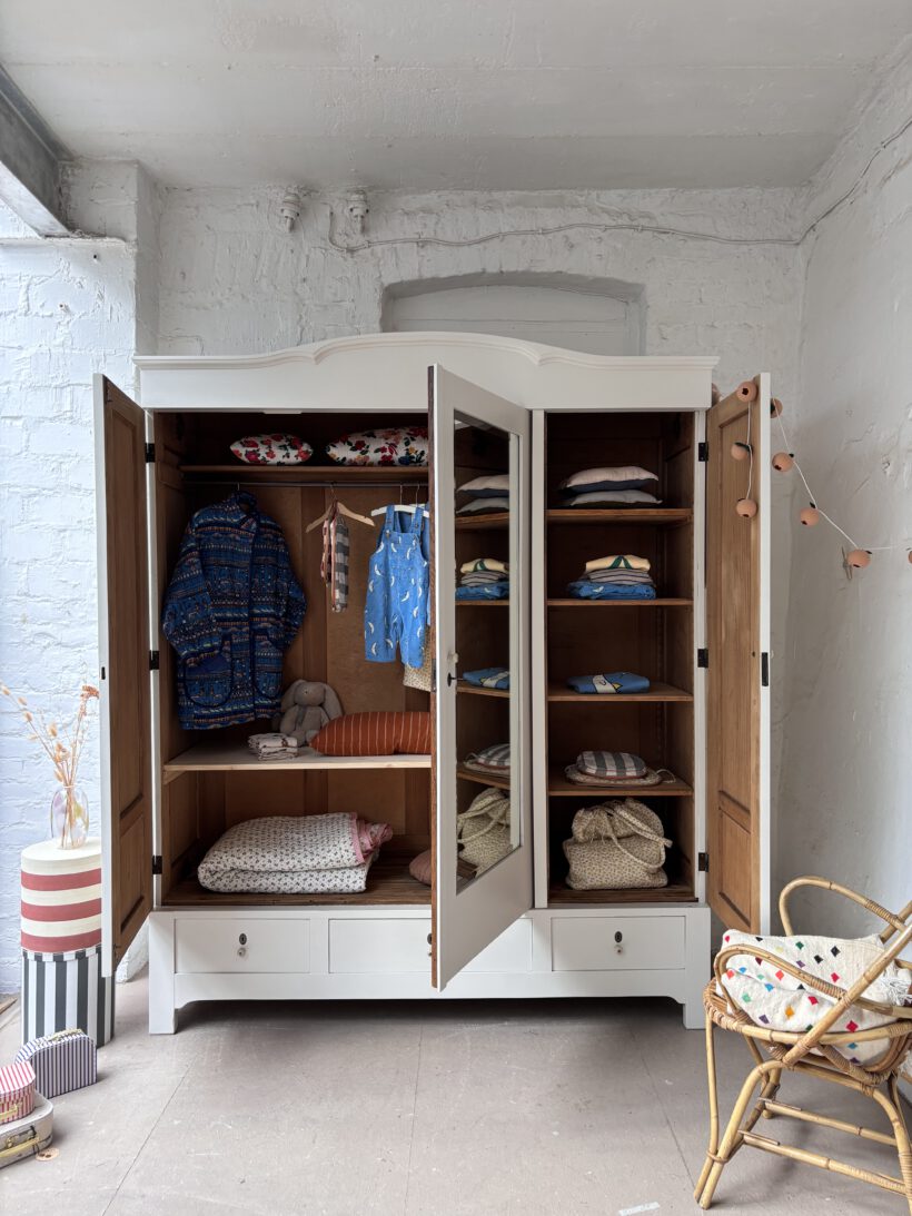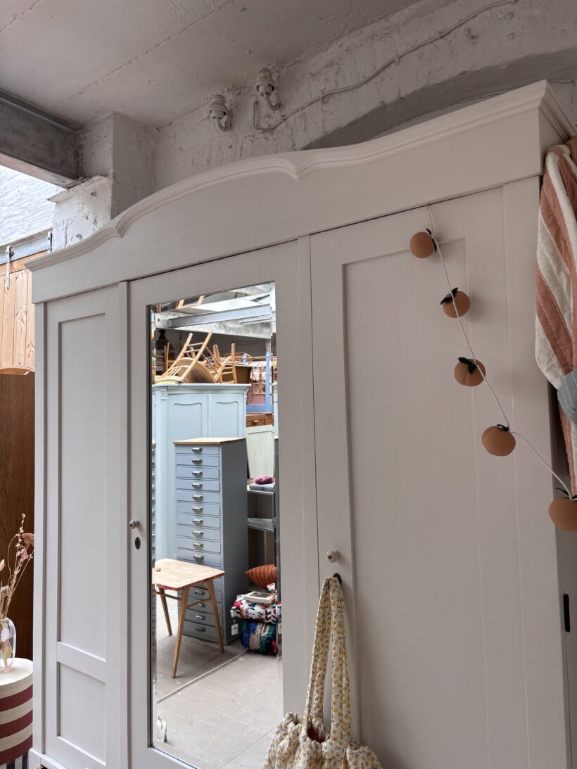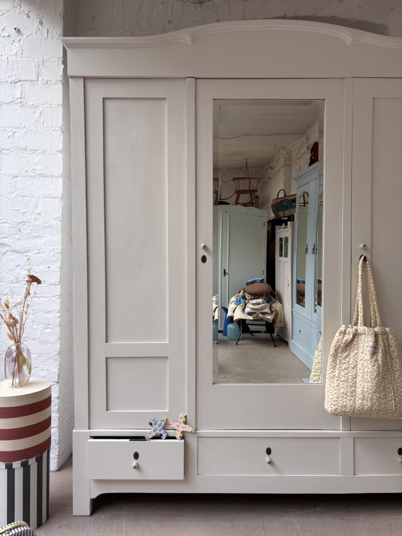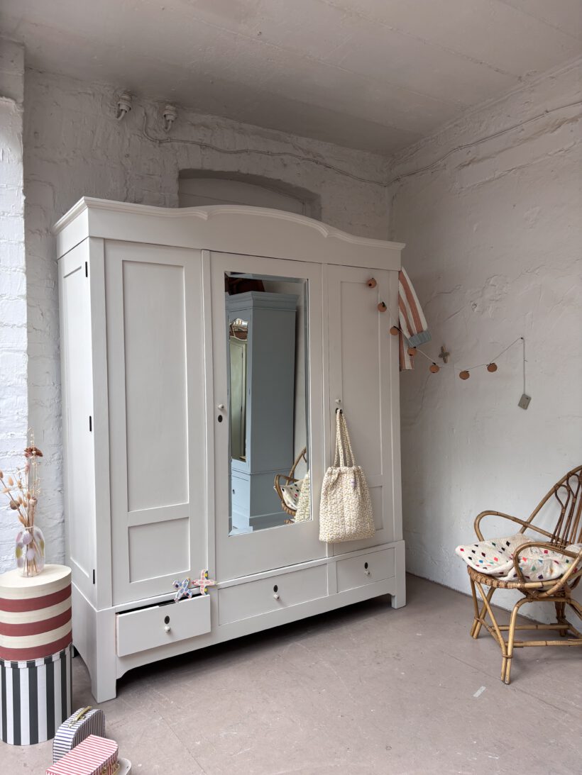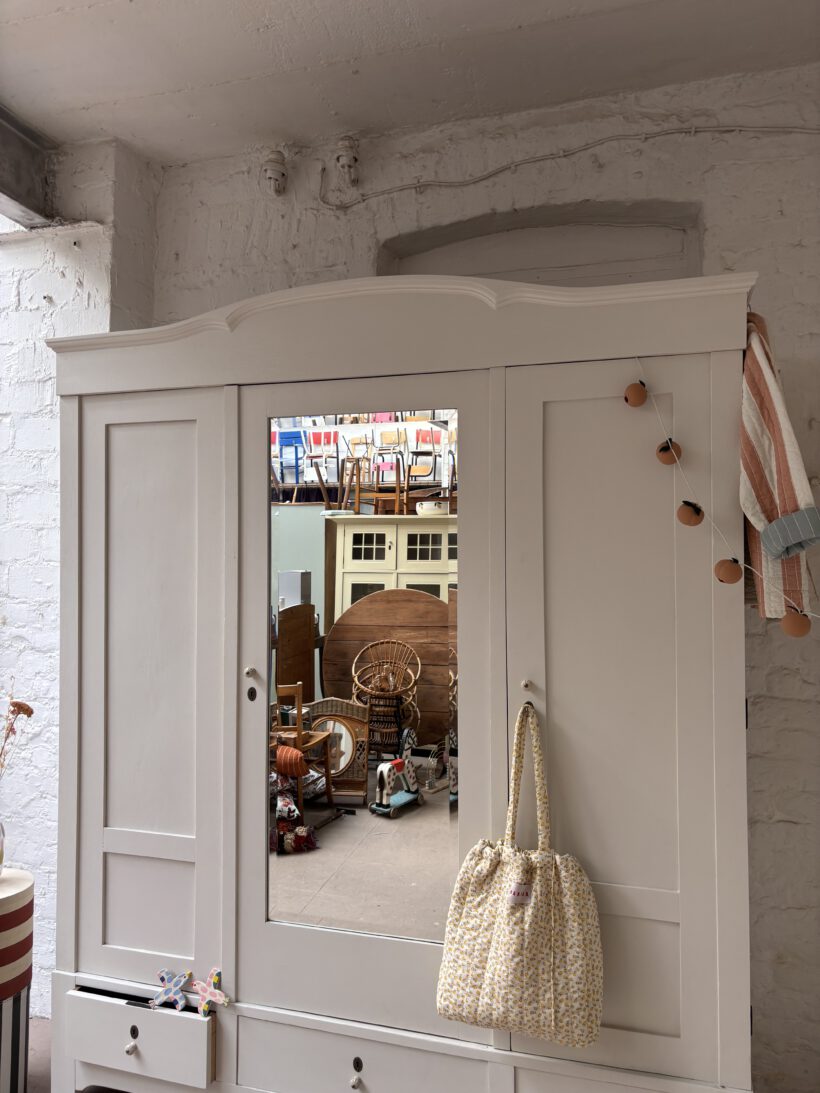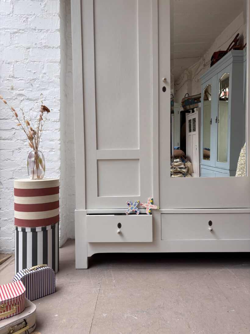 Lore ist ein antiker Steckschrank aus den 30er Jahren. Sie ist zeitlos schlicht und gleichzeitig besonders, denn sie trägt eine abgerundete Krone, sowie drei charmante Schubladen und einen großen Facettenspiegel. Lore ist sehr geräumig, bietet wahnsinnig viel Platz und ist dabei einfach nur bezaubernd. Hinter der rechten Türe hat sie 5 Legefächer. Links zwei Legefächer unter der Stange und einen kleinen halben Boden über der Stange. Lore hat einen Schlüssel der beide Türen schließt und öffnet.
