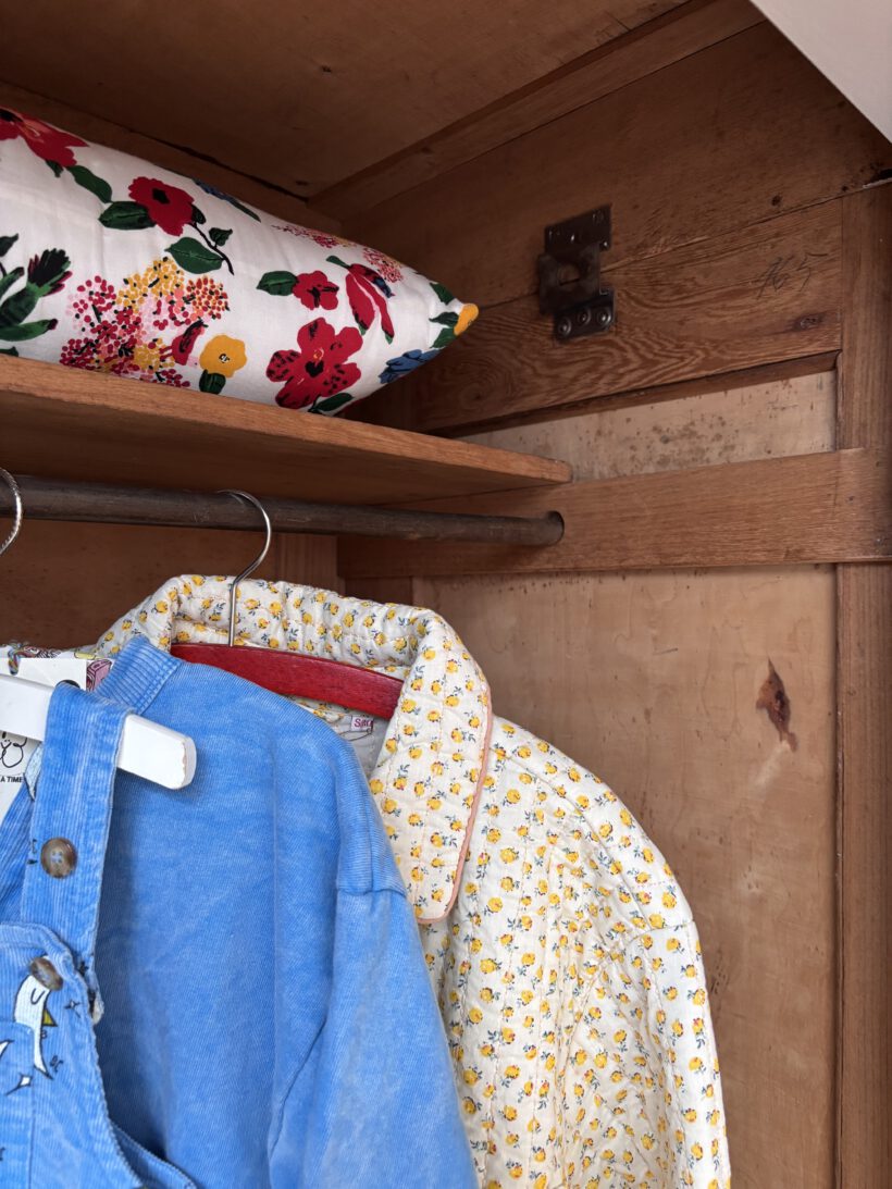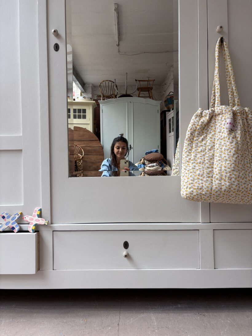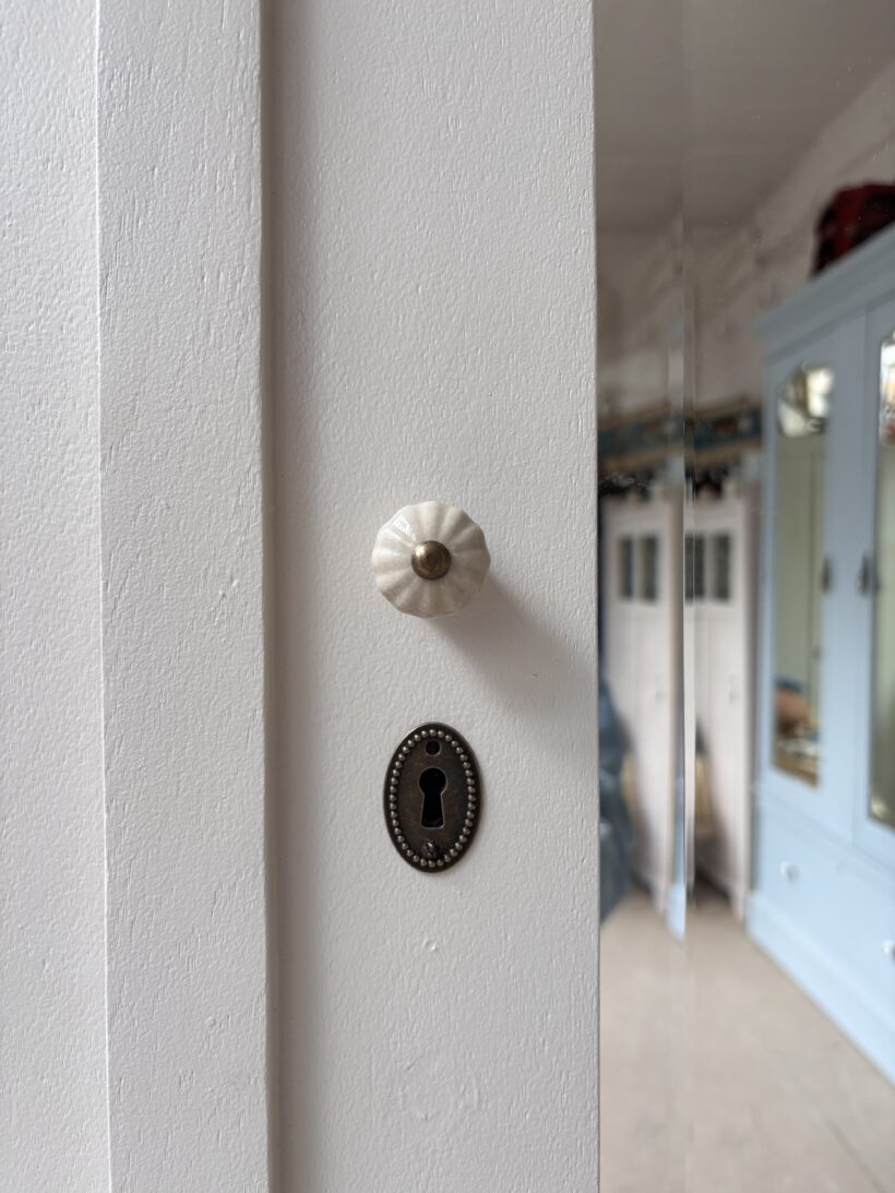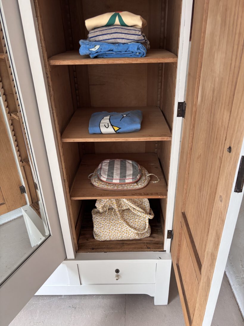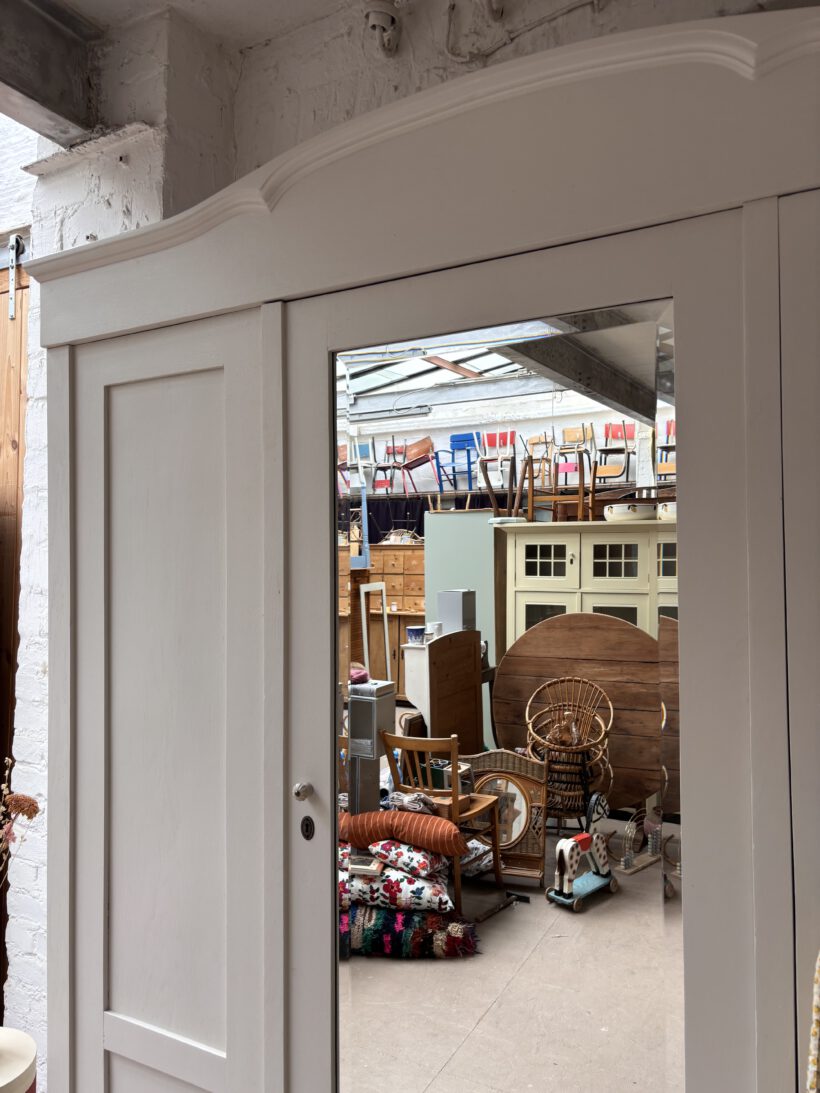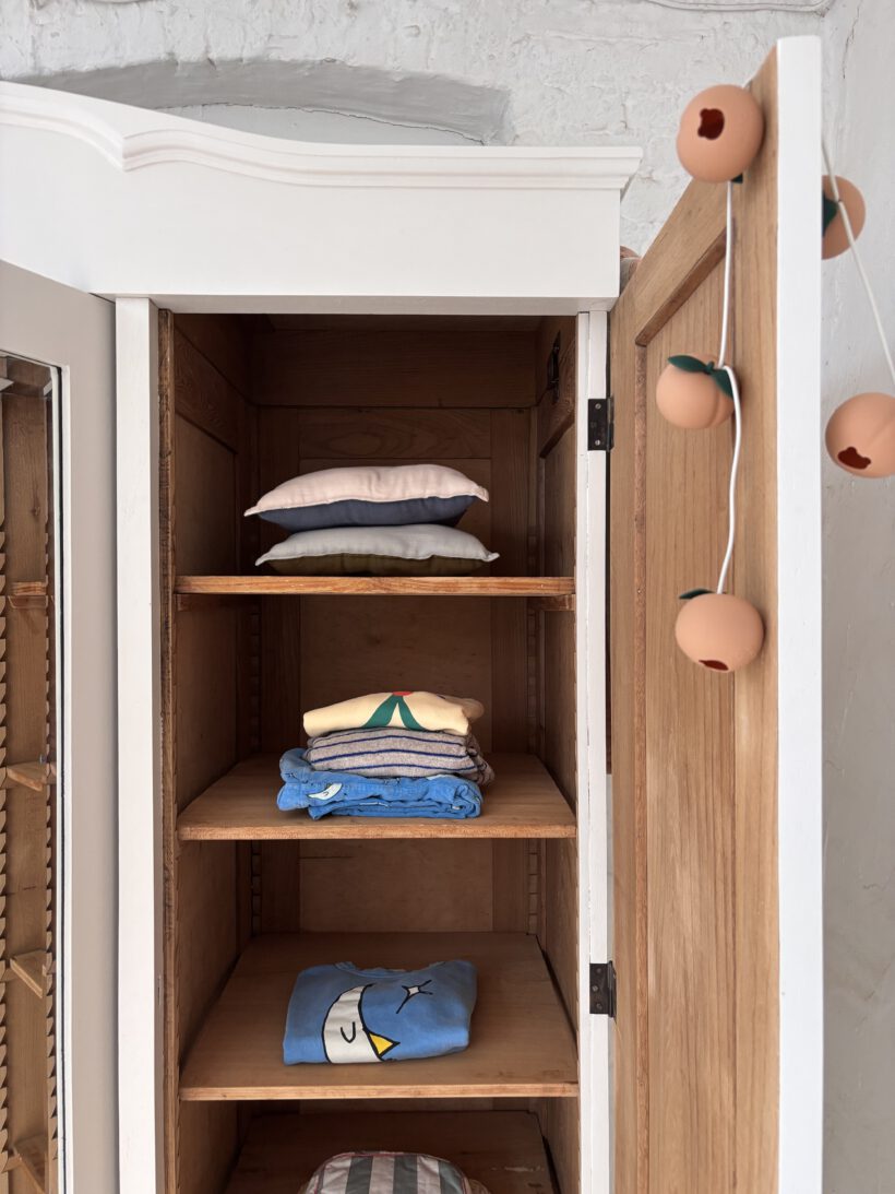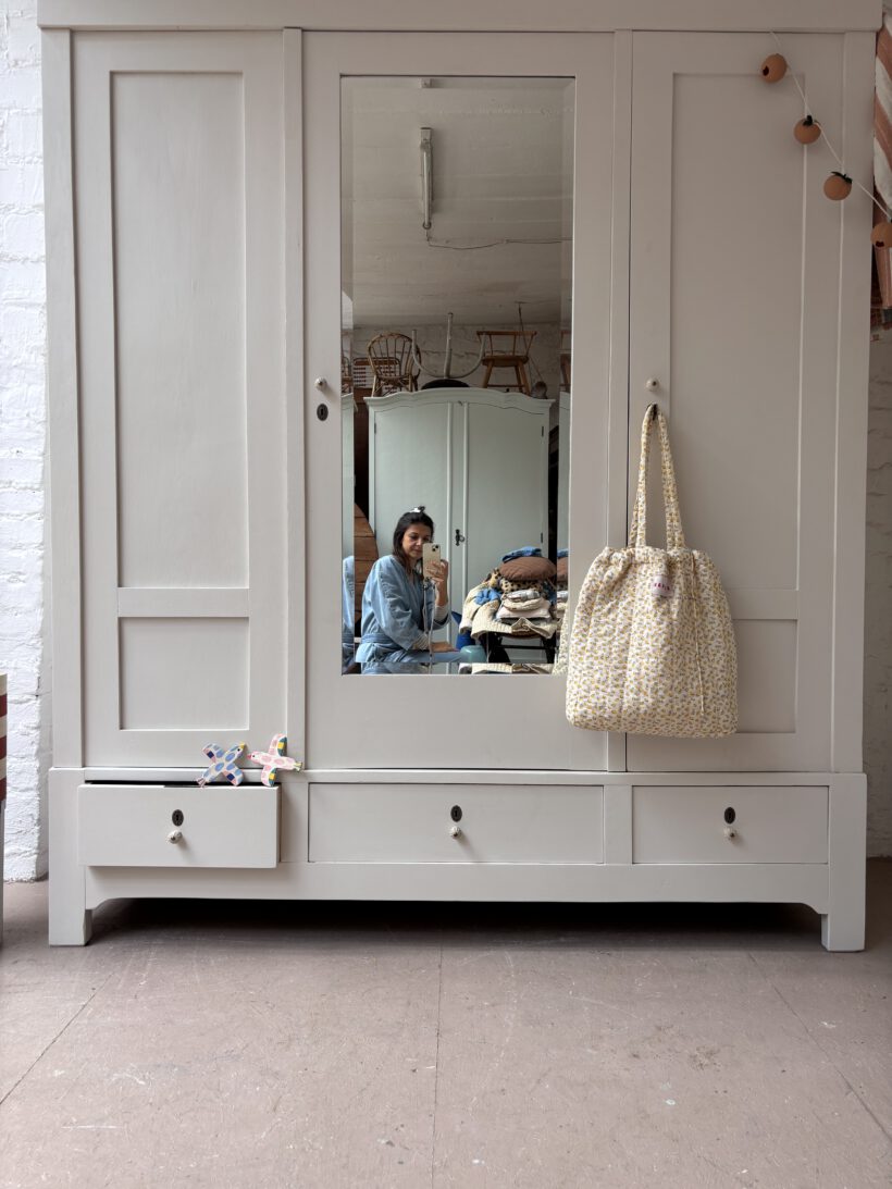 Lore ist ein antiker Steckschrank aus den 30er Jahren. Sie ist zeitlos schlicht und gleichzeitig besonders, denn sie trägt eine abgerundete Krone, sowie drei charmante Schubladen und einen großen Facettenspiegel. Lore ist sehr geräumig, bietet wahnsinnig viel Platz und ist dabei einfach nur bezaubernd. Hinter der rechten Türe hat sie 5 Legefächer. Links zwei Legefächer unter der Stange und einen kleinen halben Boden über der Stange. Lore hat einen Schlüssel der beide Türen schließt und öffnet.