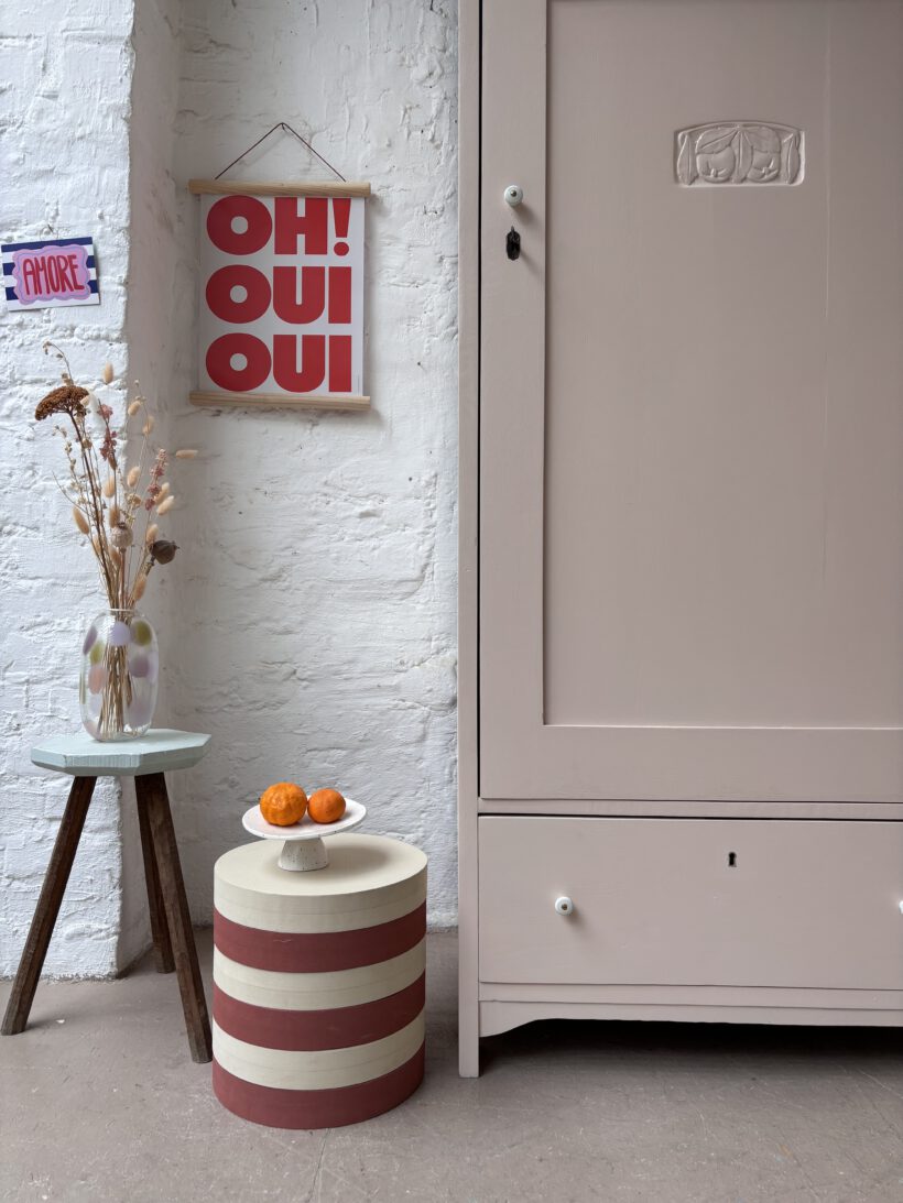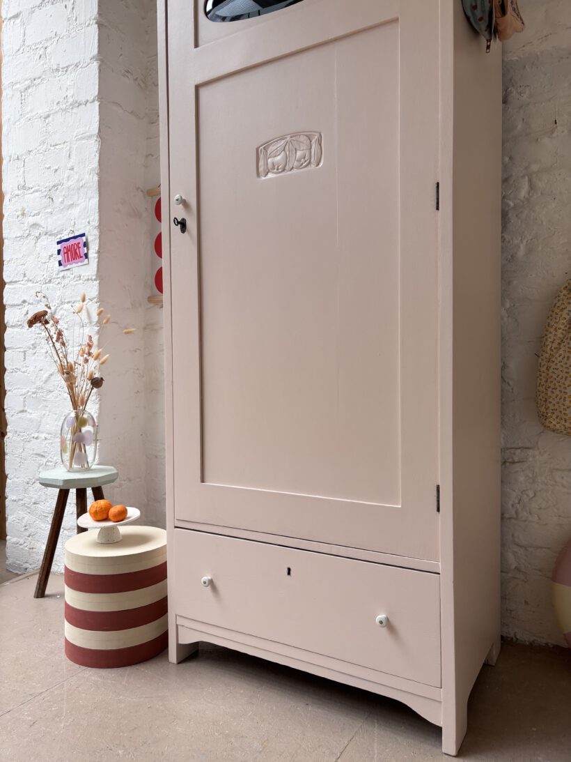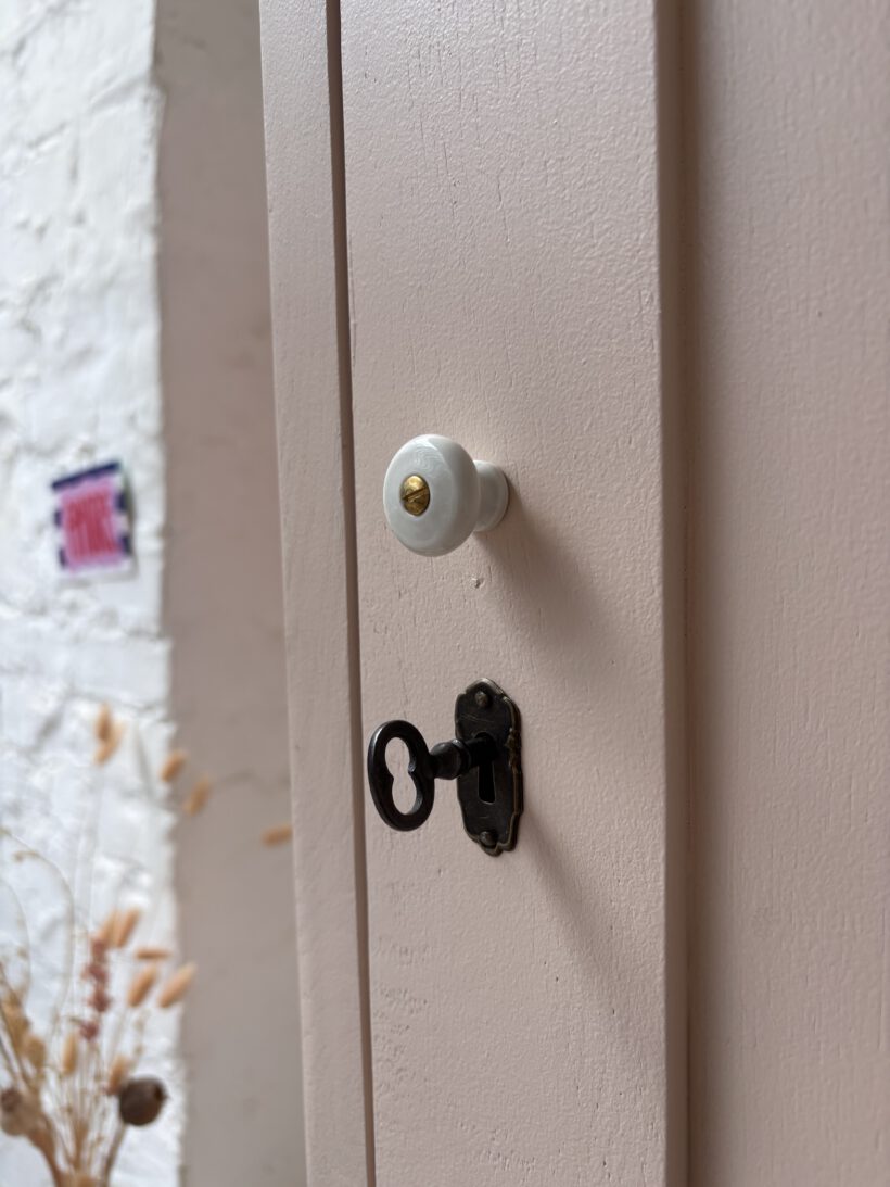 Lotta trägt ein wunderschönes Apricot-Rosa von Farrow and Ball bekommen. Dafür wurde ihr Holz komplett geschliffen, grundiert und zwei Mal lackiert. Der Schlüssel für die Tür ist vorhanden und schließt wunderbar. Für die Schublade gibt es leider keinen mehr. Dafür öffnet und schließt auch diese wunderbar;-)
