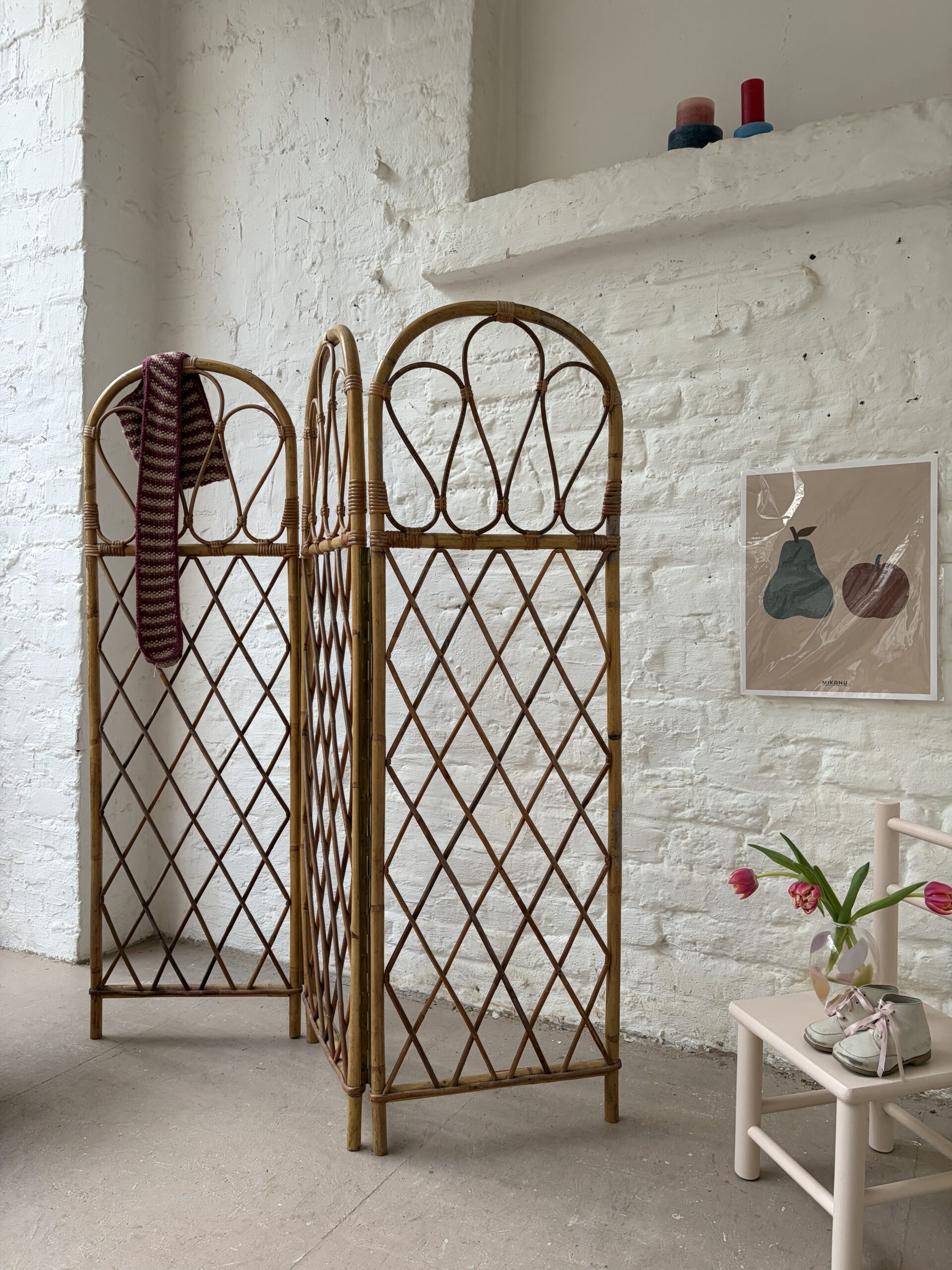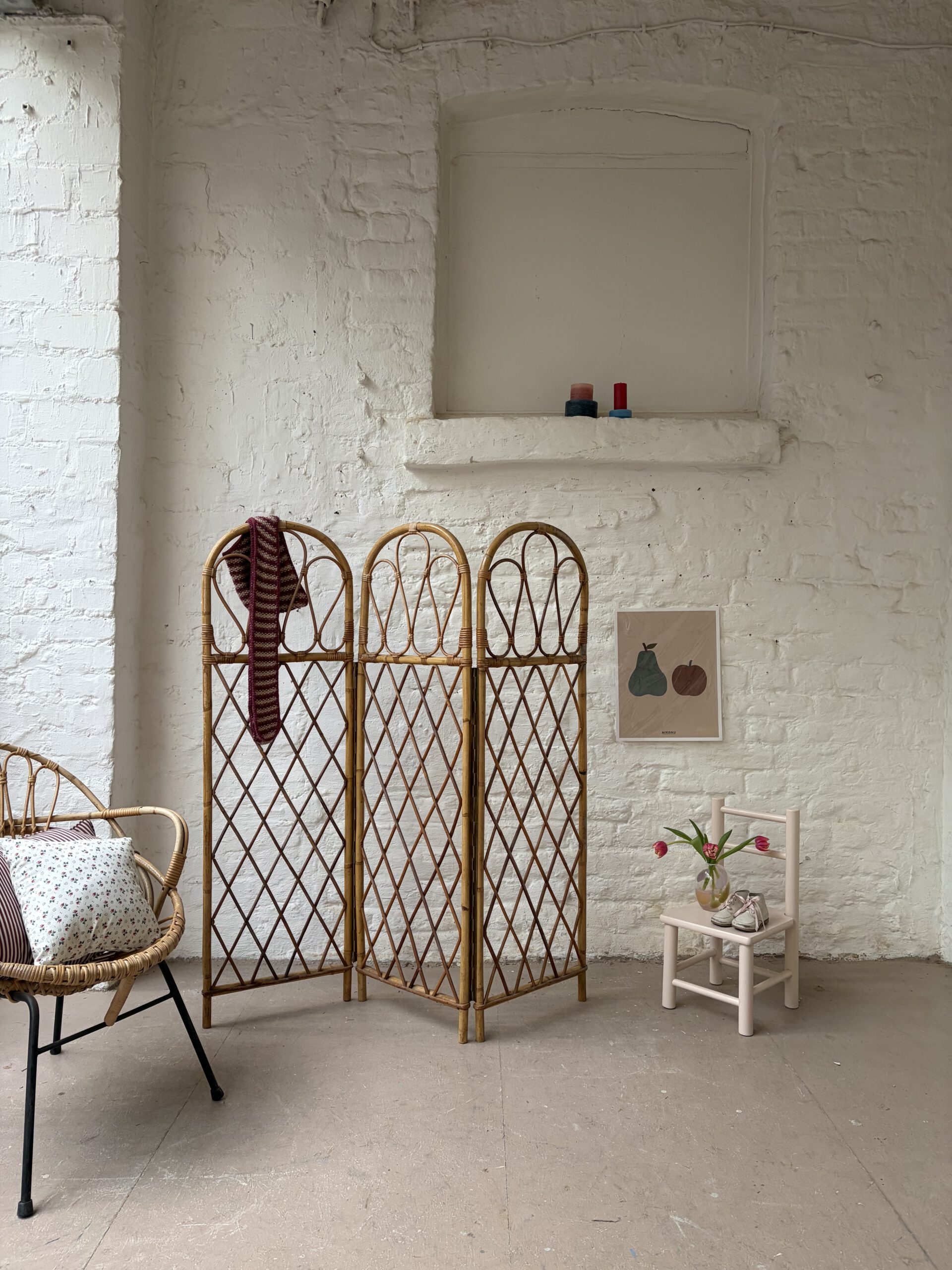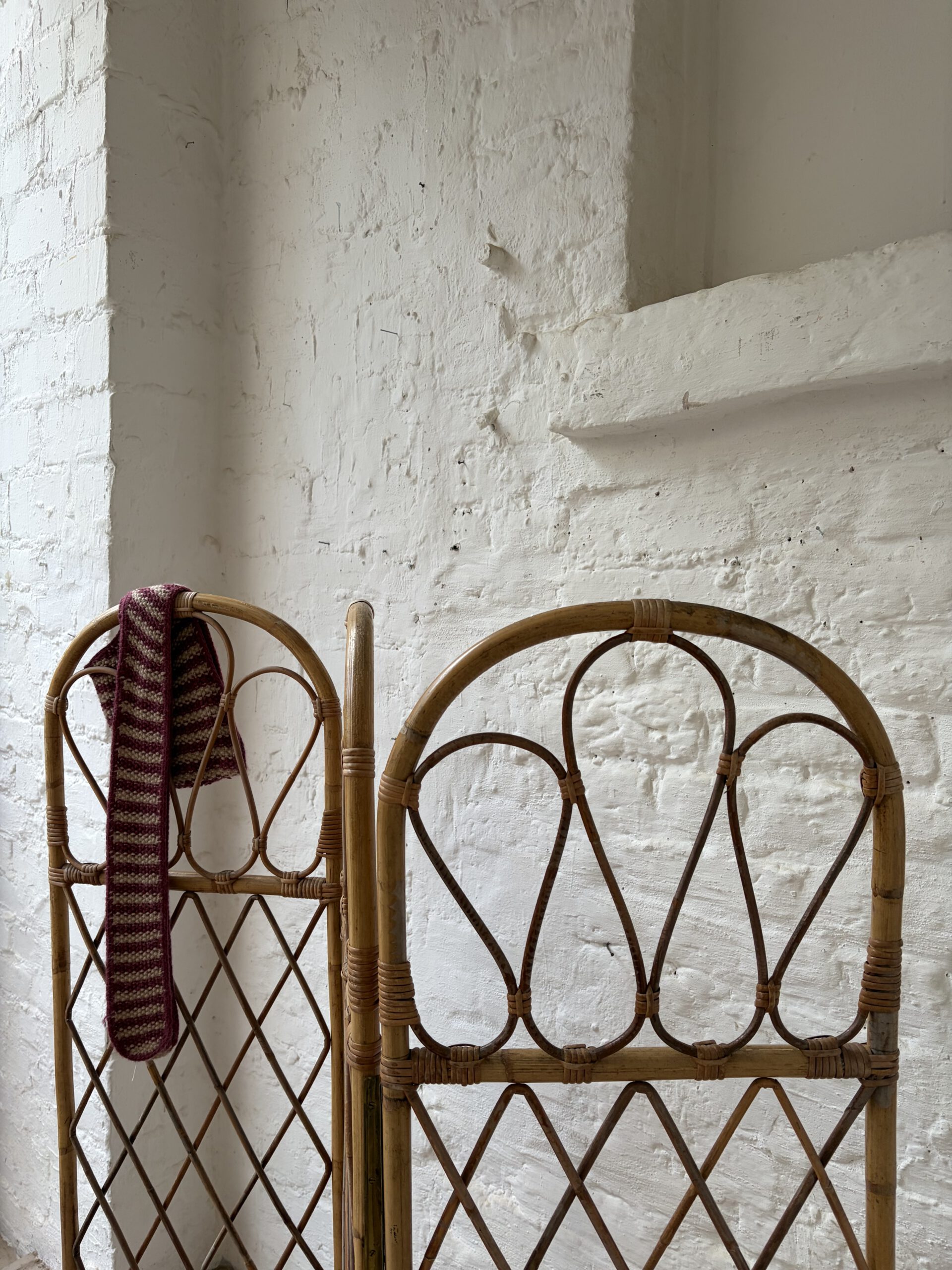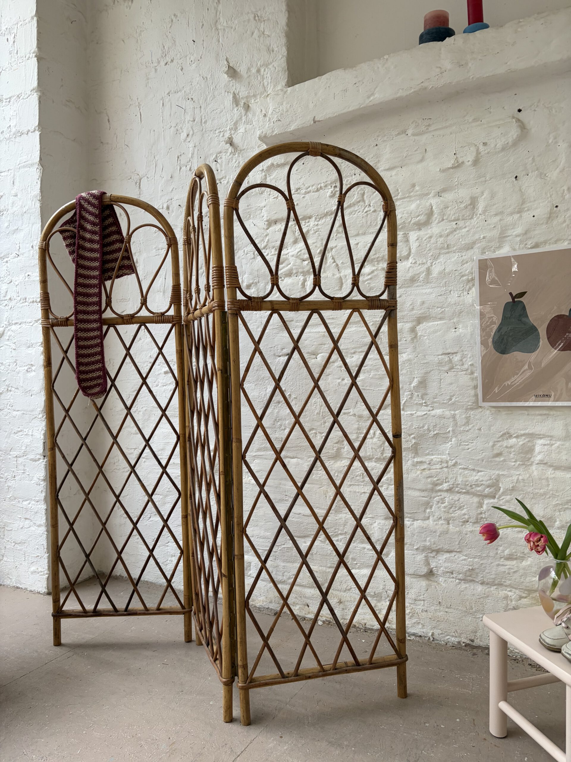 faltbarer Vintage Paravent aus Rattan. Marie stammt aus Frankreich aus den 50/60er Jahren. Sie hat sehr schöne Verzierungen und ist ziemlich gut erhalten. Lediglich ein paar vergrauter patinierter Stellen, die ihren persönlichen Charme ausmachen.