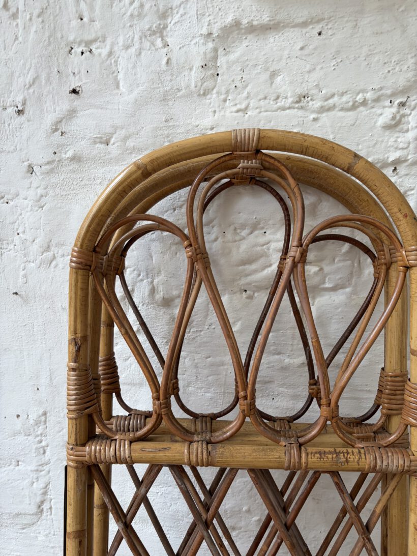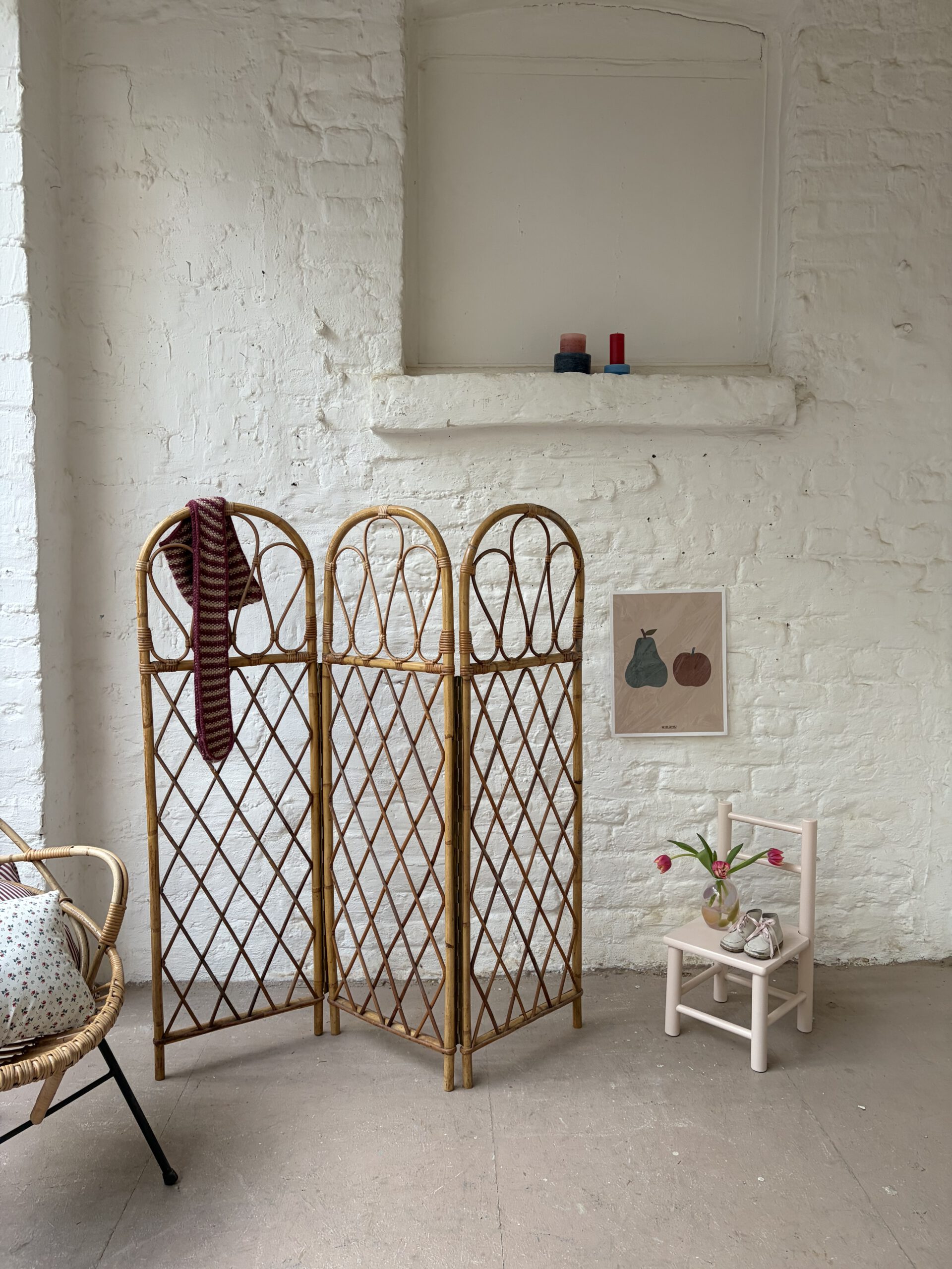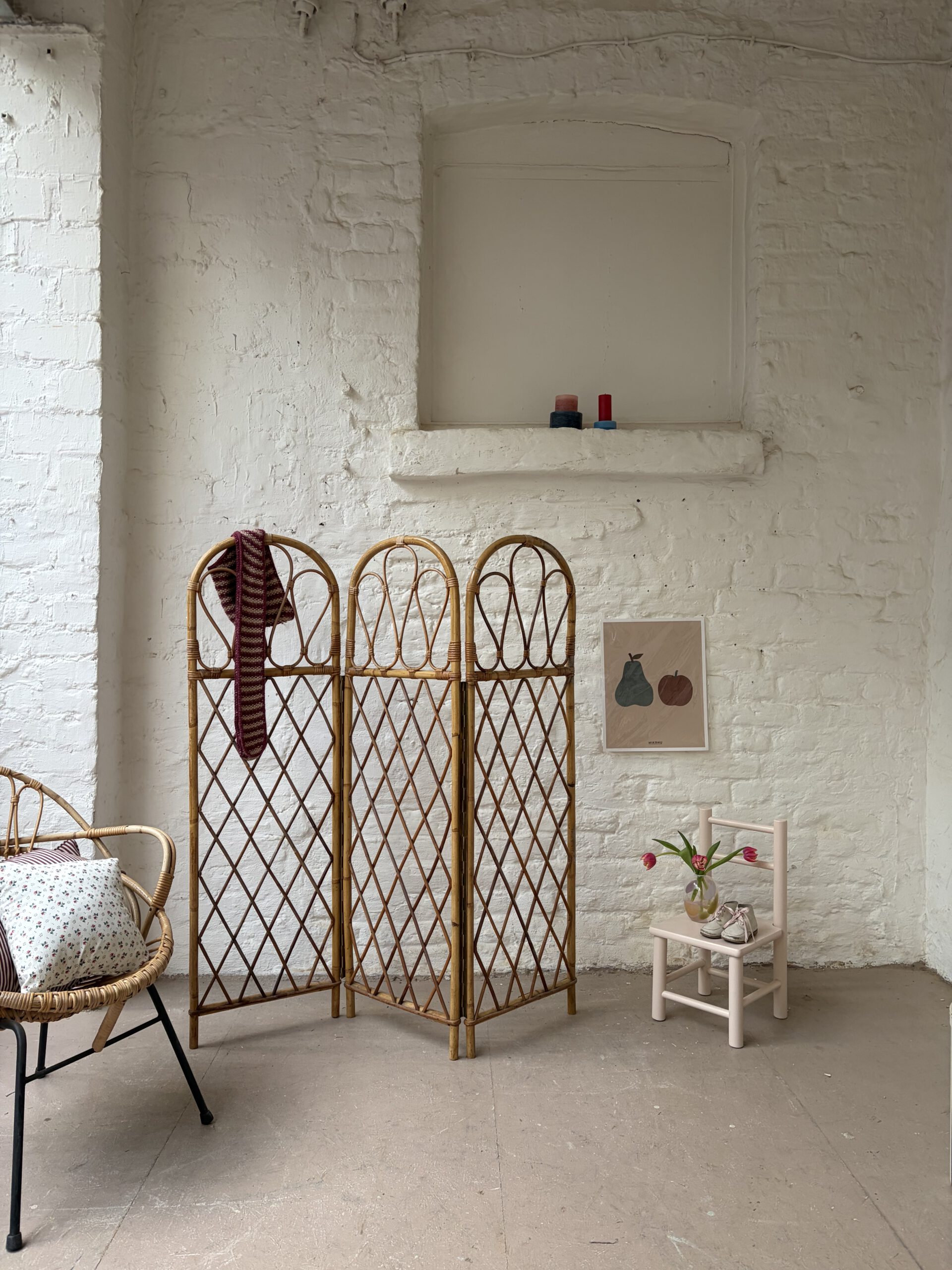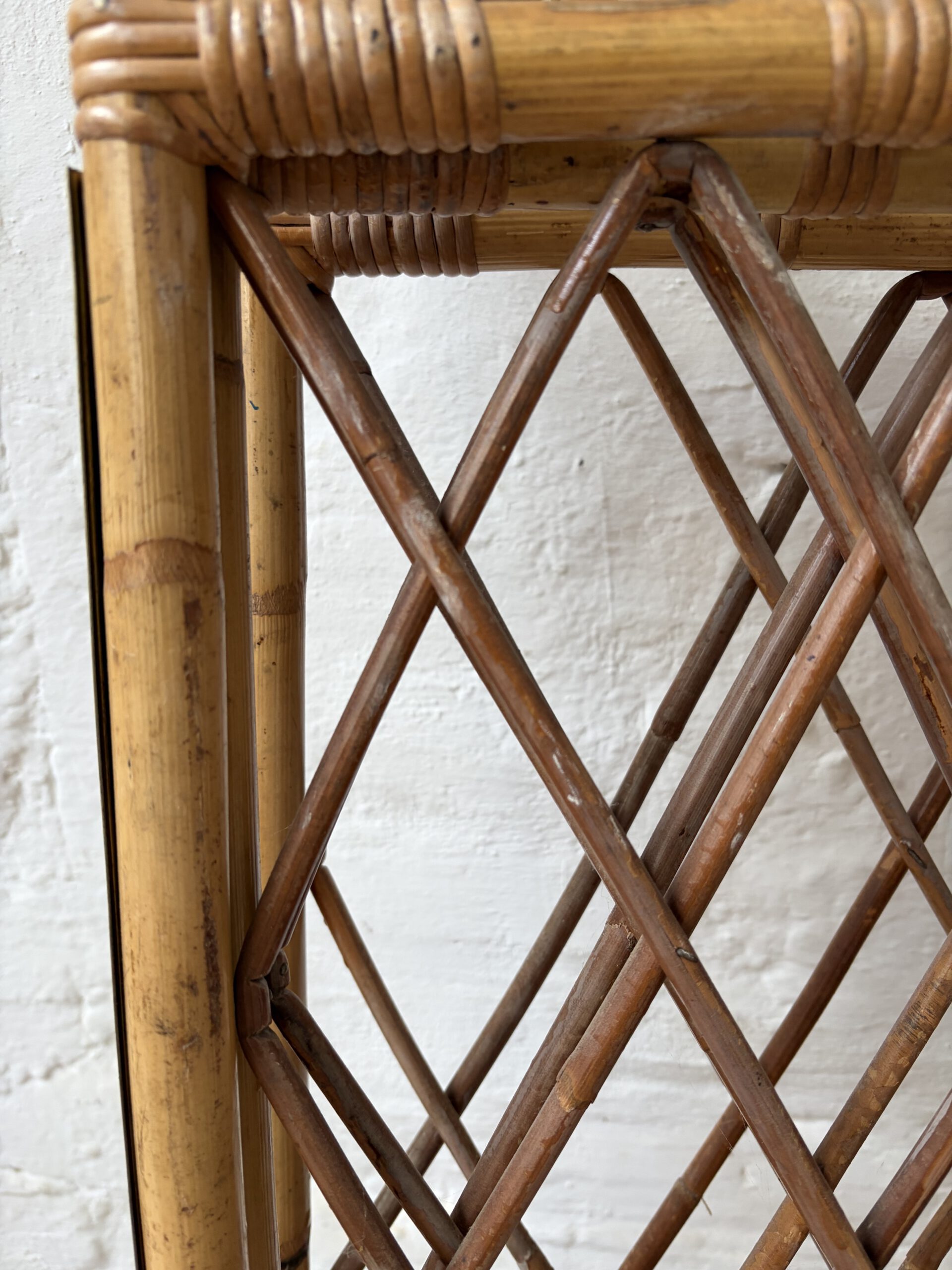 faltbarer Vintage Paravent aus Rattan. Marie stammt aus Frankreich aus den 50/60er Jahren. Sie hat sehr schöne Verzierungen und ist ziemlich gut erhalten. Lediglich ein paar vergrauter patinierter Stellen, die ihren persönlichen Charme ausmachen.