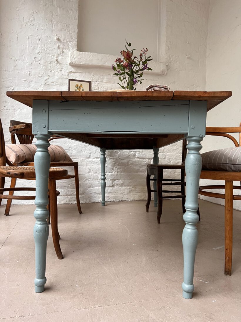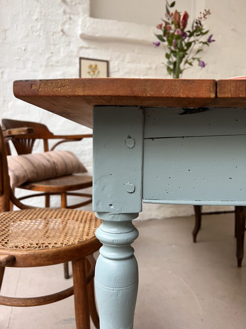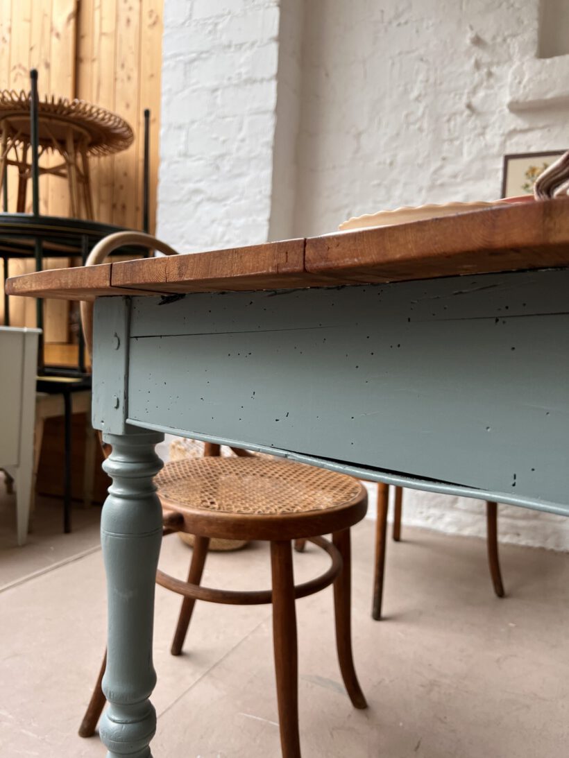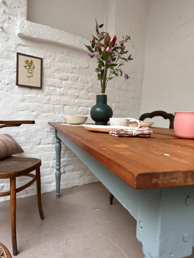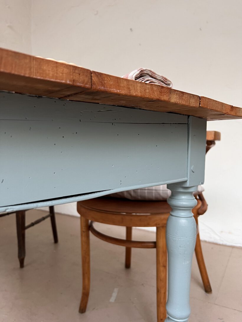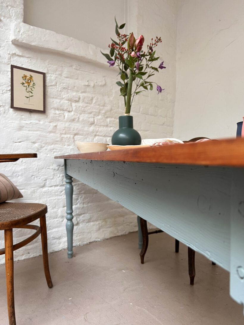 Michelle stammt aus dem Norden Frankreichs. Ich weiß noch ganz genau, wie wir ihn erblickt haben. Es war definitiv Liebe auf den ersten Blick. Der charmante älterer Herr, der ihn uns verkauft hat, hat den Rest an Zauber dazugepackt. Uns war direkt klar: Michelle hat eine unglaublich charmante Vergangenheit, mit sehr vielen schönen Momenten in Gesellschaft. Und genau diese seine Geschichte strahlt aus jeder seiner Maserungen und Zeitspuren (siehe Fotos). Die Tischplatte ist honigfarben und hat eine wunderschöne Patina. Die Beine haben von uns ein mattes graublau von Farrow and Ball bekommen. Die Tischplatte wurde geschliffen und zweimal mit Leinöl versiegelt.