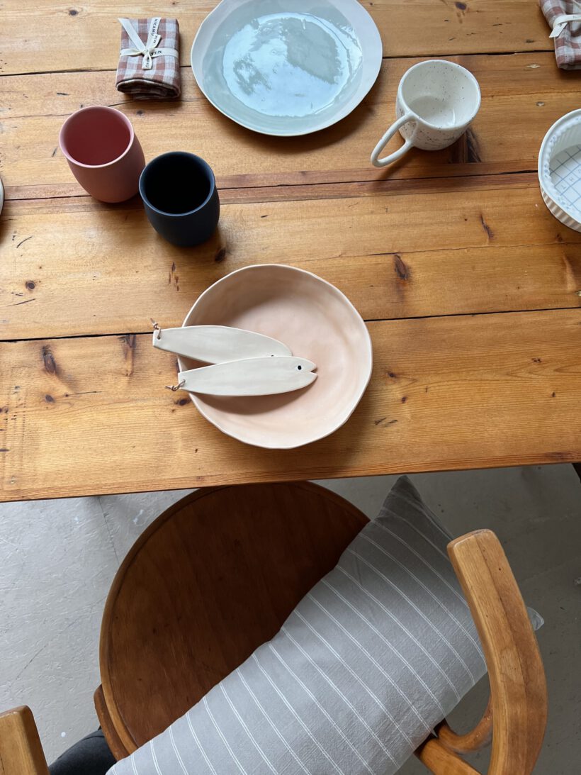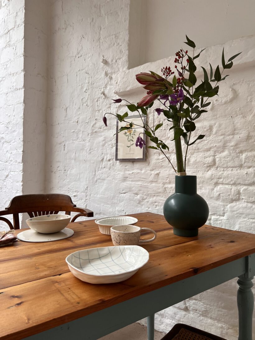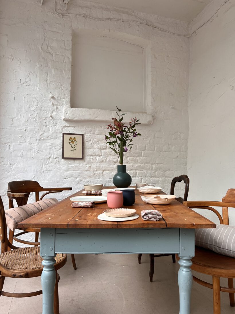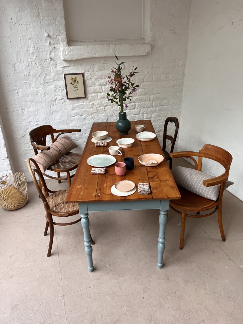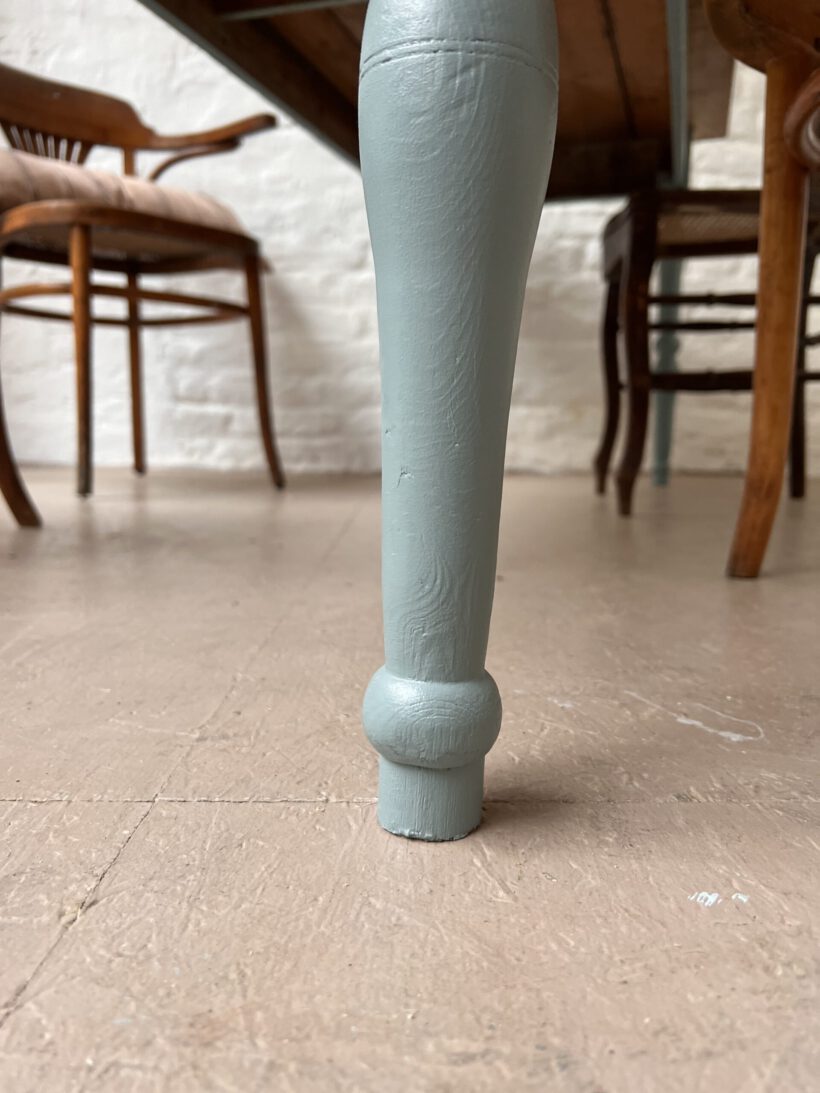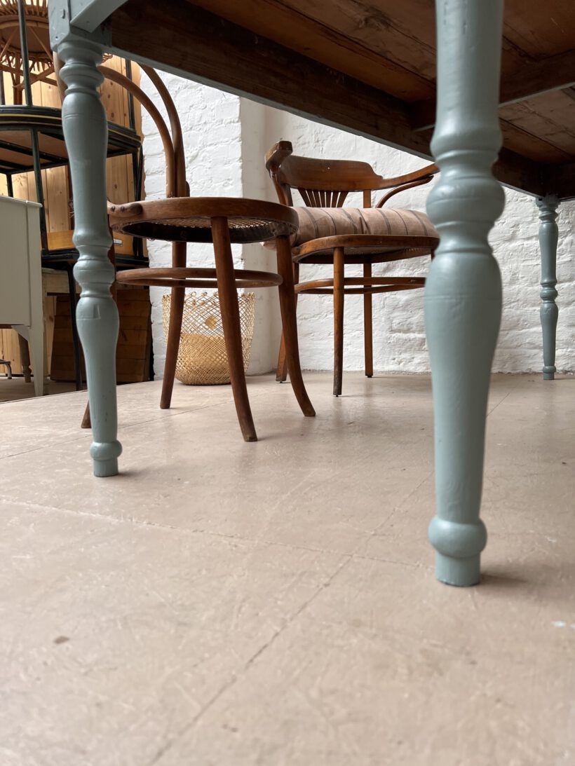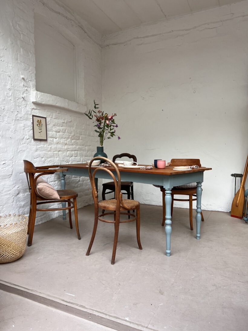 Michelle stammt aus dem Norden Frankreichs. Ich weiß noch ganz genau, wie wir ihn erblickt haben. Es war definitiv Liebe auf den ersten Blick. Der charmante älterer Herr, der ihn uns verkauft hat, hat den Rest an Zauber dazugepackt. Uns war direkt klar: Michelle hat eine unglaublich charmante Vergangenheit, mit sehr vielen schönen Momenten in Gesellschaft. Und genau diese seine Geschichte strahlt aus jeder seiner Maserungen und Zeitspuren (siehe Fotos). Die Tischplatte ist honigfarben und hat eine wunderschöne Patina. Die Beine haben von uns ein mattes graublau von Farrow and Ball bekommen. Die Tischplatte wurde geschliffen und zweimal mit Leinöl versiegelt.