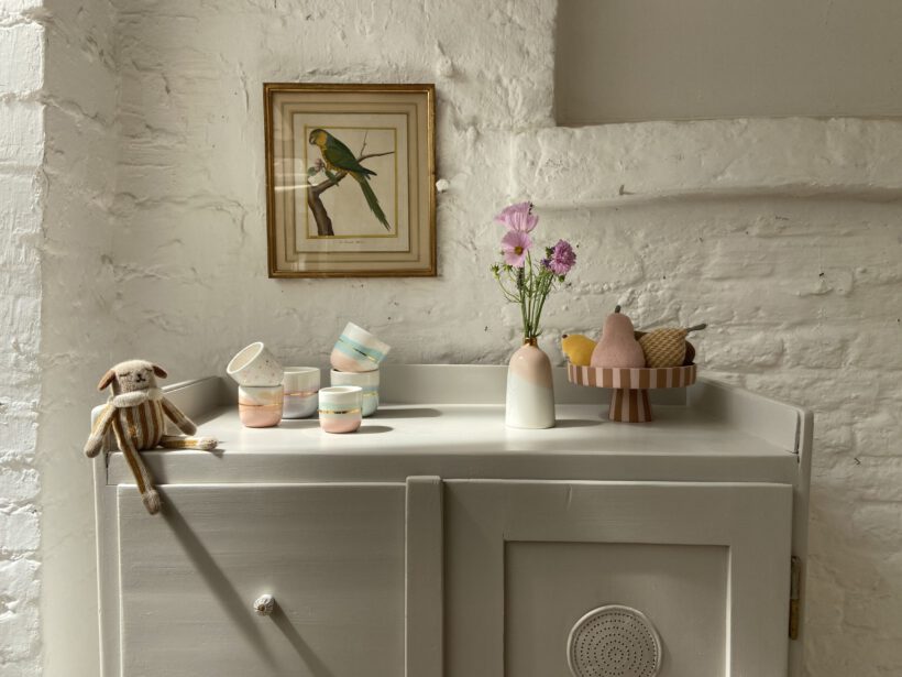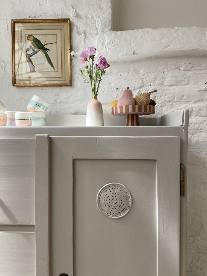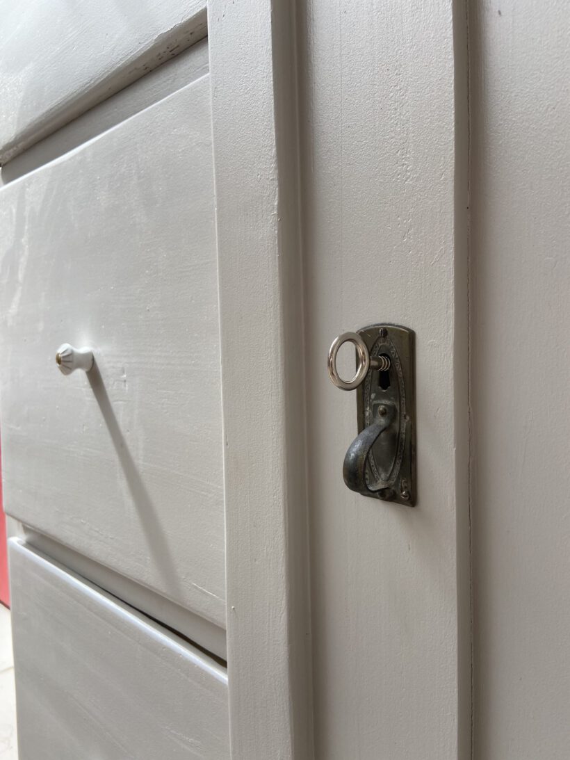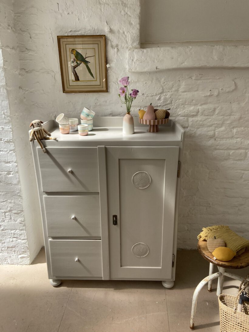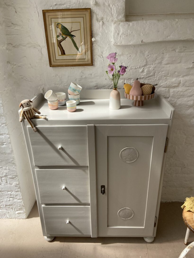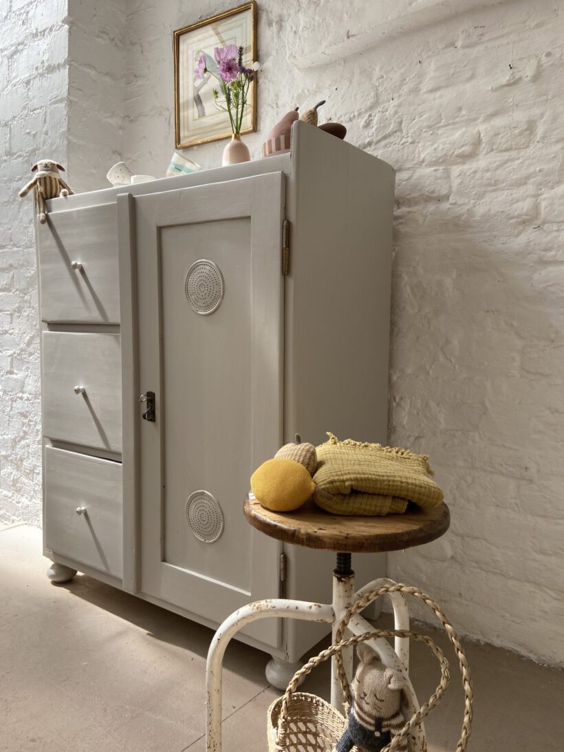 Mijo hat von uns ein warmes Grau von Farrow and Ball bekommen. Er wurde restauriert, geschliffen, grundiert und zwei mal lackiert. Das Holz hat Patina und Altersspuren.