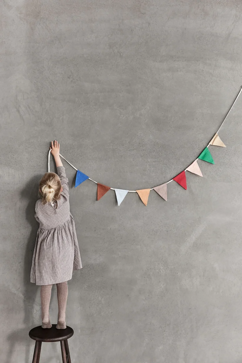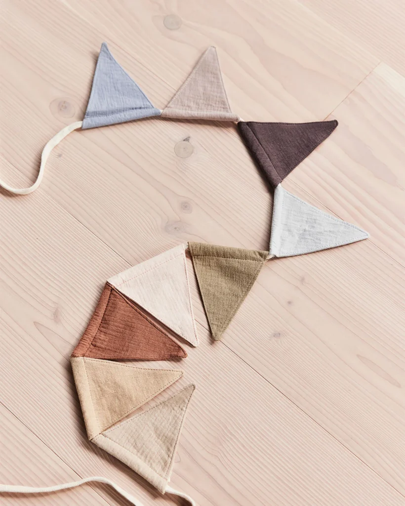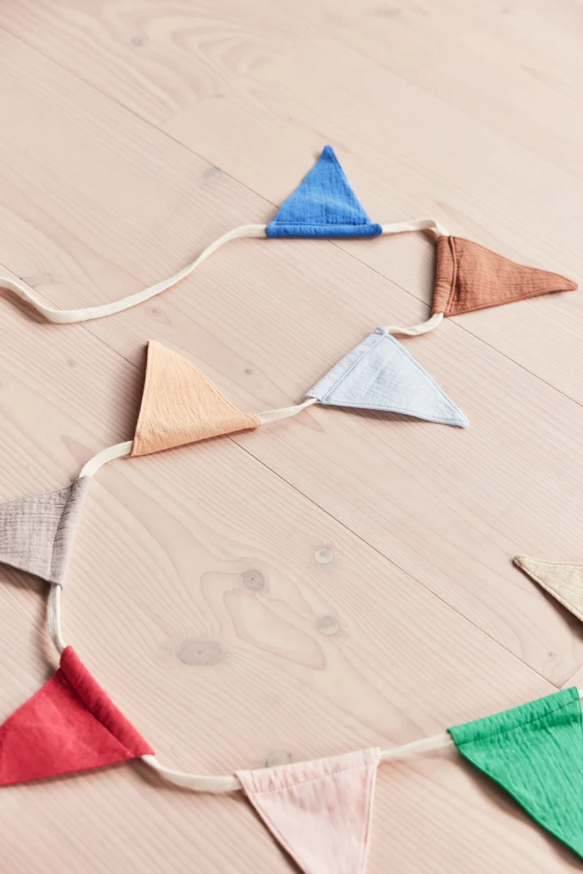 Unsere Festliche Moni Musselin-Girlande besteht aus einer Reihe von Dreiecken aus weichem und leichtem Musselin-Stoff in einer Reihe von verspielten Farben, die mit viel Sorgfalt hergestellt wurden. Jedes Dreieck ist sorgfältig genäht und so gestaltet, dass es beim Aufhängen ein wunderschönes Bild ergibt. Die Kombination aus leuchtenden Farben schafft eine festliche Atmosphäre und eignet sich perfekt für Geburtstage, Babypartys, Feiertage oder andere besondere Anlässe, die zum Feiern einladen.