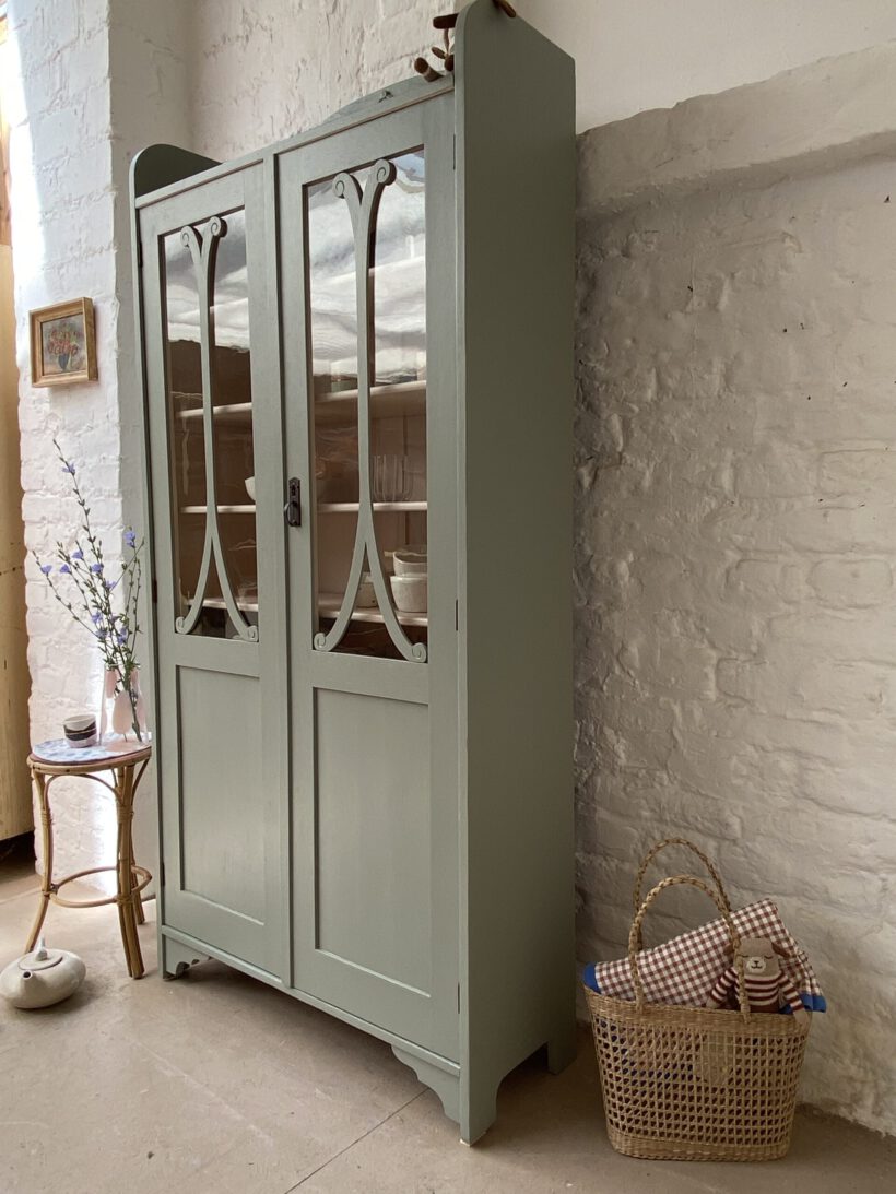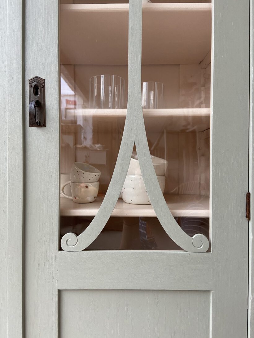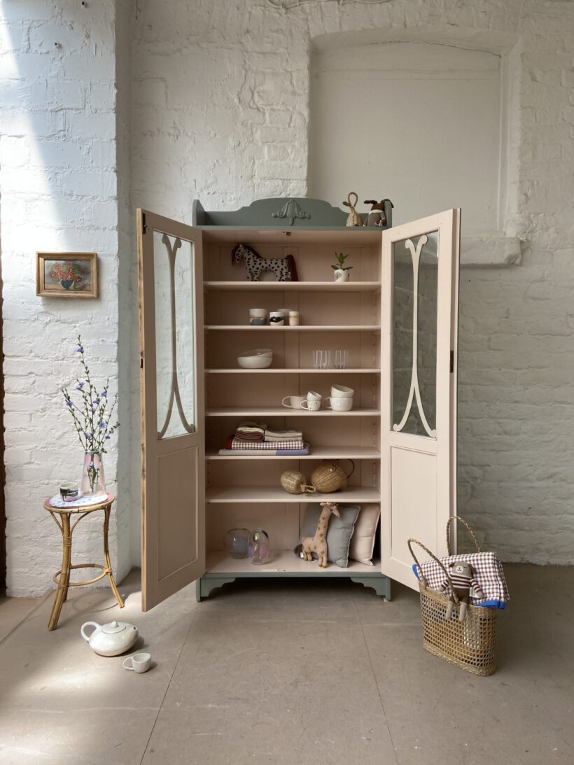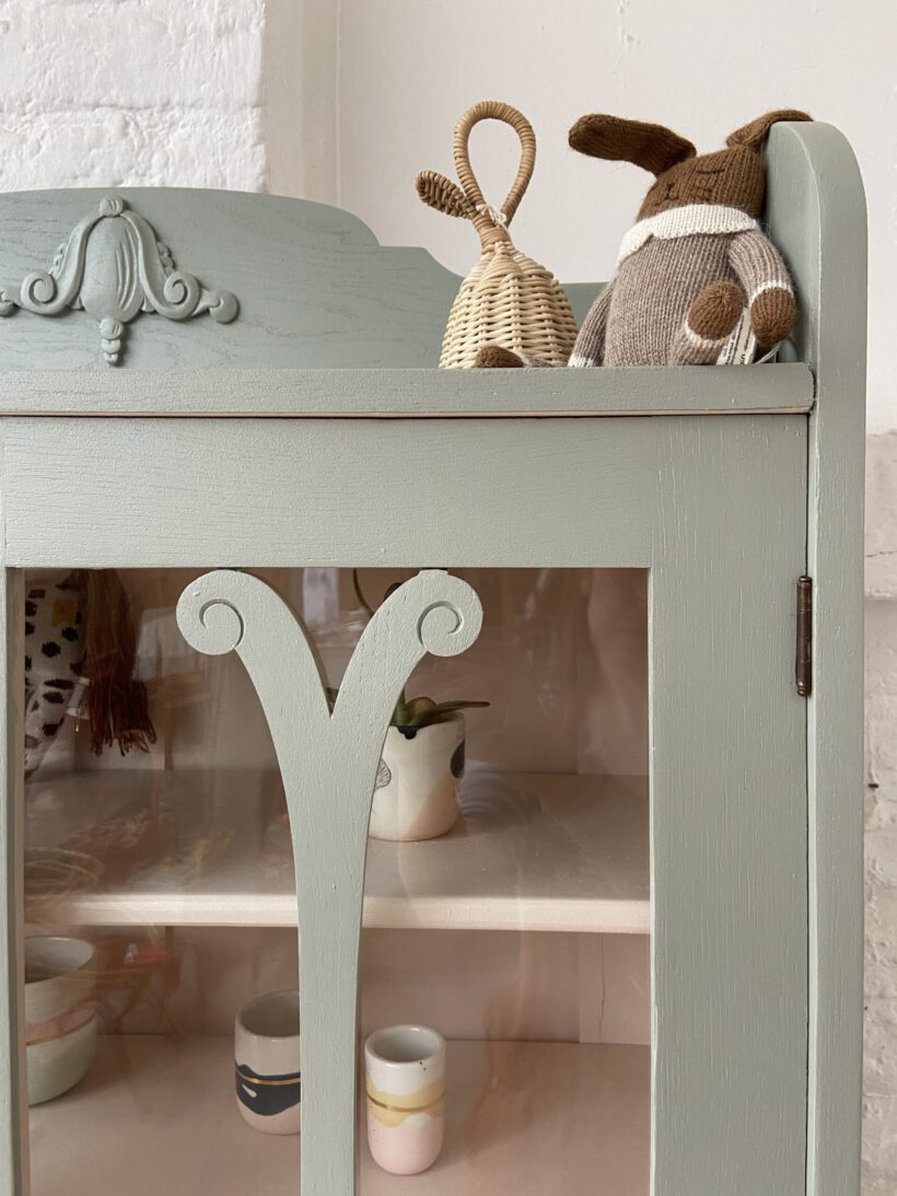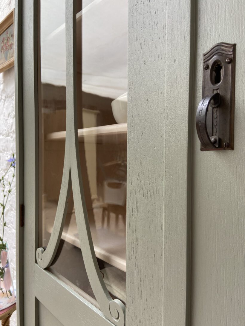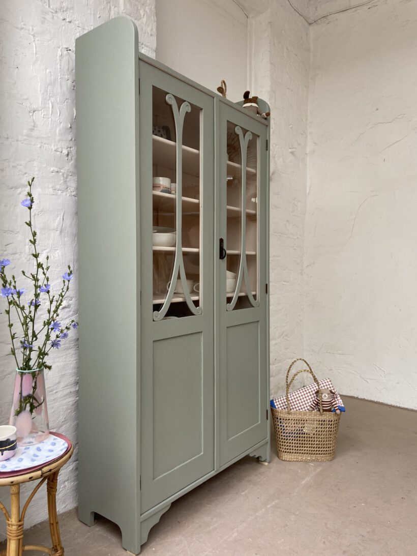 Narcisse hat so ein besonderes und sehr elegantes Design! Die abgerundete Krone mit der Verzierung, der verzierte Sockelbereich und die geschwungenen eingelassenen Bögen innerhalb der Fenster sind ein ganz seltener Anblick. Ihre Maße sind ebenso fantastisch – sie ist nur 31 cm tief und hat unendlich viel Stauraum: die vielen Einlegeböden schenken deinen Lieblingsstücken viel Präsentierfläche und bieten einen schönen Aufbewahrungsort.